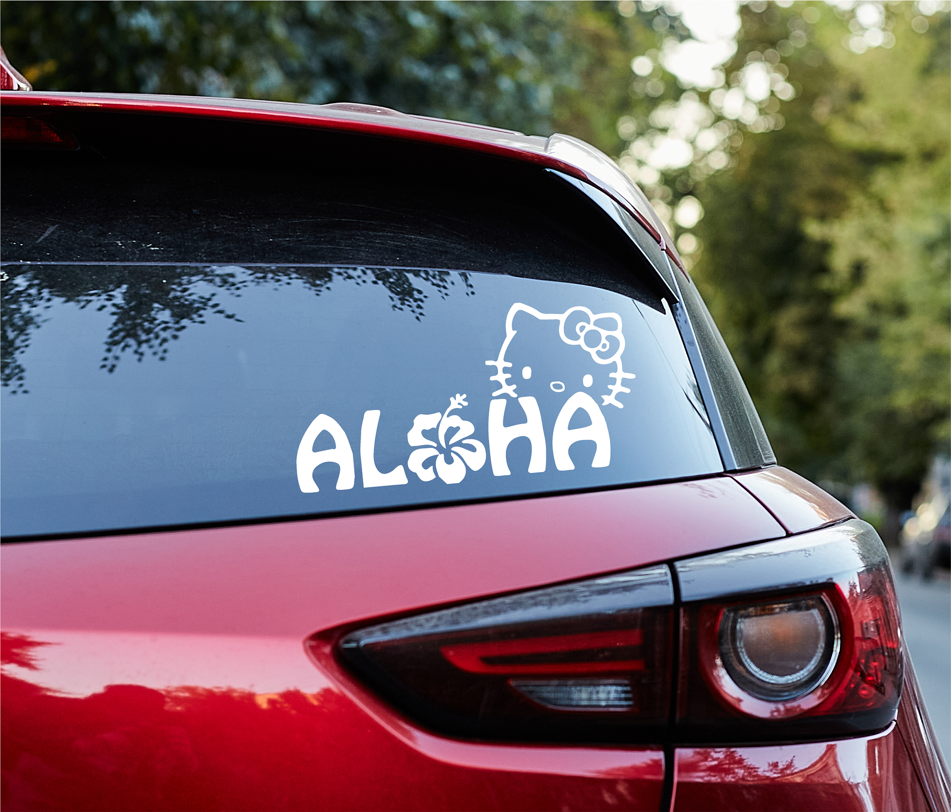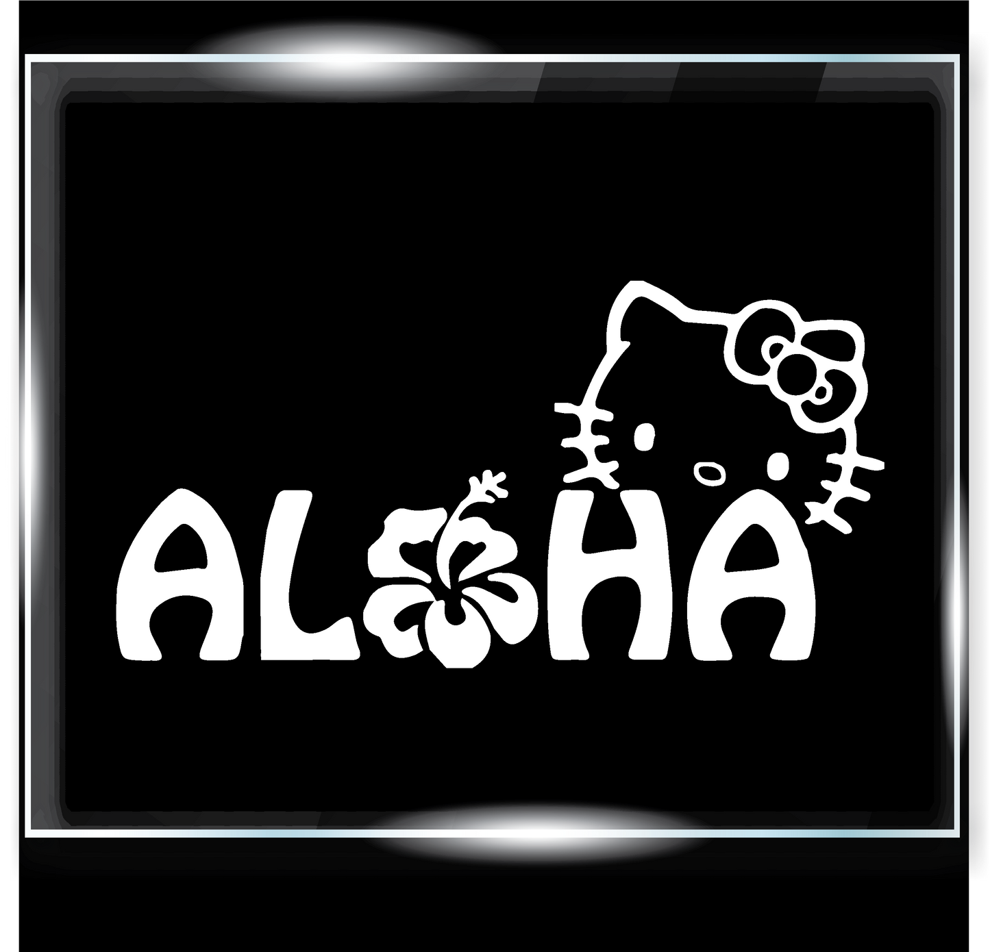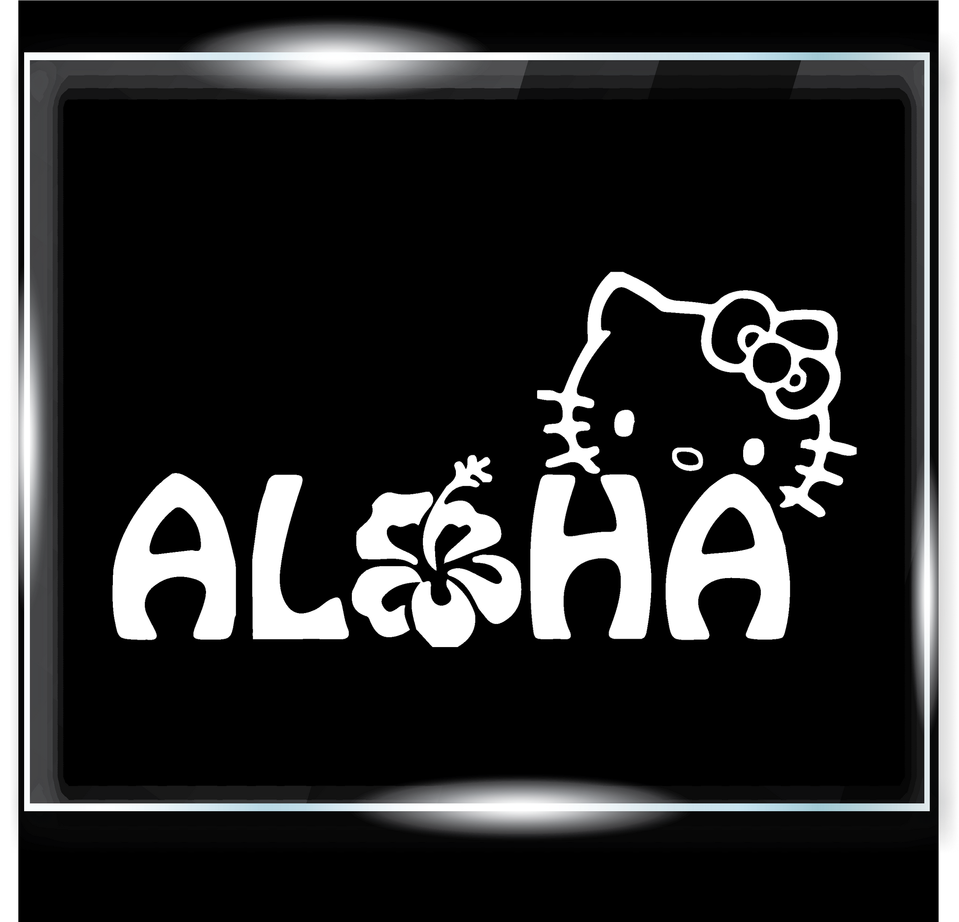 The decal features the word "Aloha," with a beautifully detailed hibiscus flower replacing the letter "O." Overlapping the top part of "Aloha," there's a charming Hello Kitty face, adding a whimsical and playful touch to the design. The combination of the iconic Hello Kitty character with the tropical hibiscus flower creates a delightful fusion of popular culture and Hawaiian aesthetics.