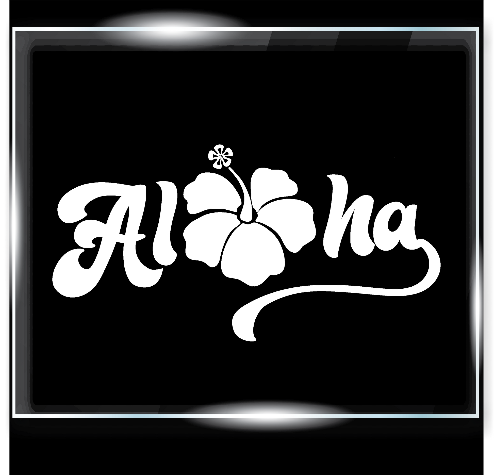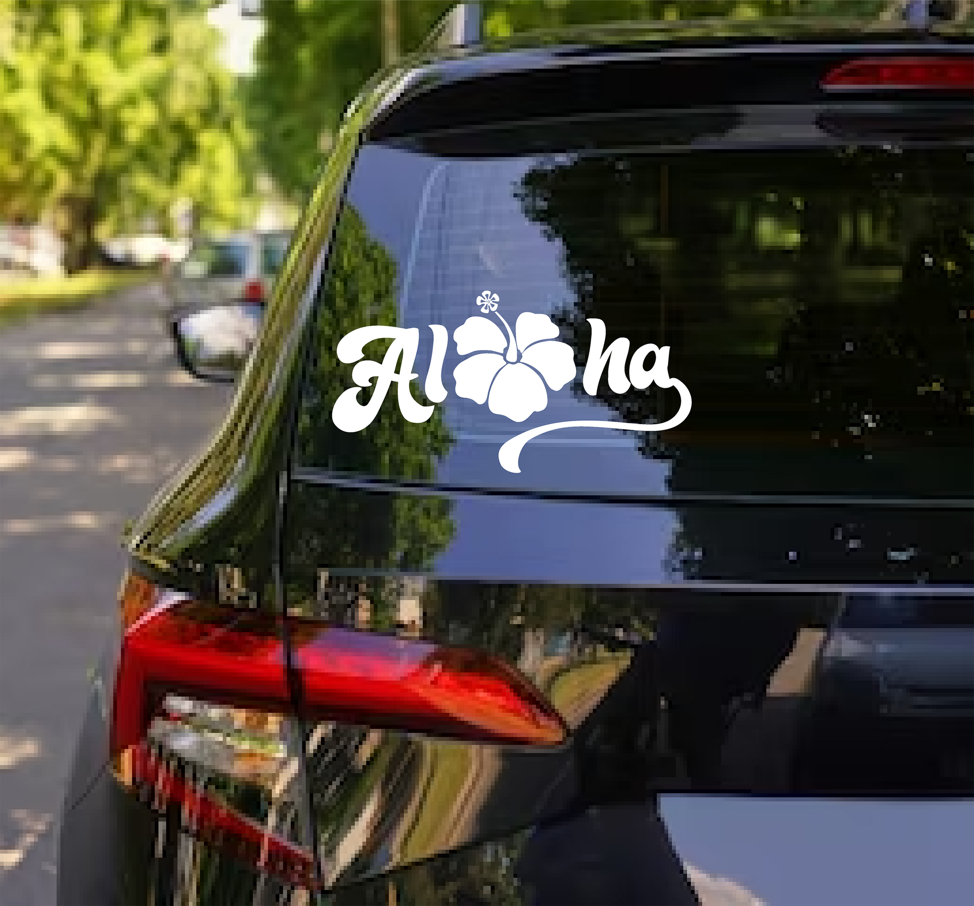 The car decal features the word "Aloha," artistically designed with the letter "O" replaced by a beautifully detailed hibiscus flower. This tropical touch adds a vibrant, summery feel to the decal. The remaining letters are in a flowing, relaxed font, capturing the spirit of Hawaiian hospitality and warmth.