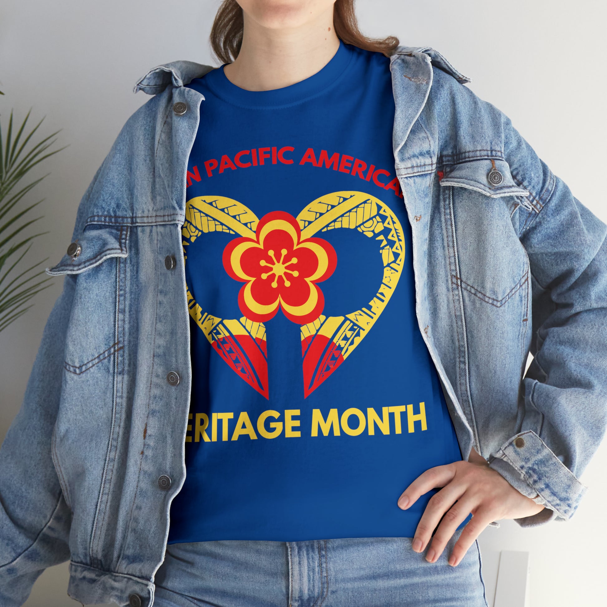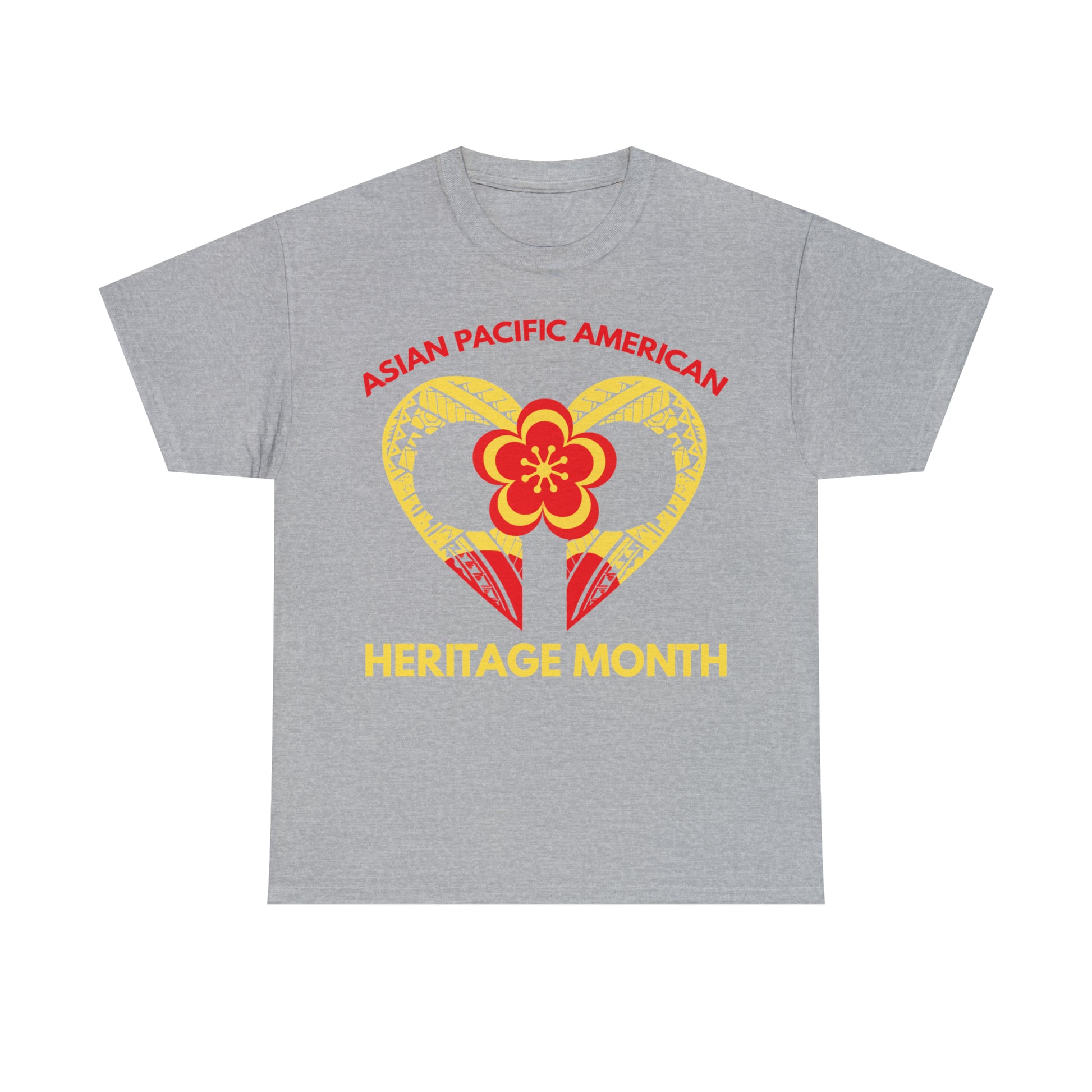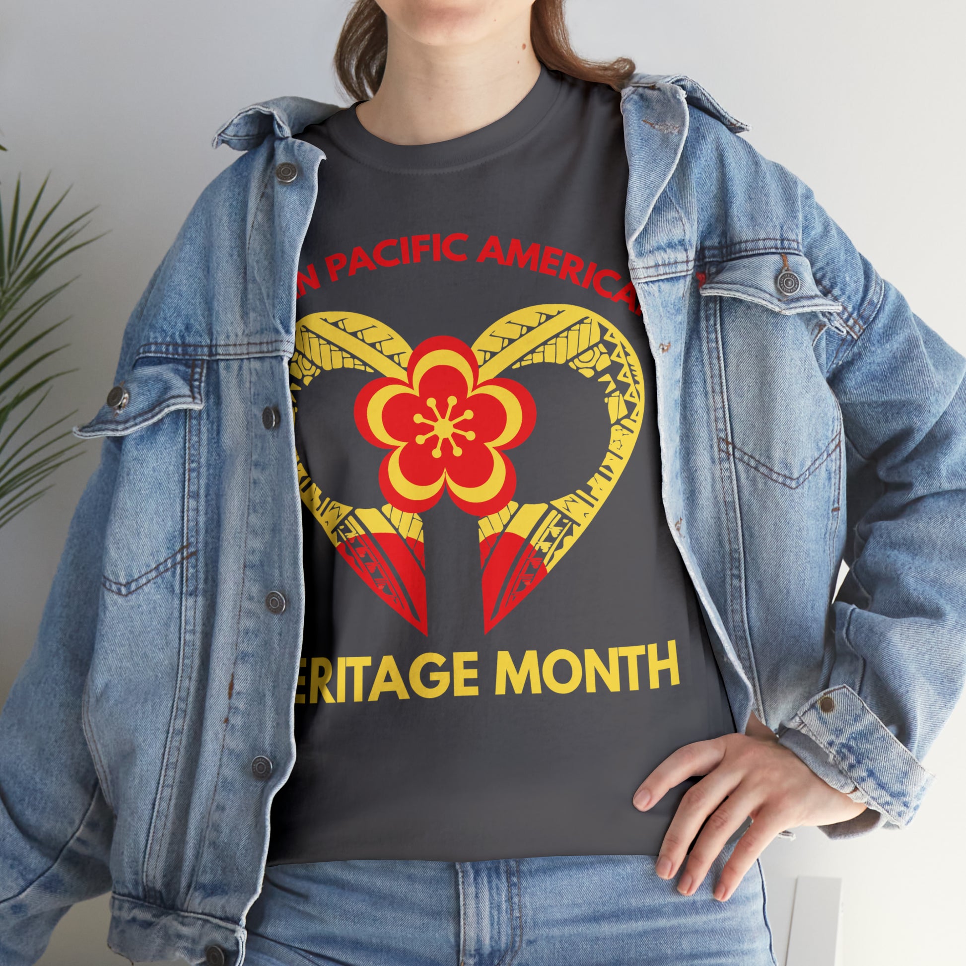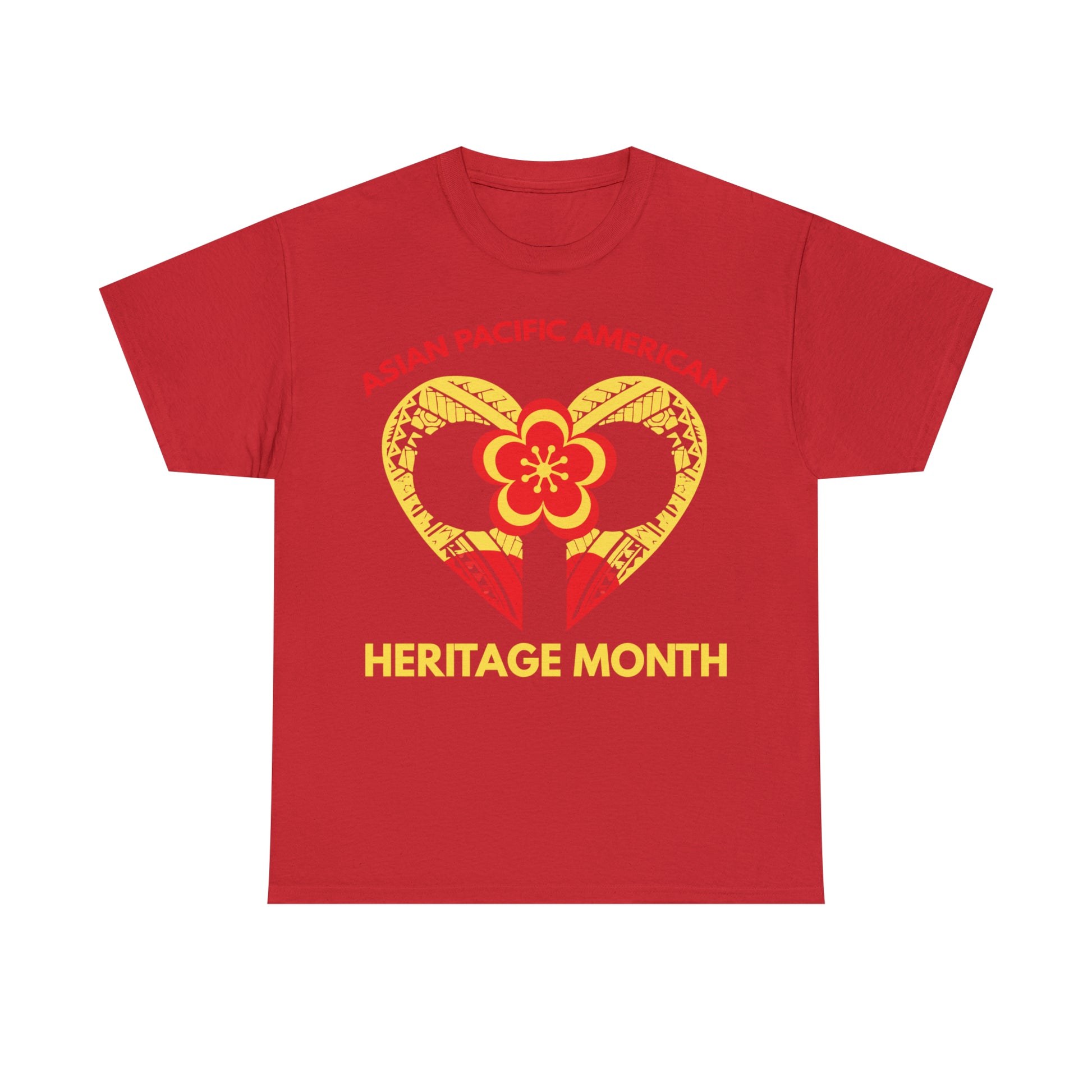 This Asian Pacific American Heritage month t-shirt beautifully blends tradition and modernity. A tribal heart intertwines with a delicate cherry blossom, symbolizing the fusion of cultural heritage and unity. The design's rich detail and symbolic motifs create a striking tribute to diversity and Asian Pacific American legacy.