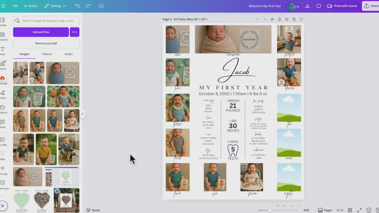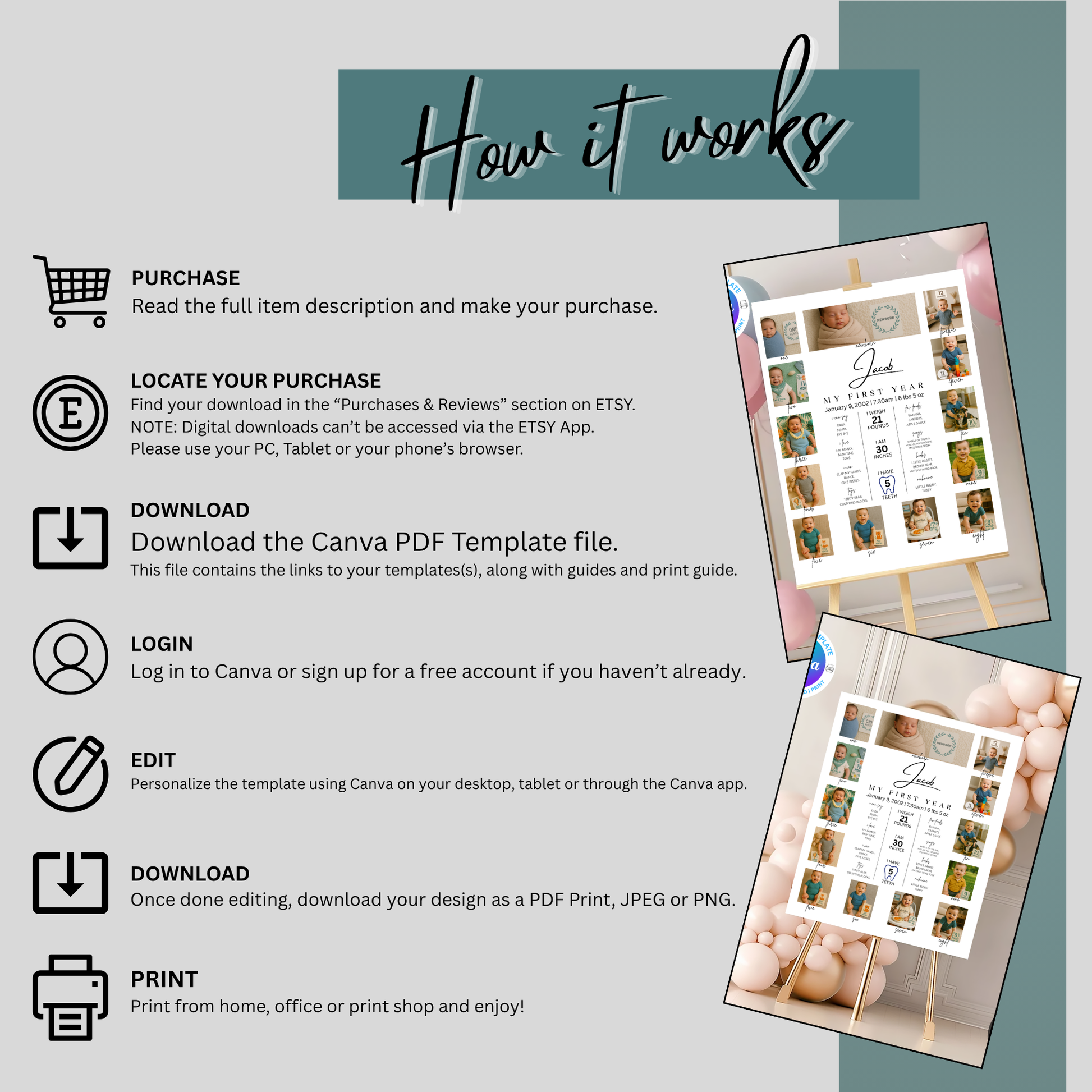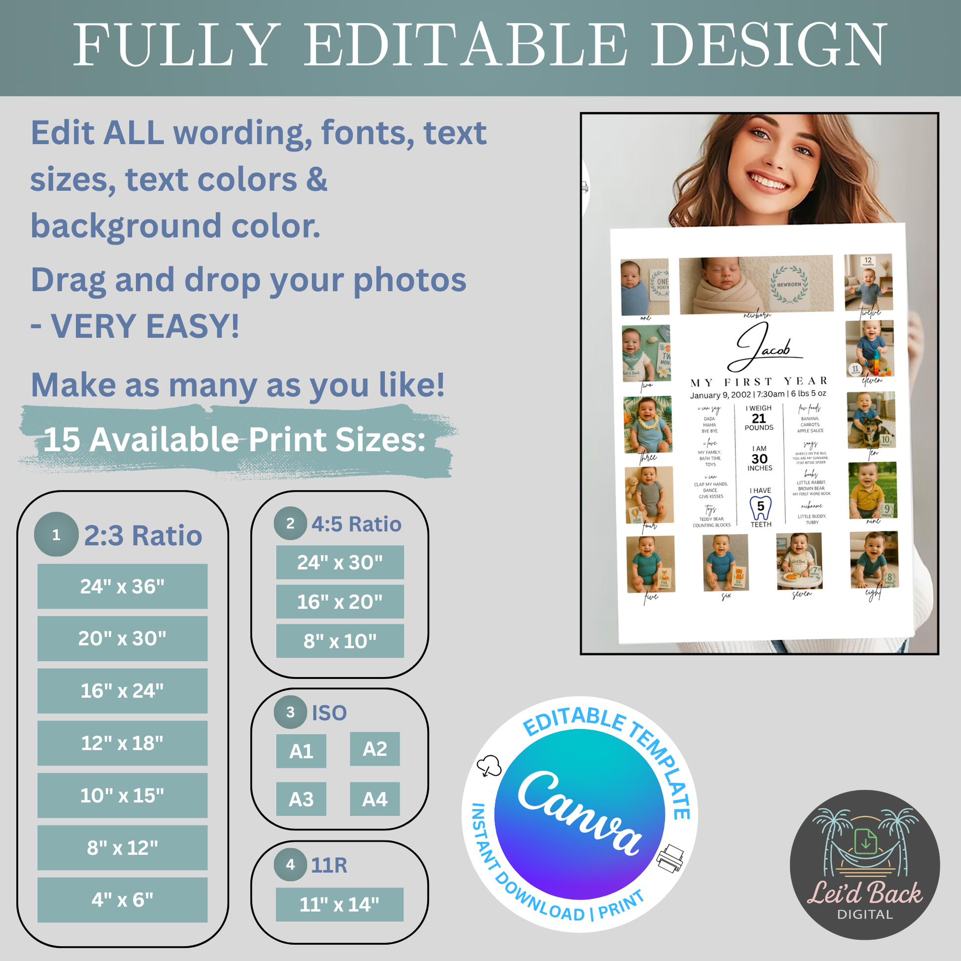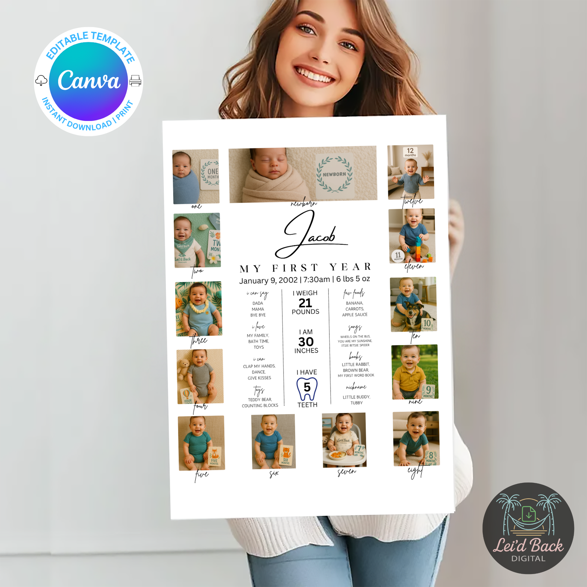Editable Baby First Year Photo Collage | Monthly Milestone Canva Download | 12 Photo Poster for Baby’s 1st Birthday | Instant Digital Print