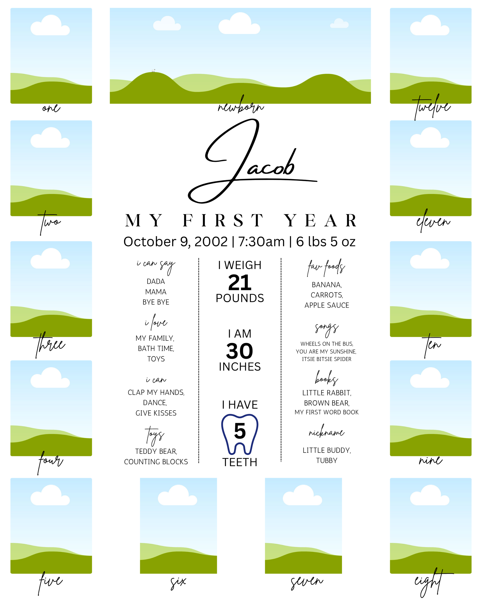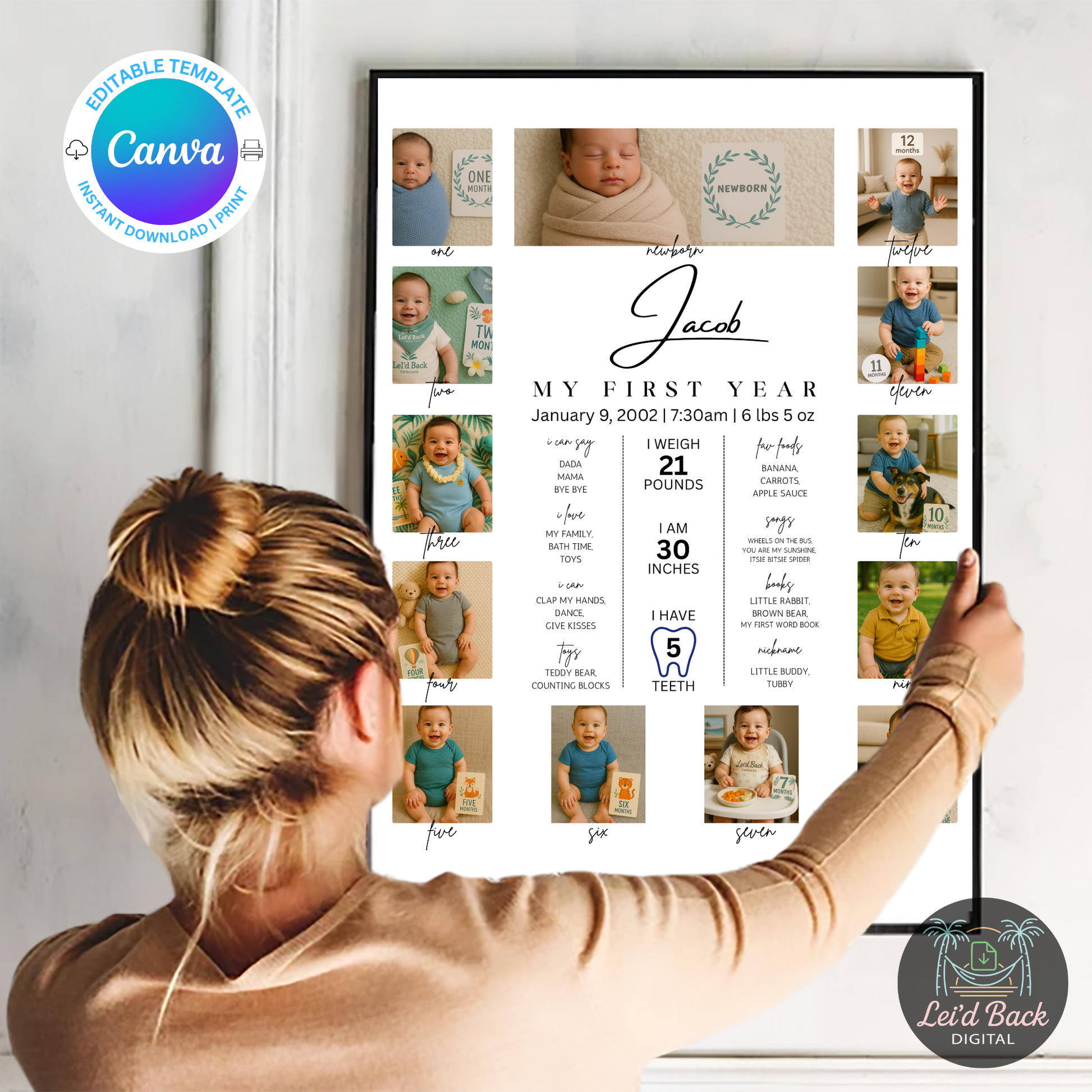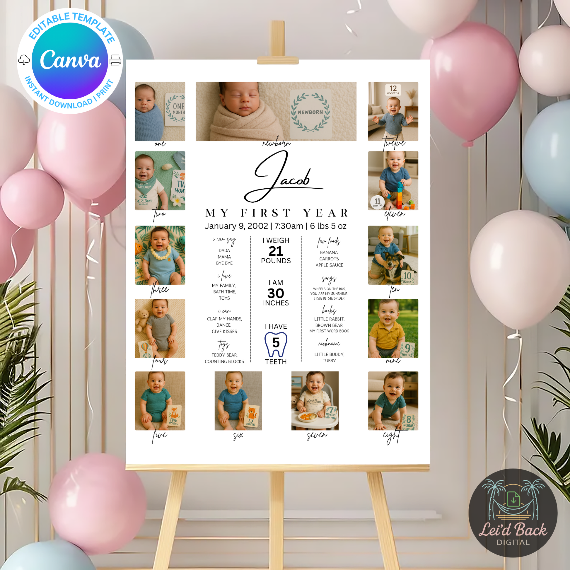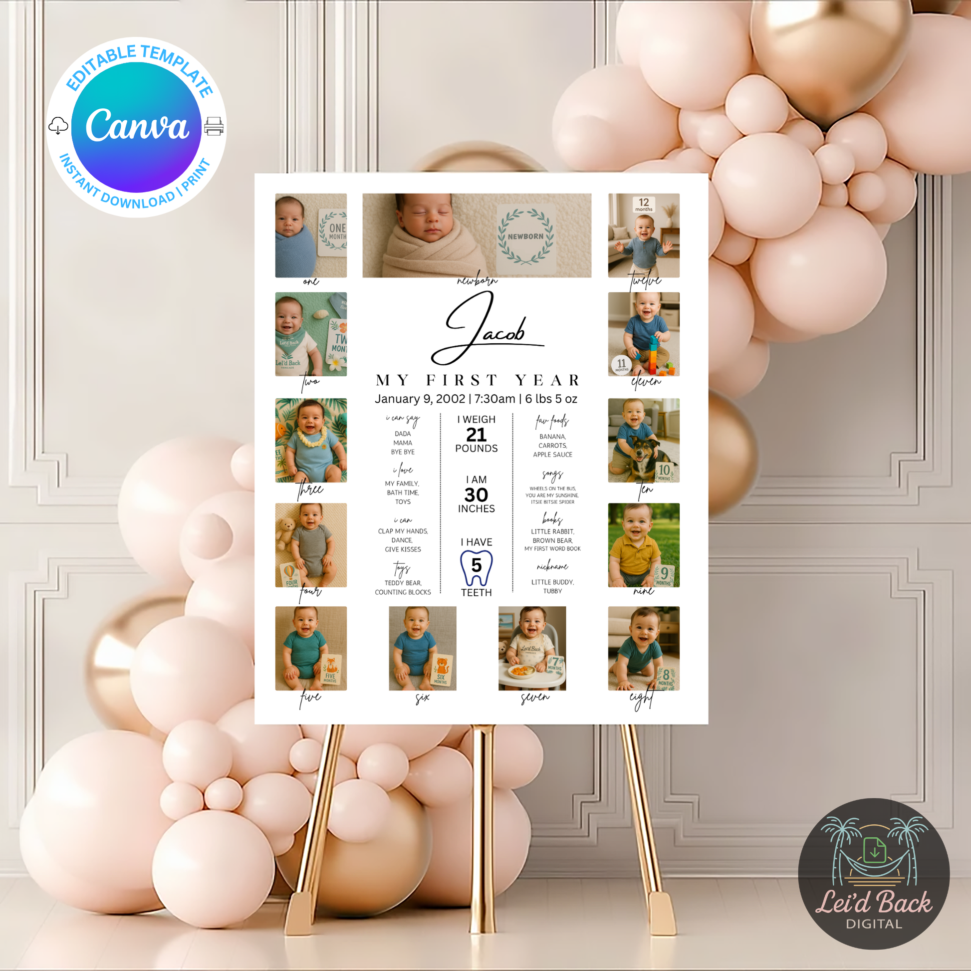 Celebrate your baby's growth with this editable Baby First Year Photo Collage Canva Template, a beautifully designed digital download perfect for capturing monthly milestones and memories from newborn to 12 months. Easily customized in Canva for free, this baby milestone photo board is ideal for 1st birthday decor, nursery keepsakes, or baby shower gifts. Add your baby’s name, birth stats, and monthly photos to create a personalized and meaningful baby's first year poster. Print at home or your local print shop for a lasting memory you'll treasure forever. Instant download available for quick and easy access.