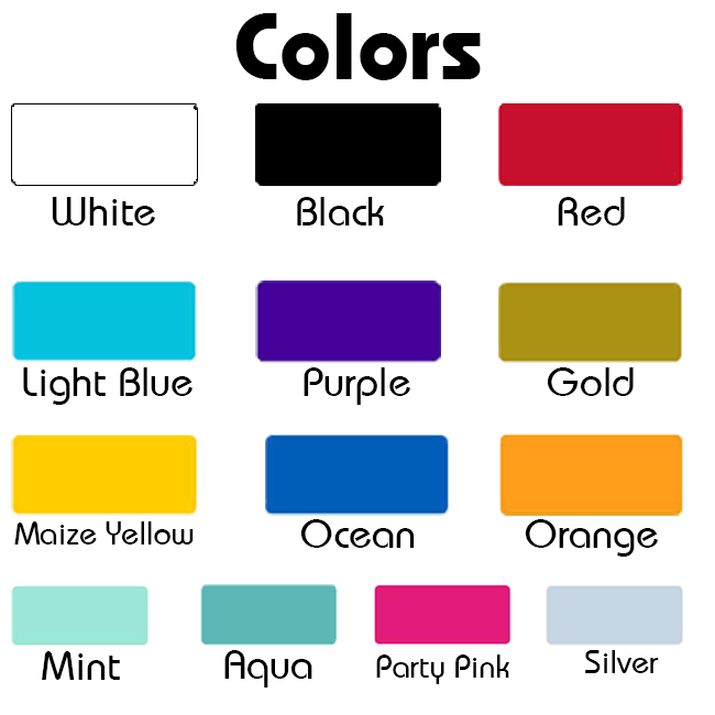 We have a wide variety of sizes, the size is in inches (measured by the longest side, other side will be proportional). Measure the area you want to apply your decal to find the perfect size. For darker surfaces, like tinted windows, dark colors may not show up as well so please take that into consideration when choosing your color. Colors on color chart may vary depending on your monitor settings, they may not appear exactly as you see them on your monitor. Our decals are made from the highest quality glossy outdoor vinyl