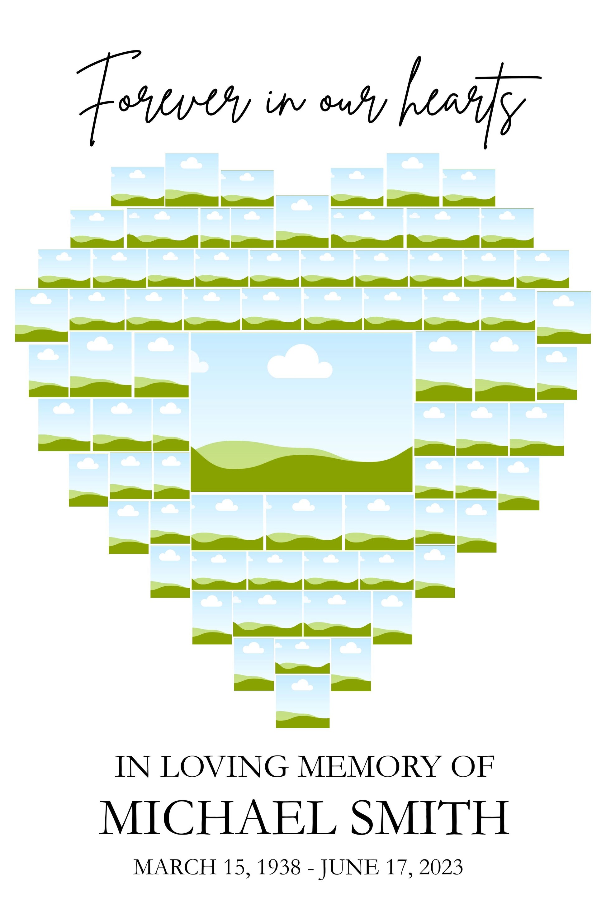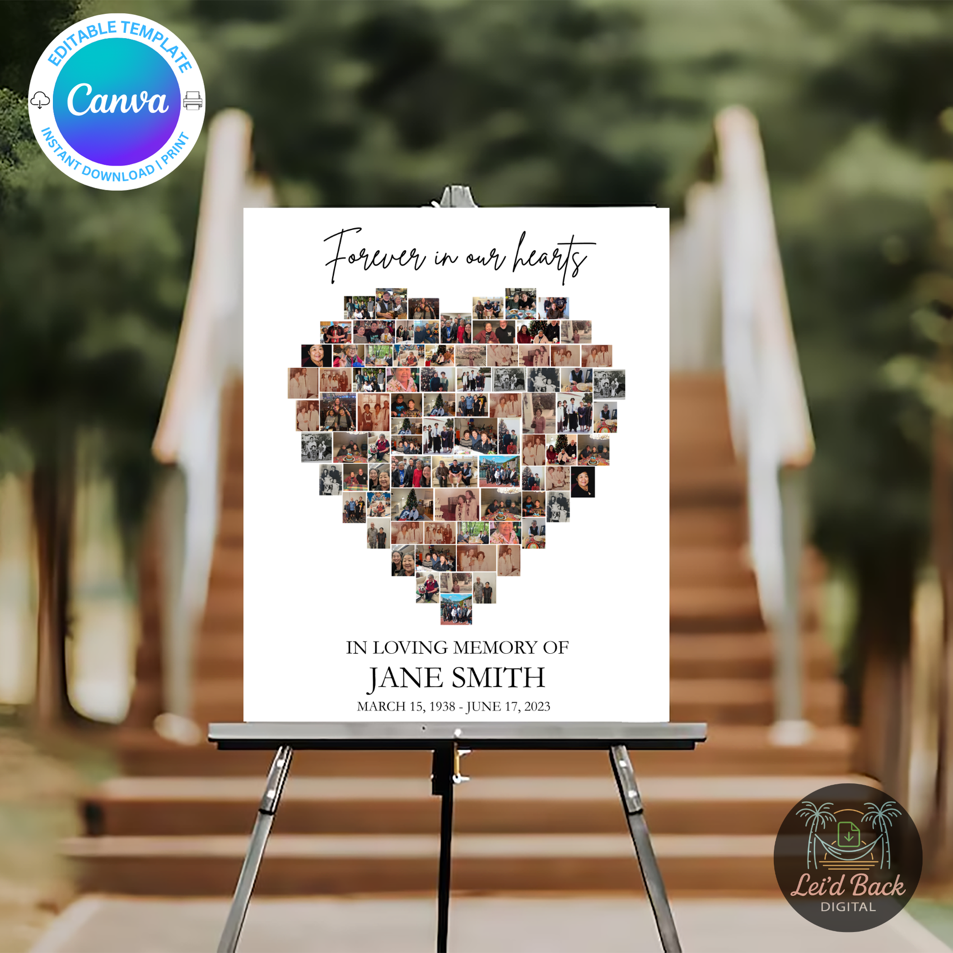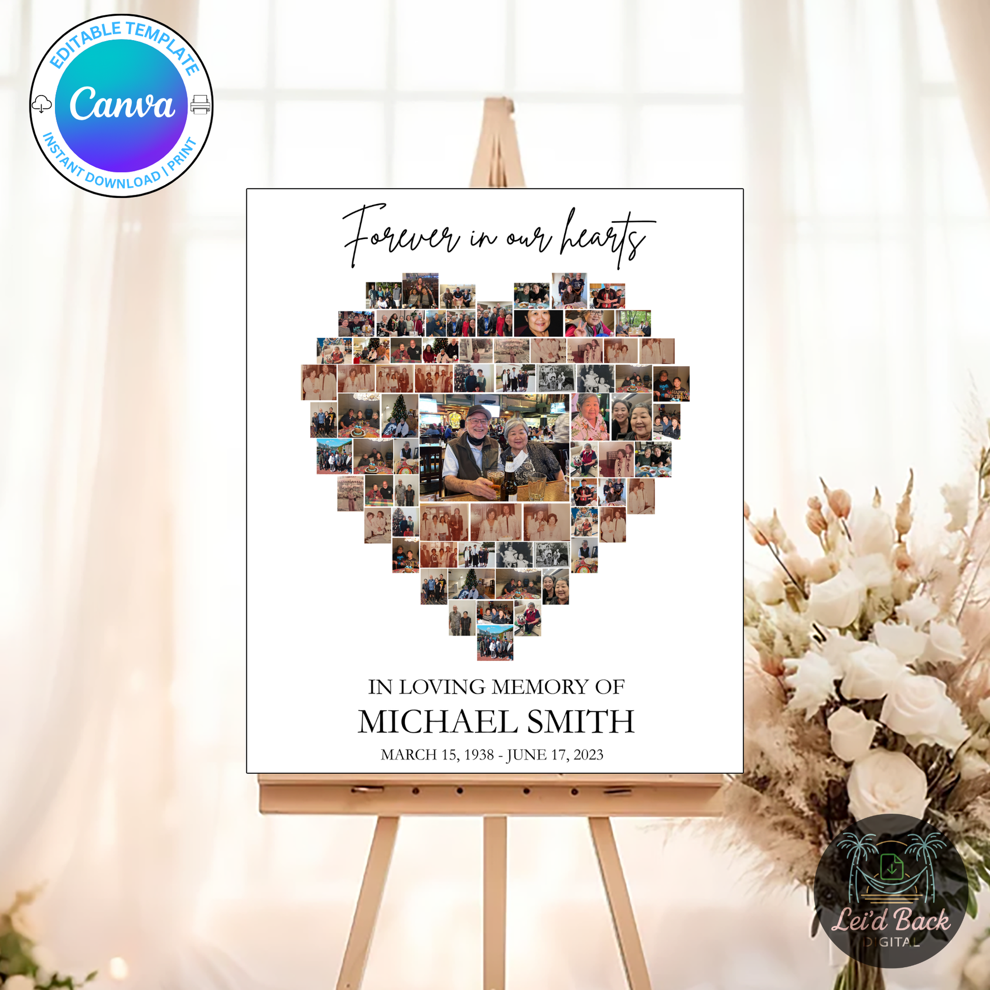 Honor your loved one with this beautifully designed Heart-Shaped Funeral Photo Collage Template, featuring space for up to 85 cherished photos. Instantly downloadable and fully editable in Canva for free, this digital template allows you to customize names, dates, and images with ease—no design skills needed. Perfect for a celebration of life, memorial service, or funeral display, this heartfelt tribute prints beautifully in up to 15 different sizes and serves as a touching reminder of a life well lived.