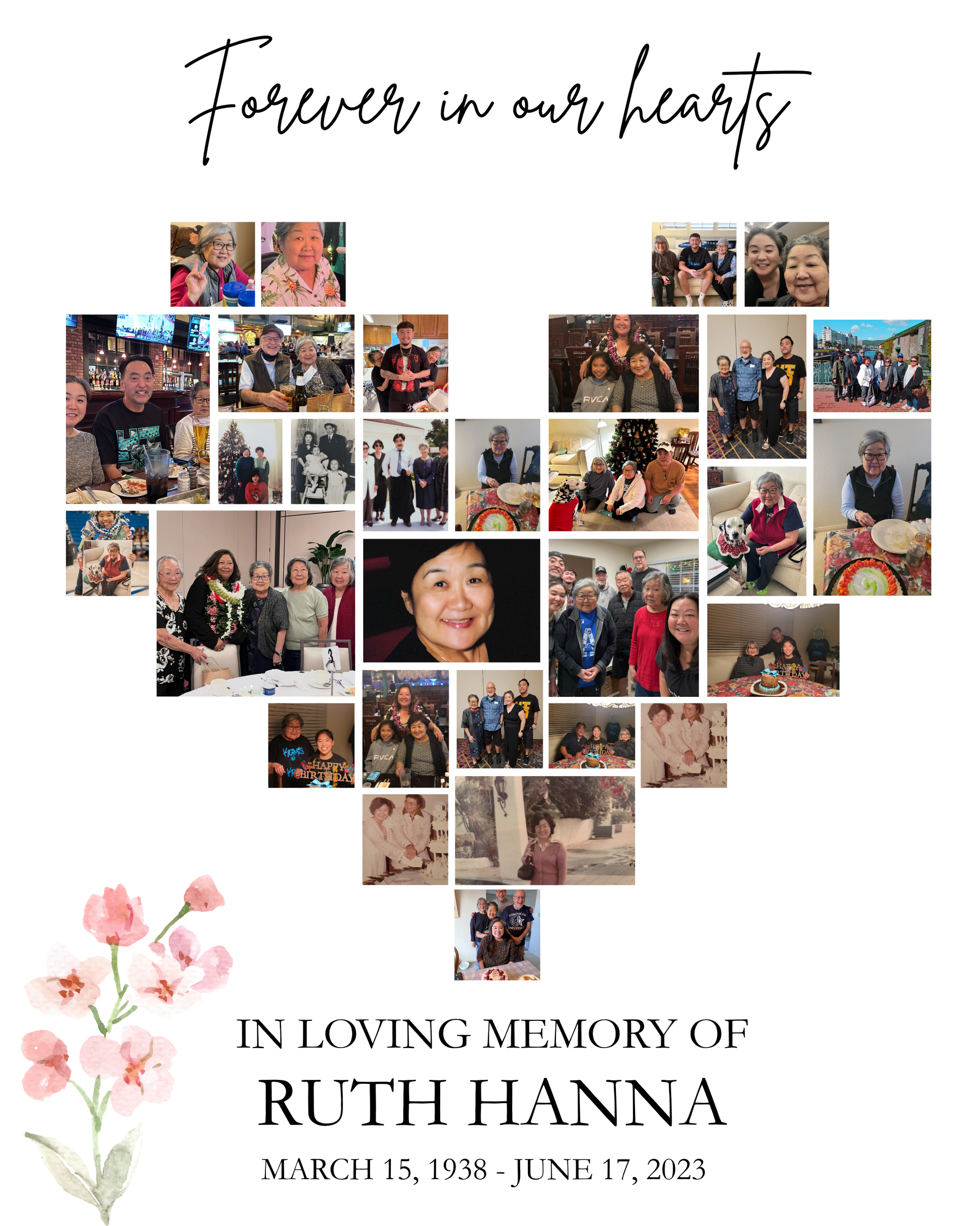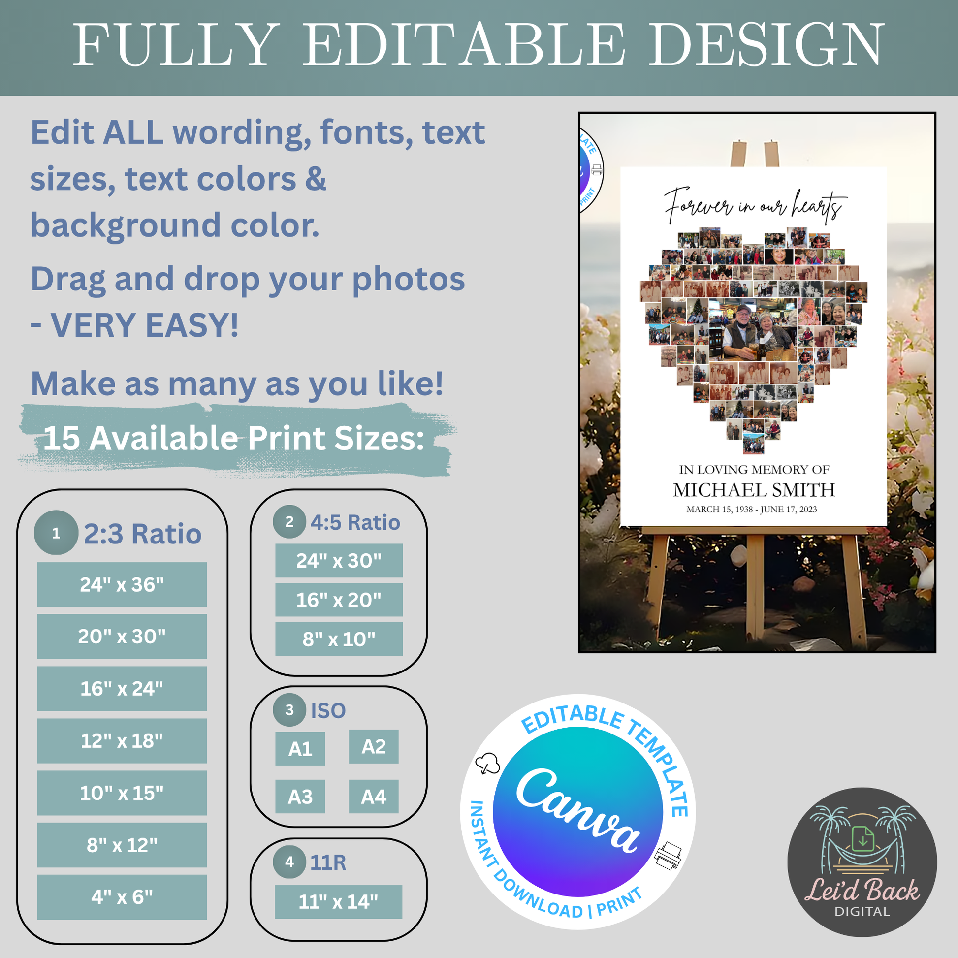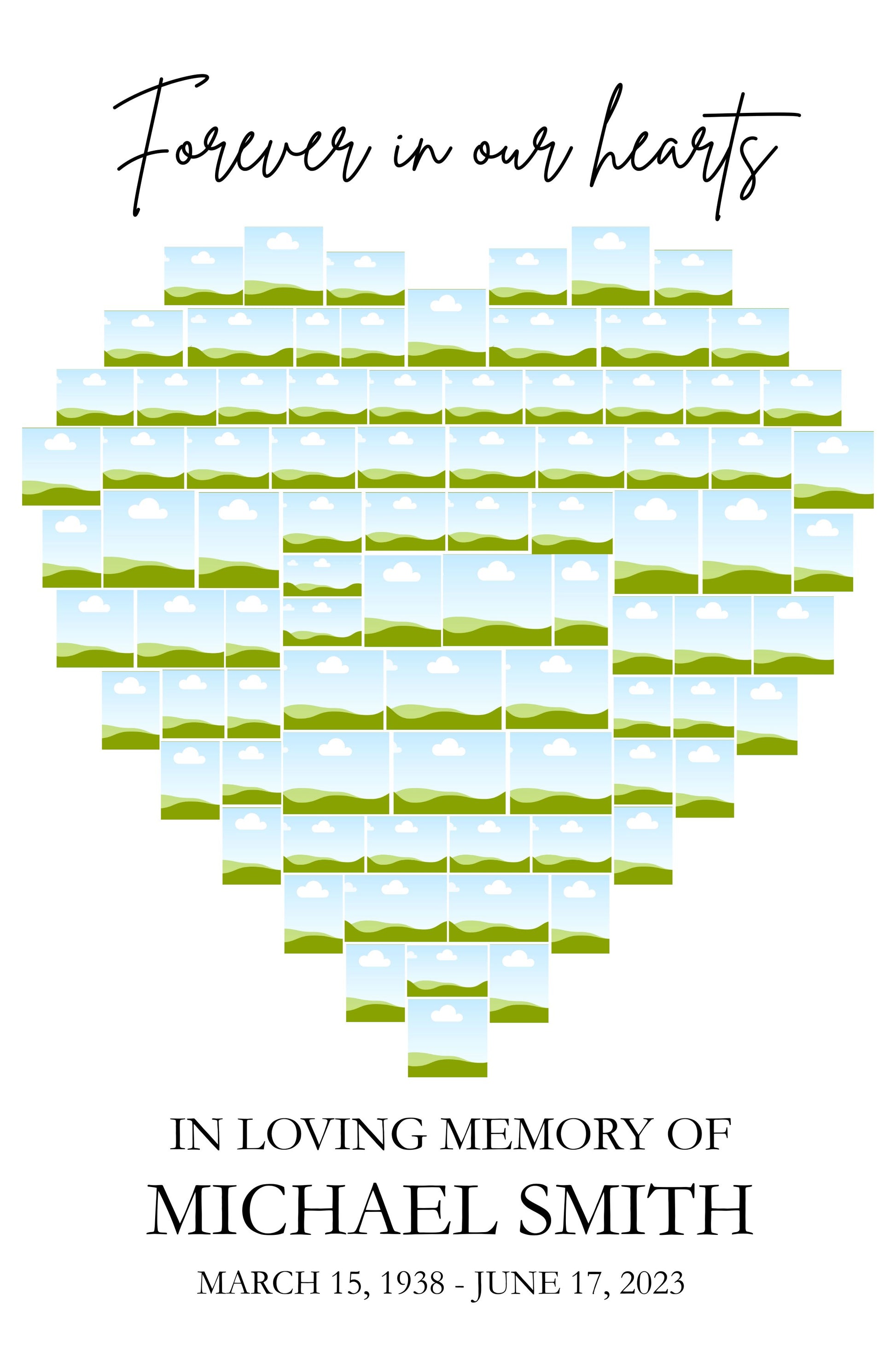 Honor your loved one with this beautifully designed Heart-Shaped Funeral Photo Collage Template, featuring space for up to 85 cherished photos. Instantly downloadable and fully editable in Canva for free, this digital template allows you to customize names, dates, and images with ease—no design skills needed. Perfect for a celebration of life, memorial service, or funeral display, this heartfelt tribute prints beautifully in up to 15 different sizes and serves as a touching reminder of a life well lived.