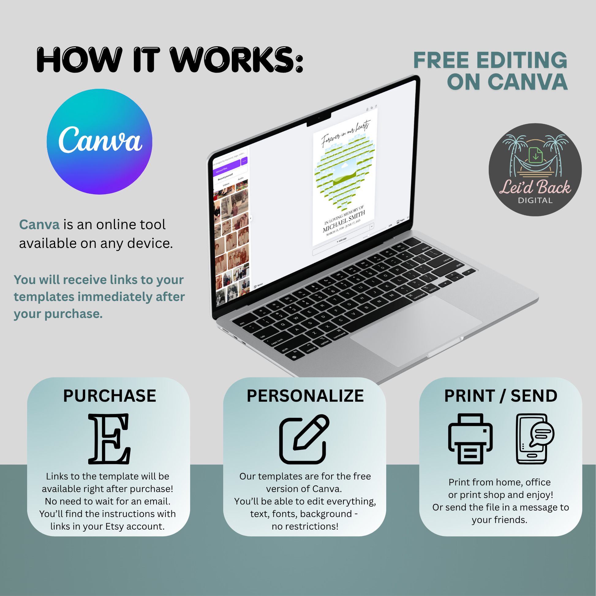 Edit your template in Canva within minutes of purchase — no subscription needed! All wording, fonts, colors, and backgrounds are fully editable. You can also upload your own photos to personalize your design.