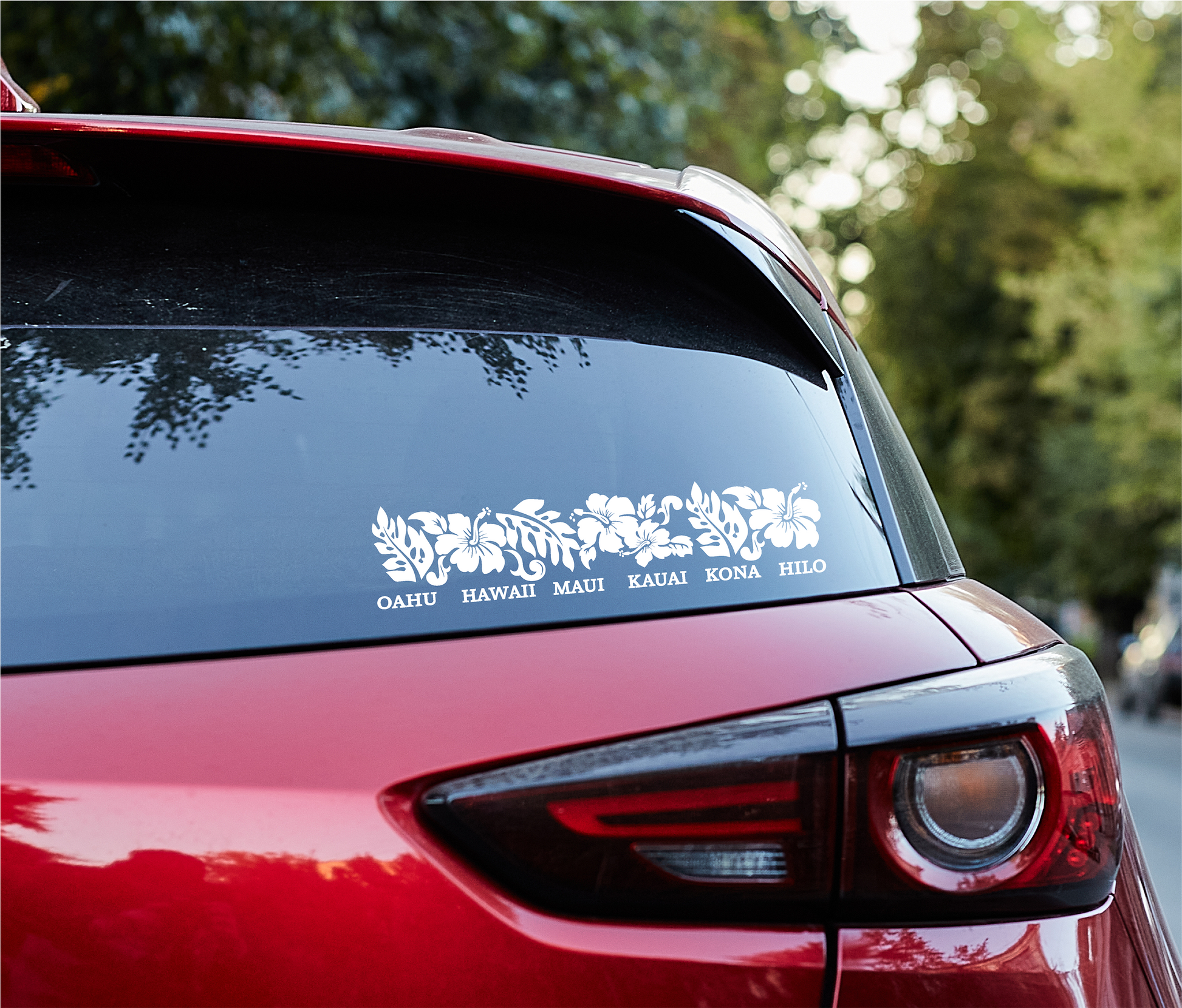 The car decal is a colorful and vibrant tribute to Hawaii, featuring an array of Hawaiian flowers. Underneath these floral elements are the names of the Hawaiian Islands. This decal beautifully captures the diversity and beauty of the Hawaiian archipelago.