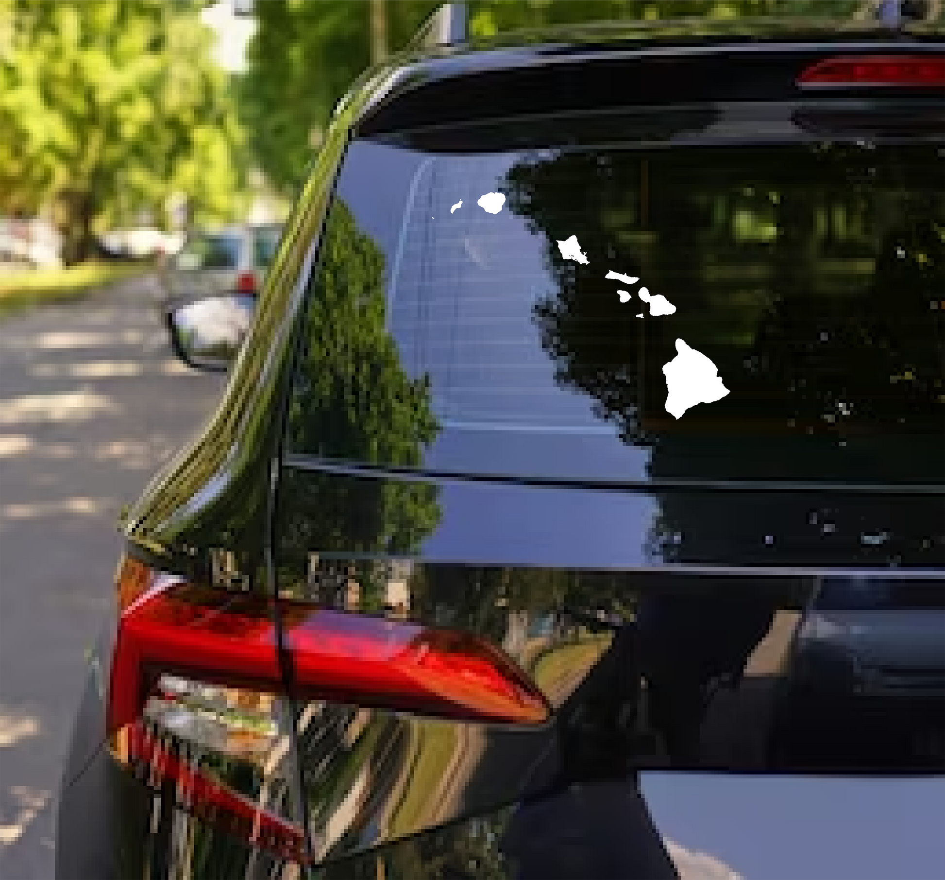 The decal presents a detailed silhouette of the Hawaiian Islands, capturing the unique shape of each island in the archipelago. The design is clean and precise, allowing for easy recognition of the individual islands. It's a simple yet elegant representation, perfect for those who want to showcase their affinity for Hawaii's natural beauty and geographic diversity.