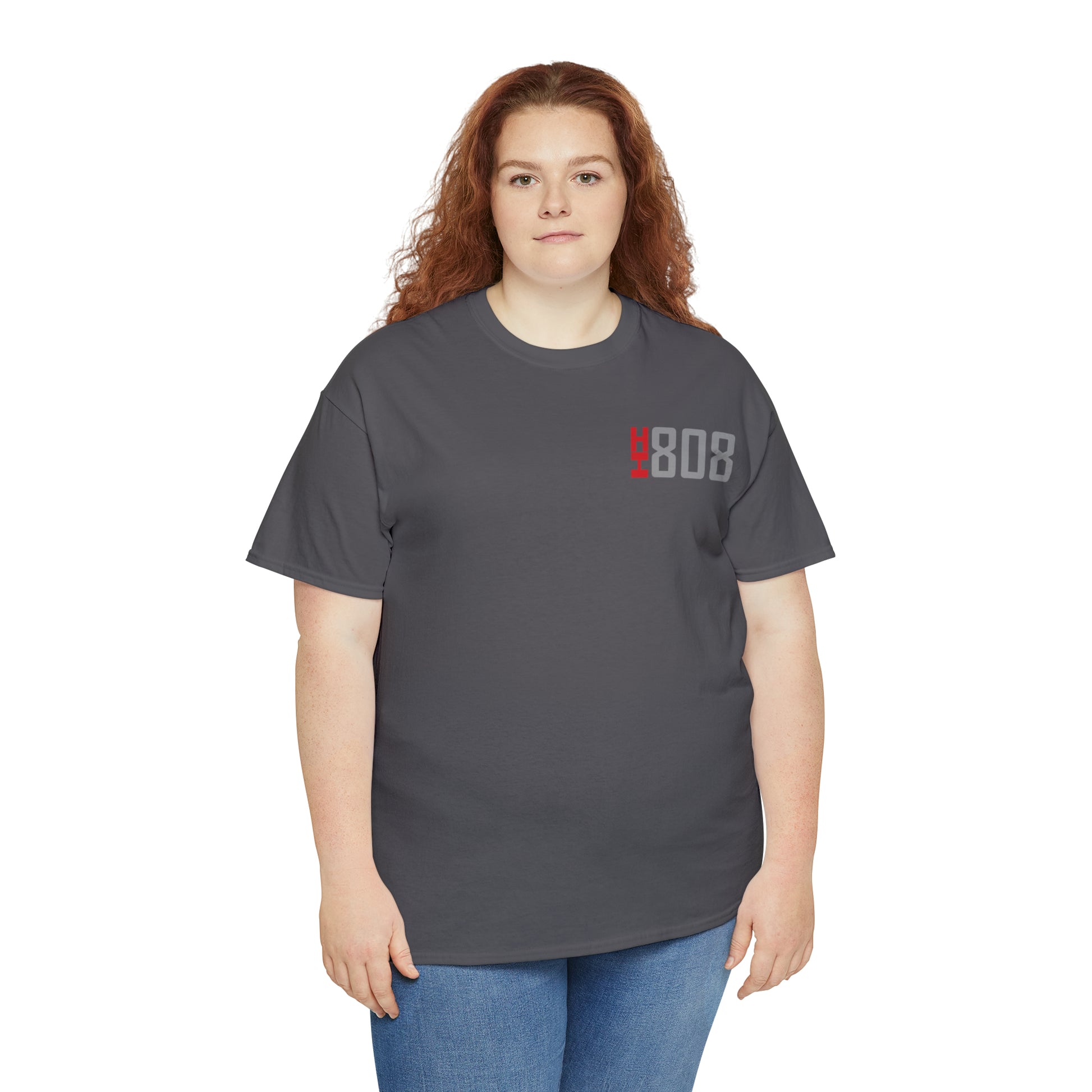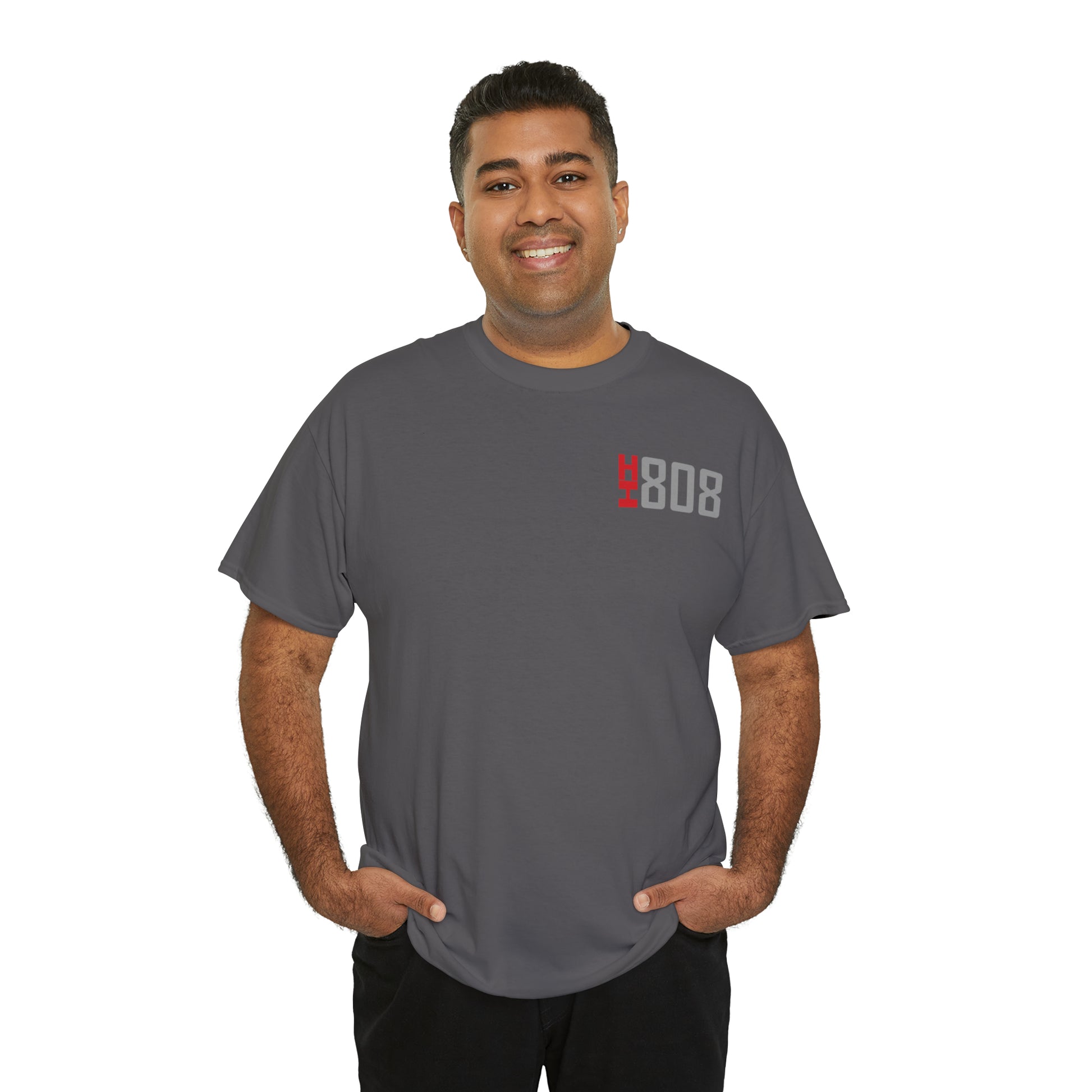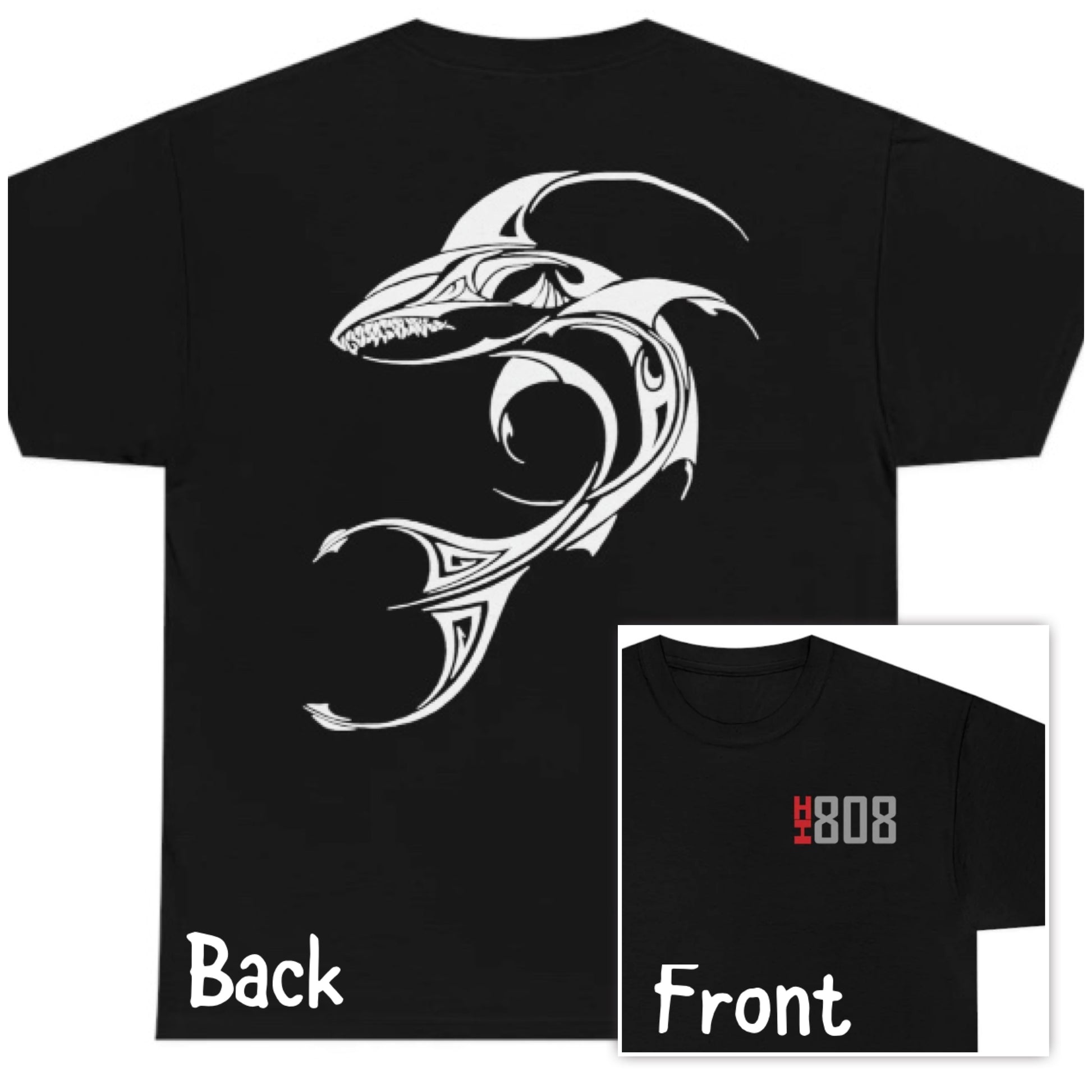 Unleash your wild side and pay homage to the beauty of Hawaii with our striking tribal shark t-shirt. Featuring a cool and fierce tribal shark design on the back, and a bold red "HI" and "808" on the front, this shirt captures the spirit of the islands while showcasing your love for adventure and the Aloha State.