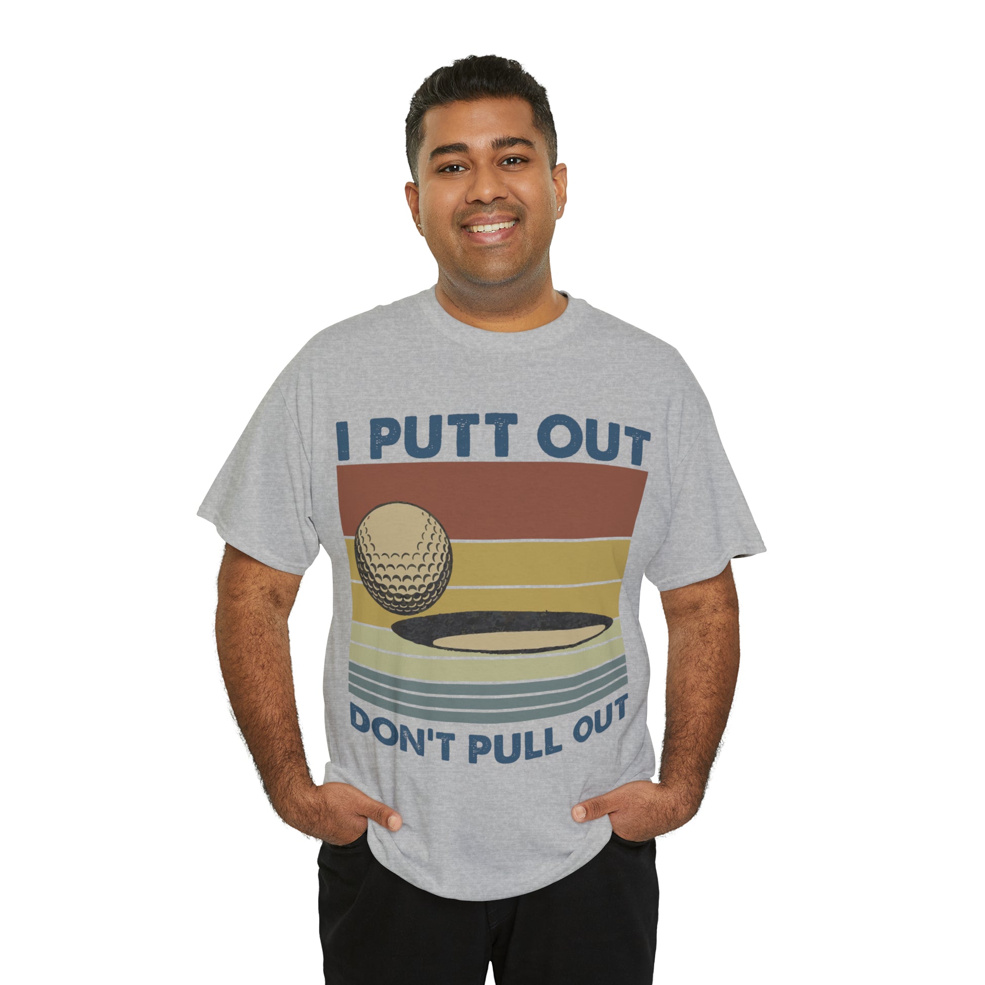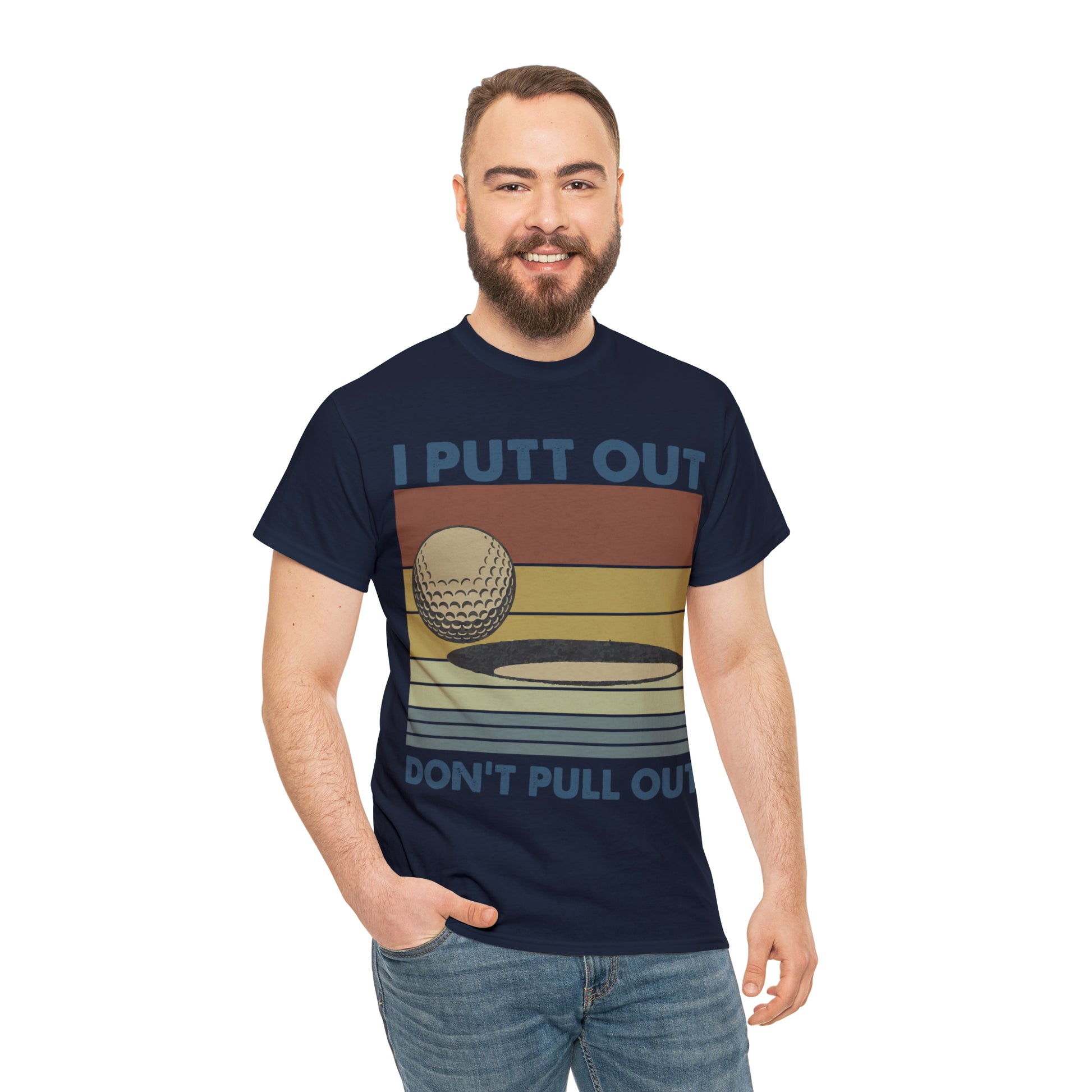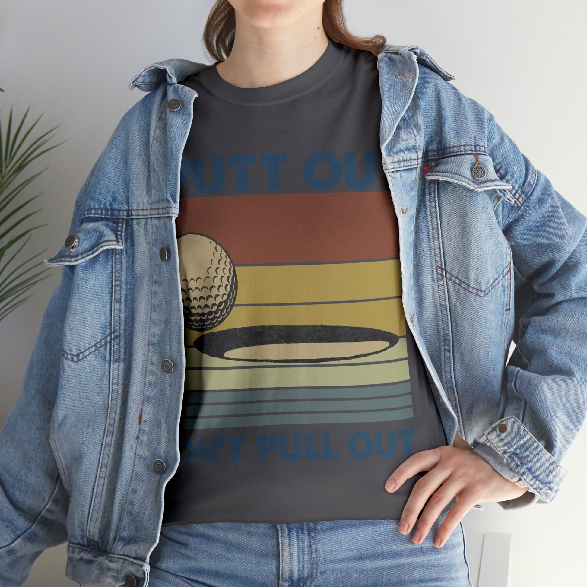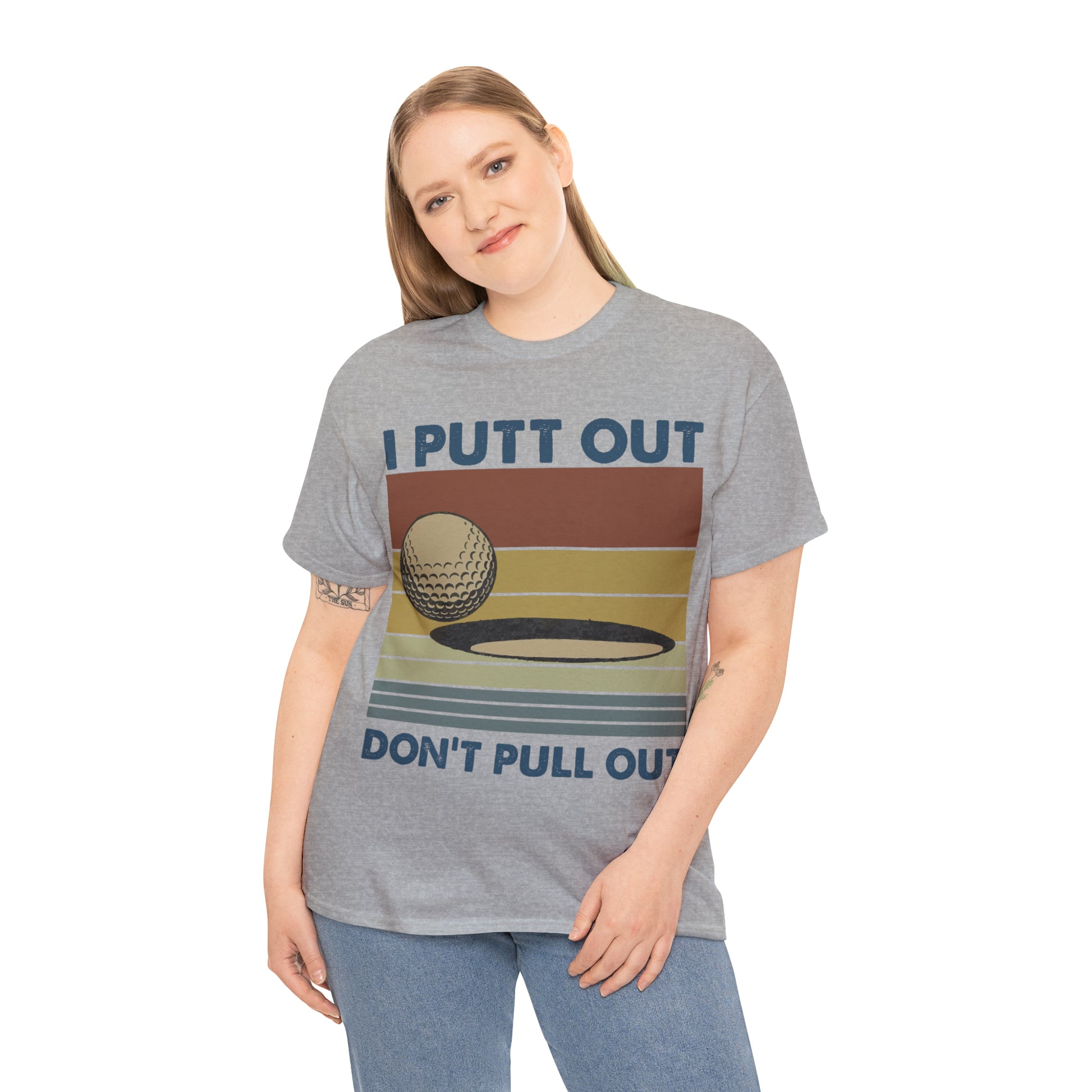 This "I Putt Out, Don't Pull Out" vintage-style t-shirt is a whimsical spin on golf humor. Its cheeky double entendre design captures a golf enthusiast's commitment to both the sport and their playful side. Made for golfers who love to laugh, it's a comfortable tee that speaks volumes about your fun-loving spirit.