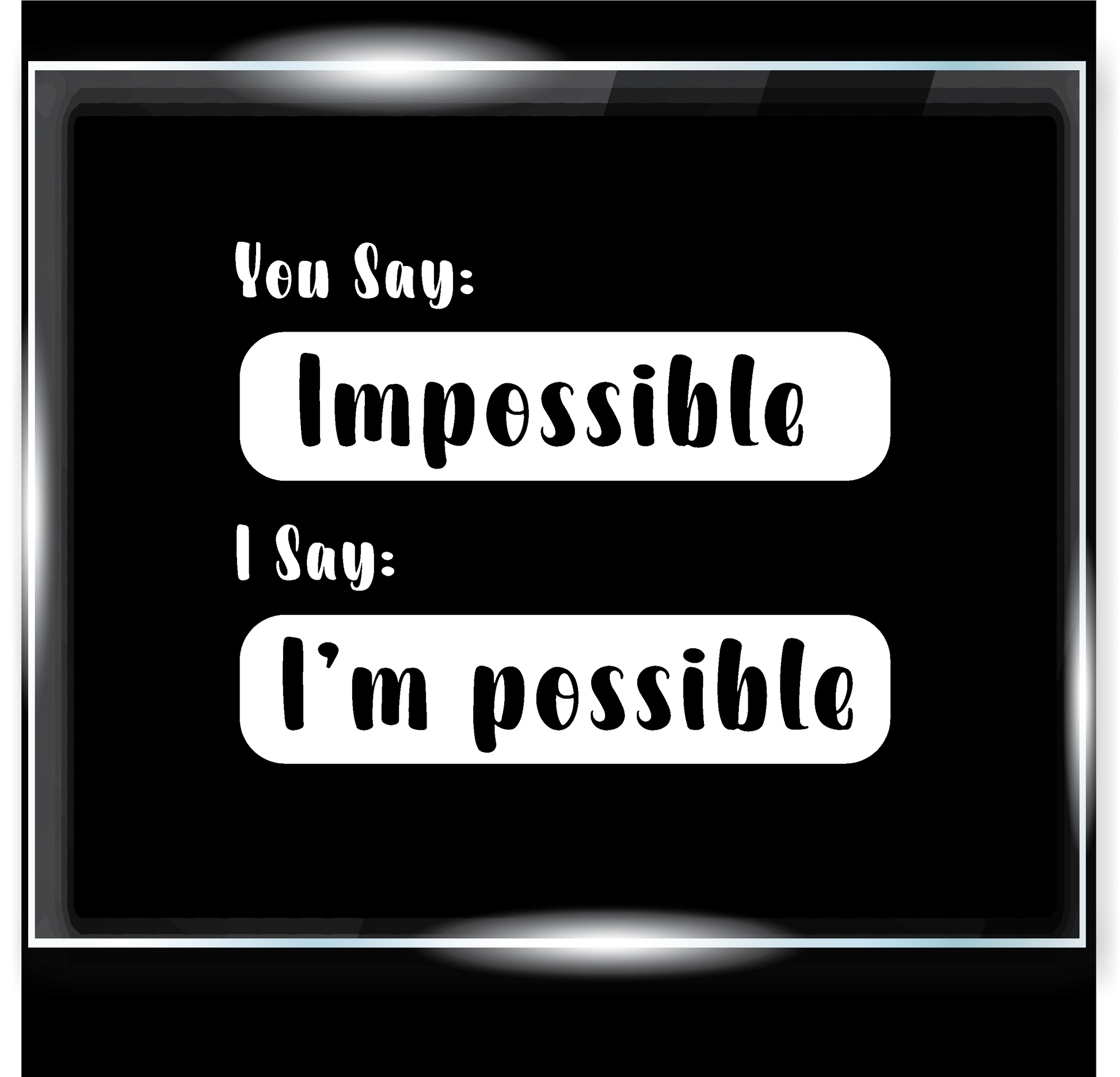 You say impossible, I say I'm Possible is a clever play on words, transforming the word "impossible" into "I'm Possible". It inspires a shift in perspective, emphasizing self-belief and the power of a positive mindset. This phrase encourages overcoming challenges by reimagining limitations as opportunities.