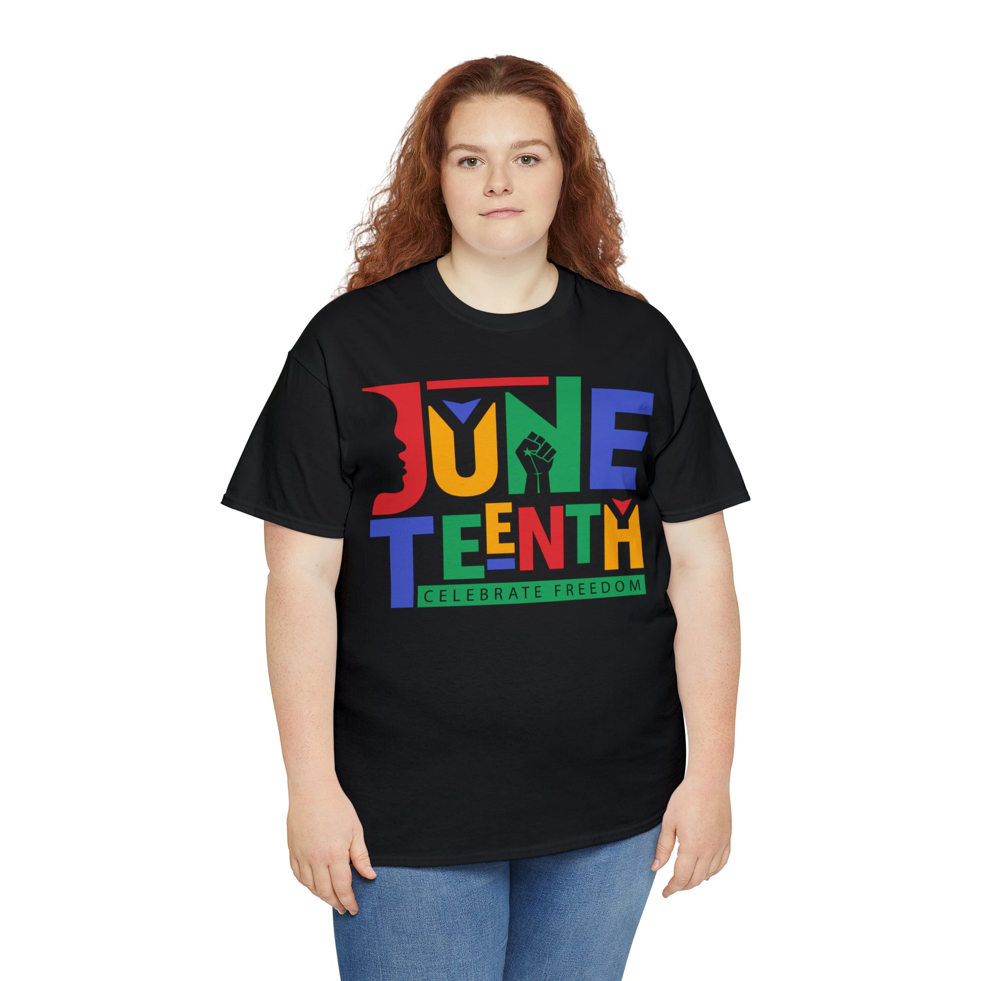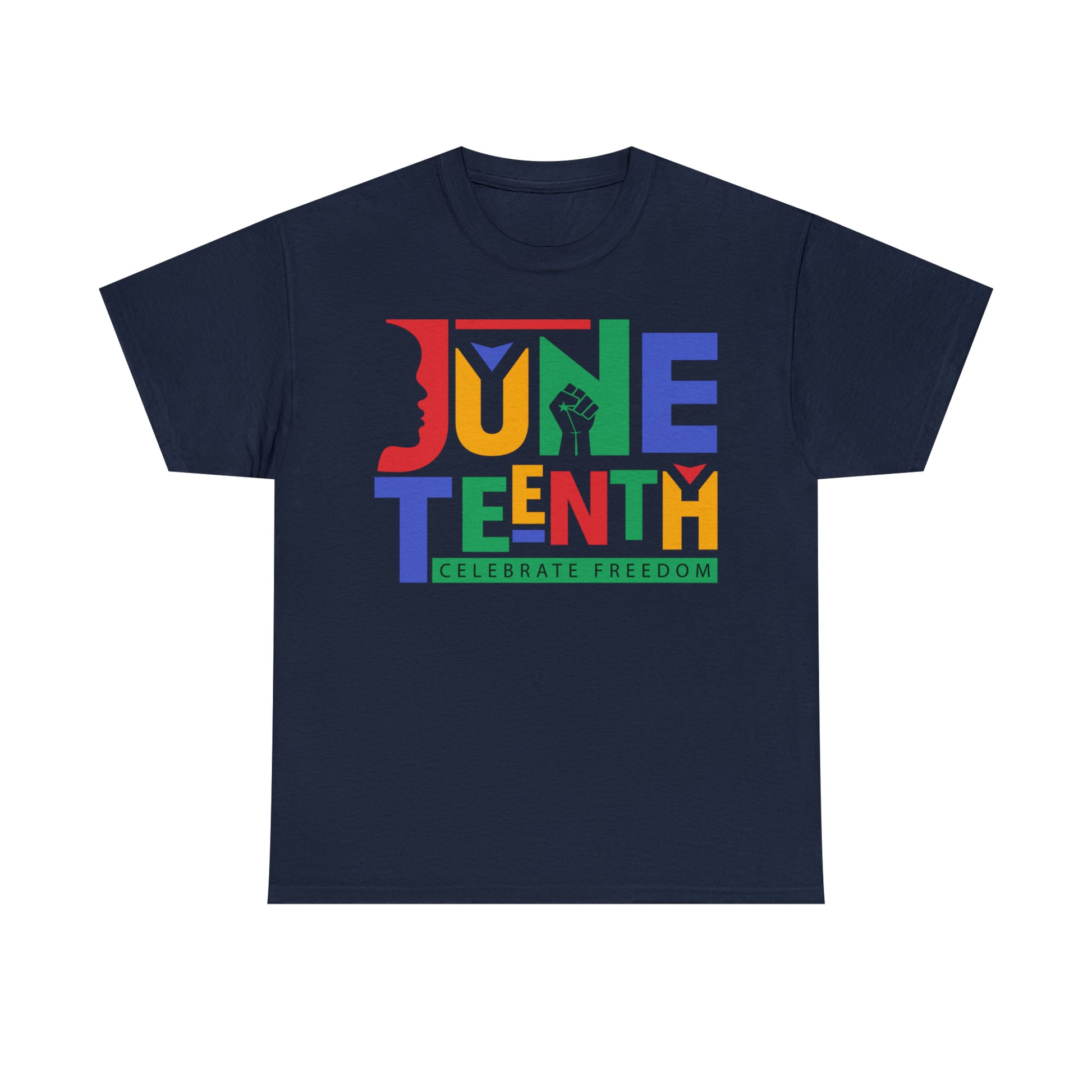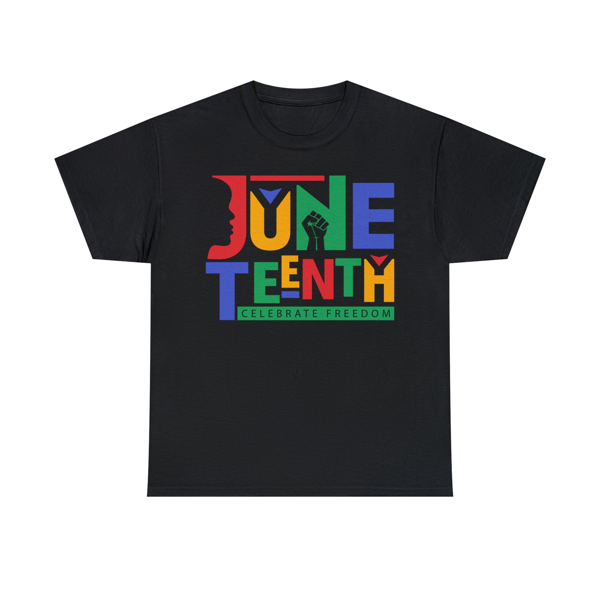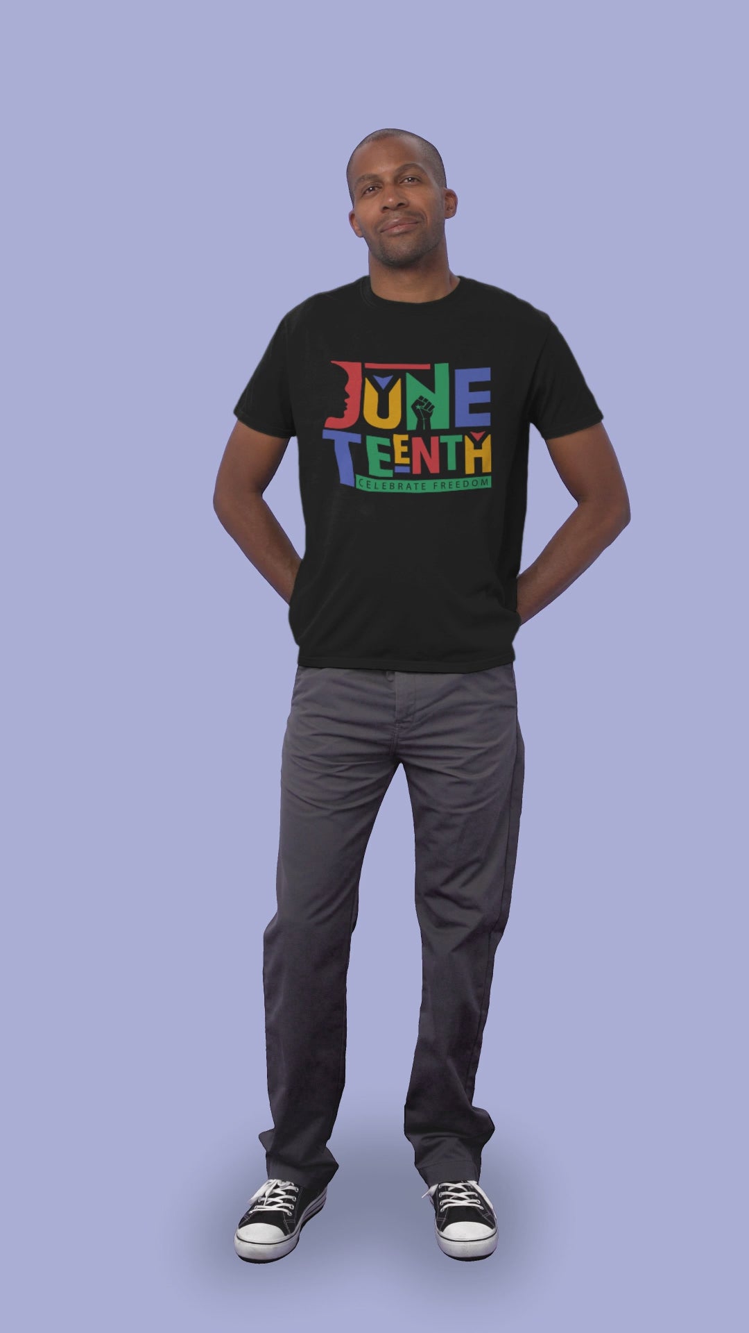 Exuding radiant vivacity, this Juneteenth t-shirt is a joyous celebration of freedom. Splashed with vibrant colors, the design symbolizes the jubilant spirit of emancipation. The shirt's compelling visual appeal underscores its deep historic significance, making it not only a fashion statement but a testament to enduring resilience and liberty.