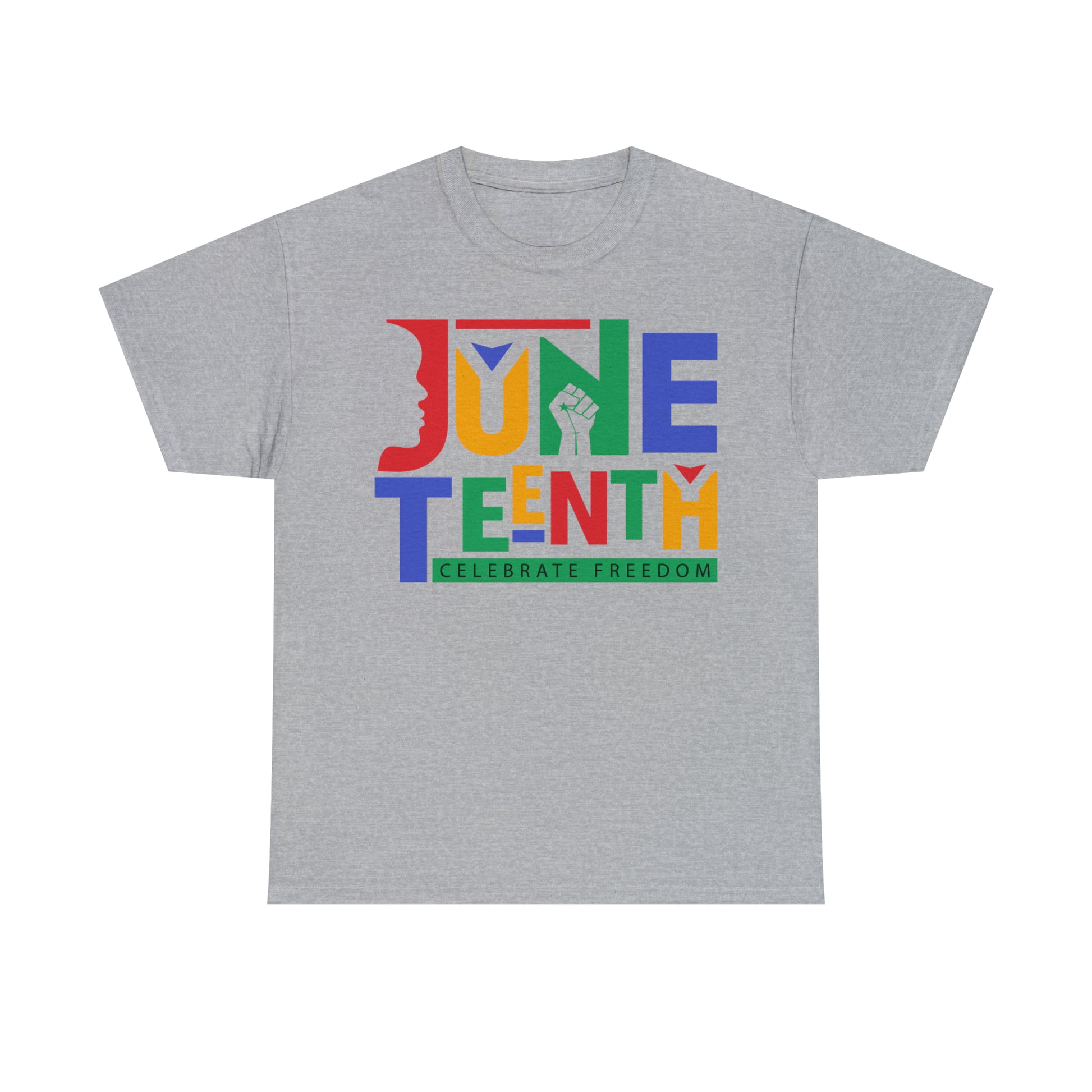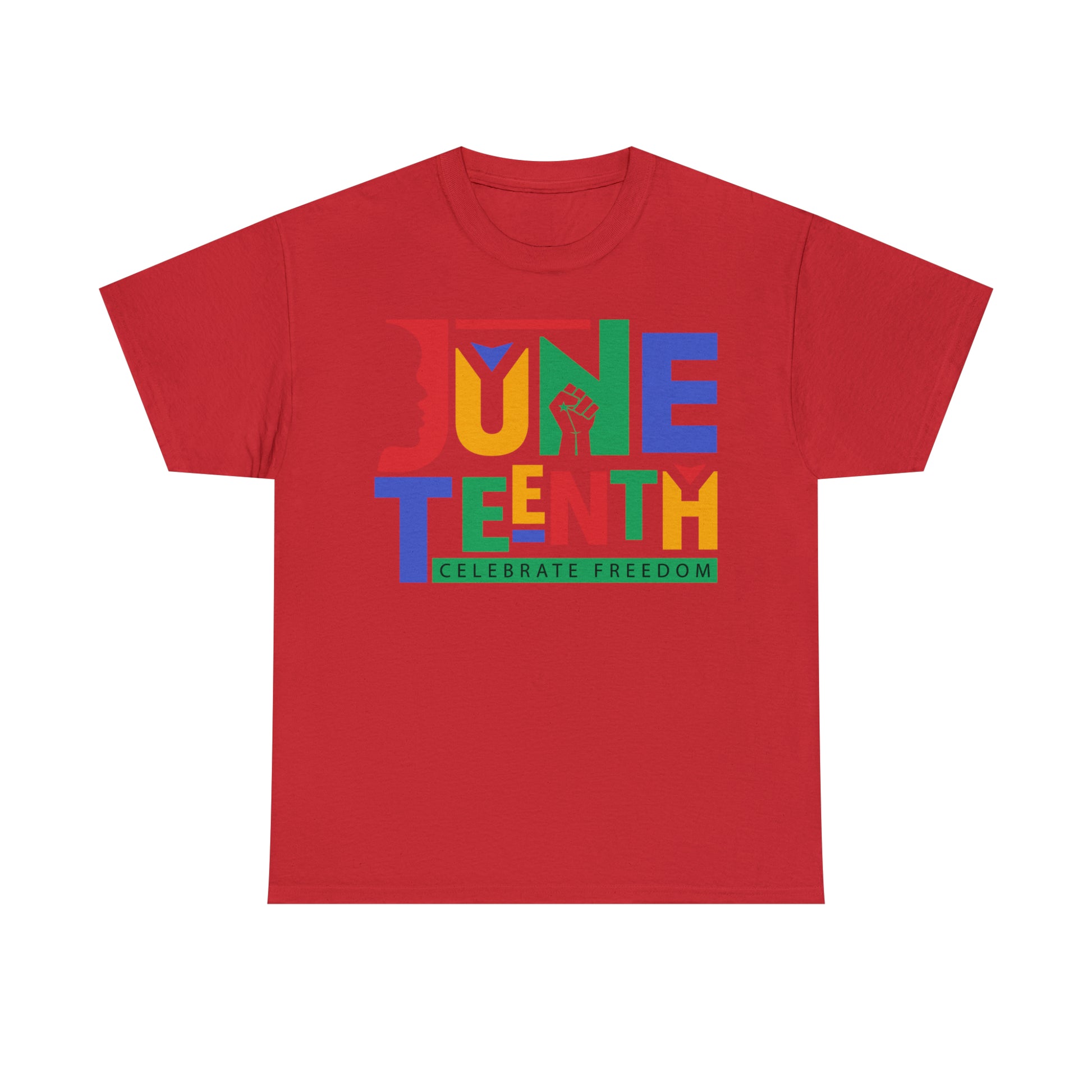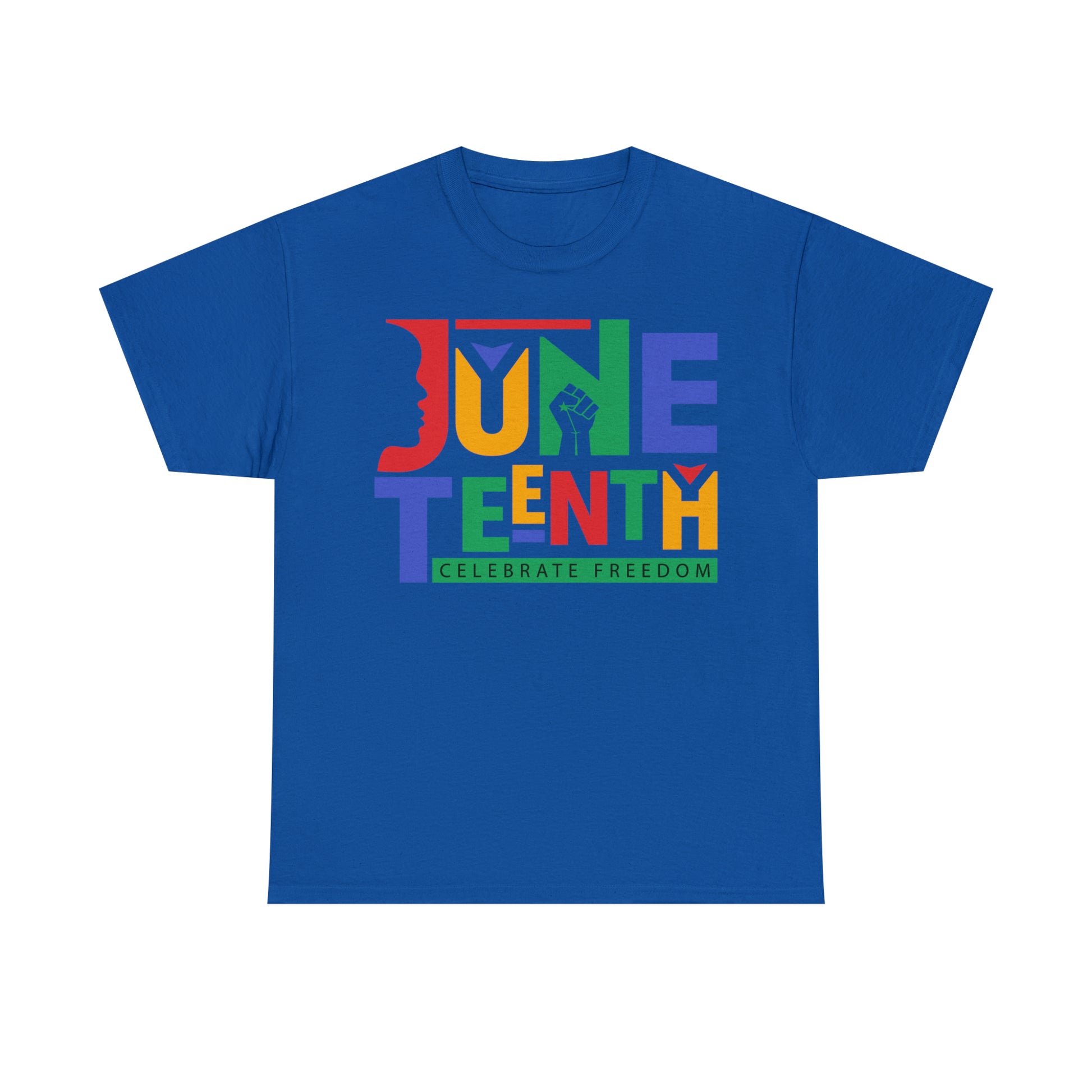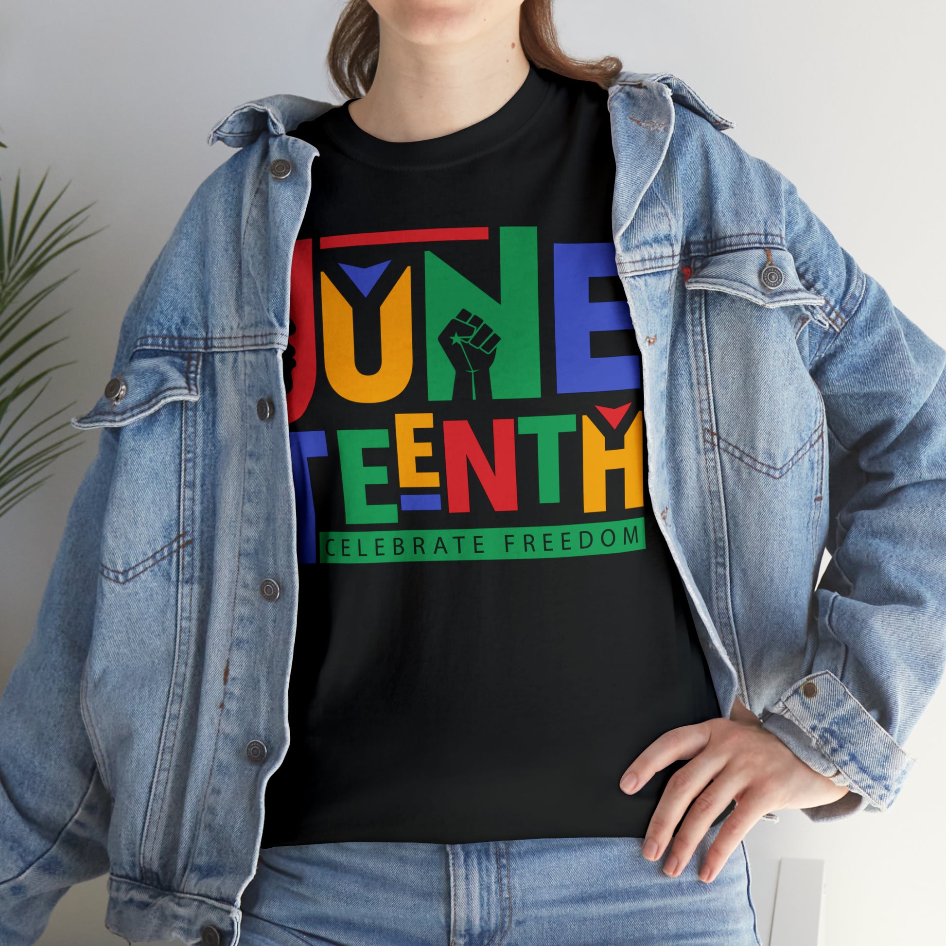 Exuding radiant vivacity, this Juneteenth t-shirt is a joyous celebration of freedom. Splashed with vibrant colors, the design symbolizes the jubilant spirit of emancipation. The shirt's compelling visual appeal underscores its deep historic significance, making it not only a fashion statement but a testament to enduring resilience and liberty.