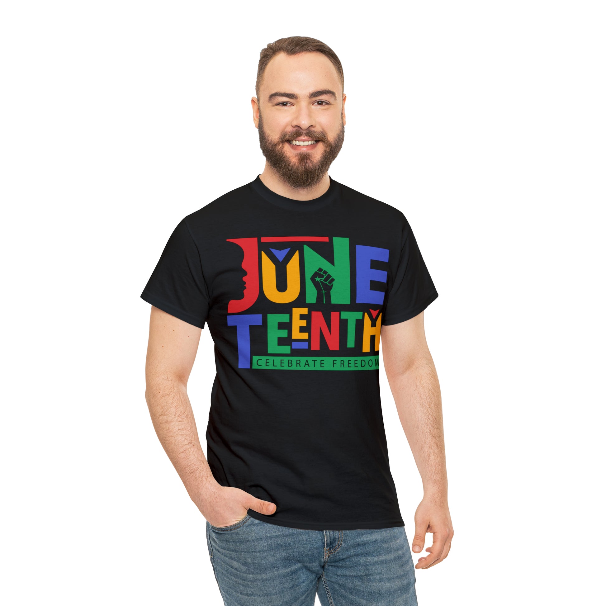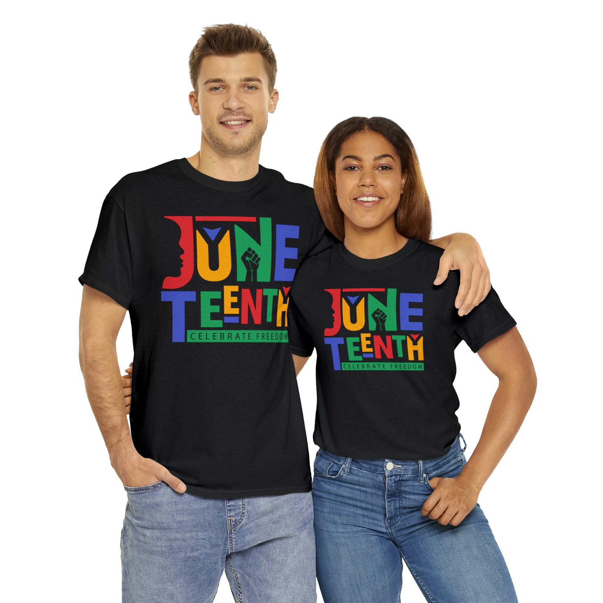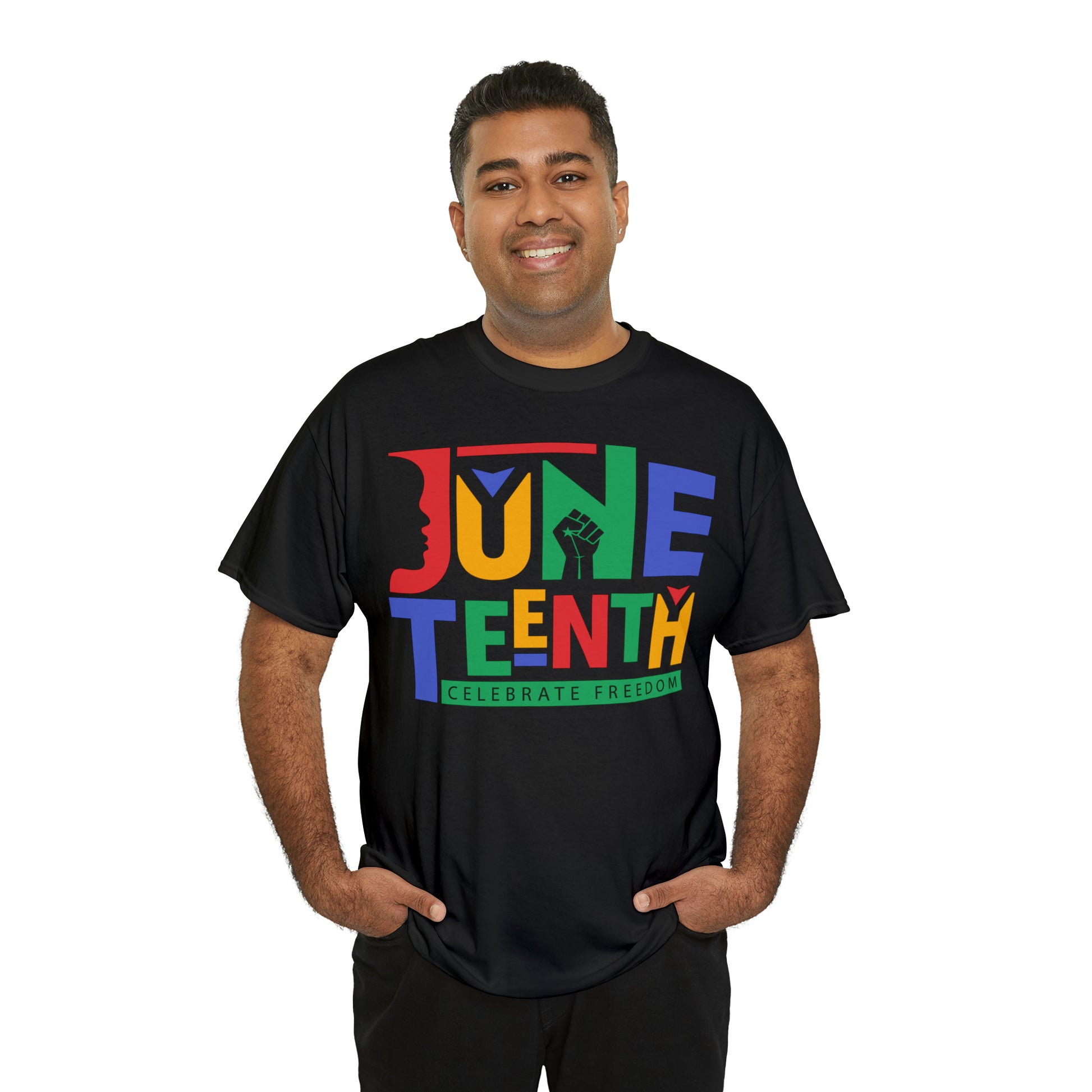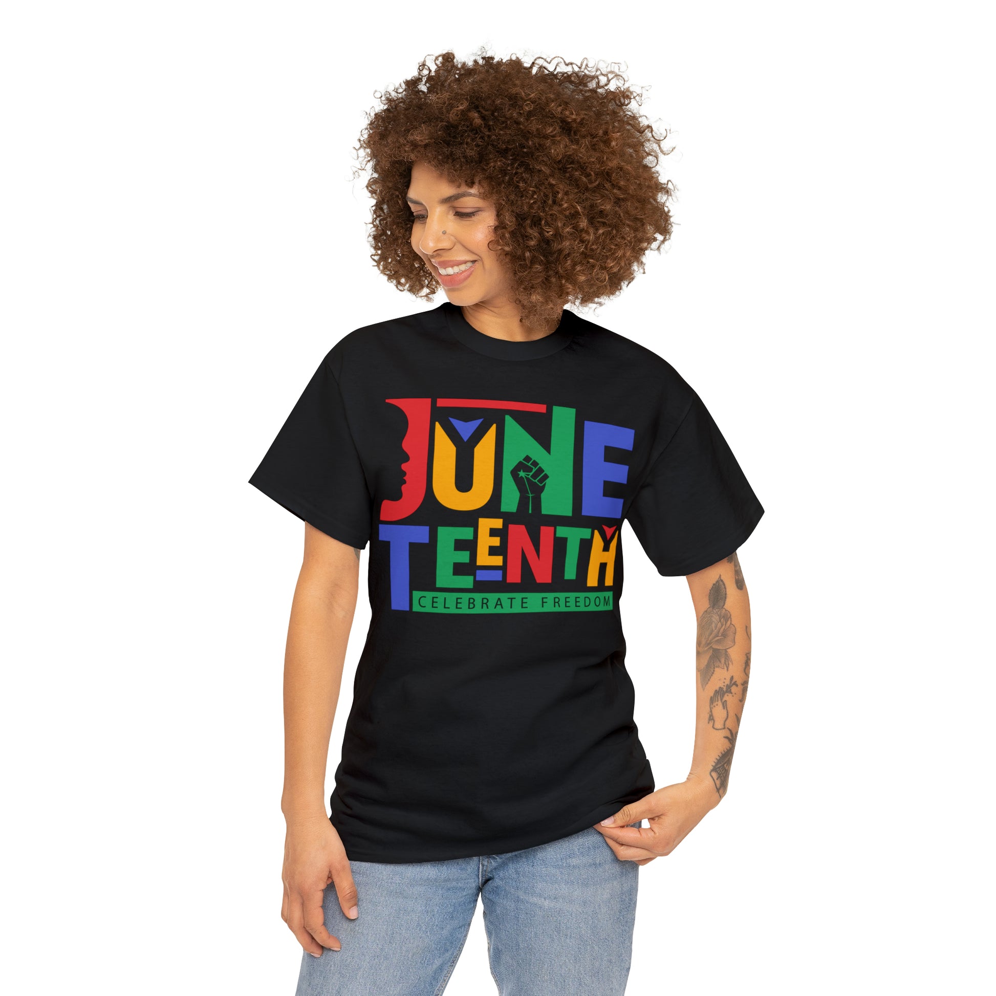 Exuding radiant vivacity, this Juneteenth t-shirt is a joyous celebration of freedom. Splashed with vibrant colors, the design symbolizes the jubilant spirit of emancipation. The shirt's compelling visual appeal underscores its deep historic significance, making it not only a fashion statement but a testament to enduring resilience and liberty.