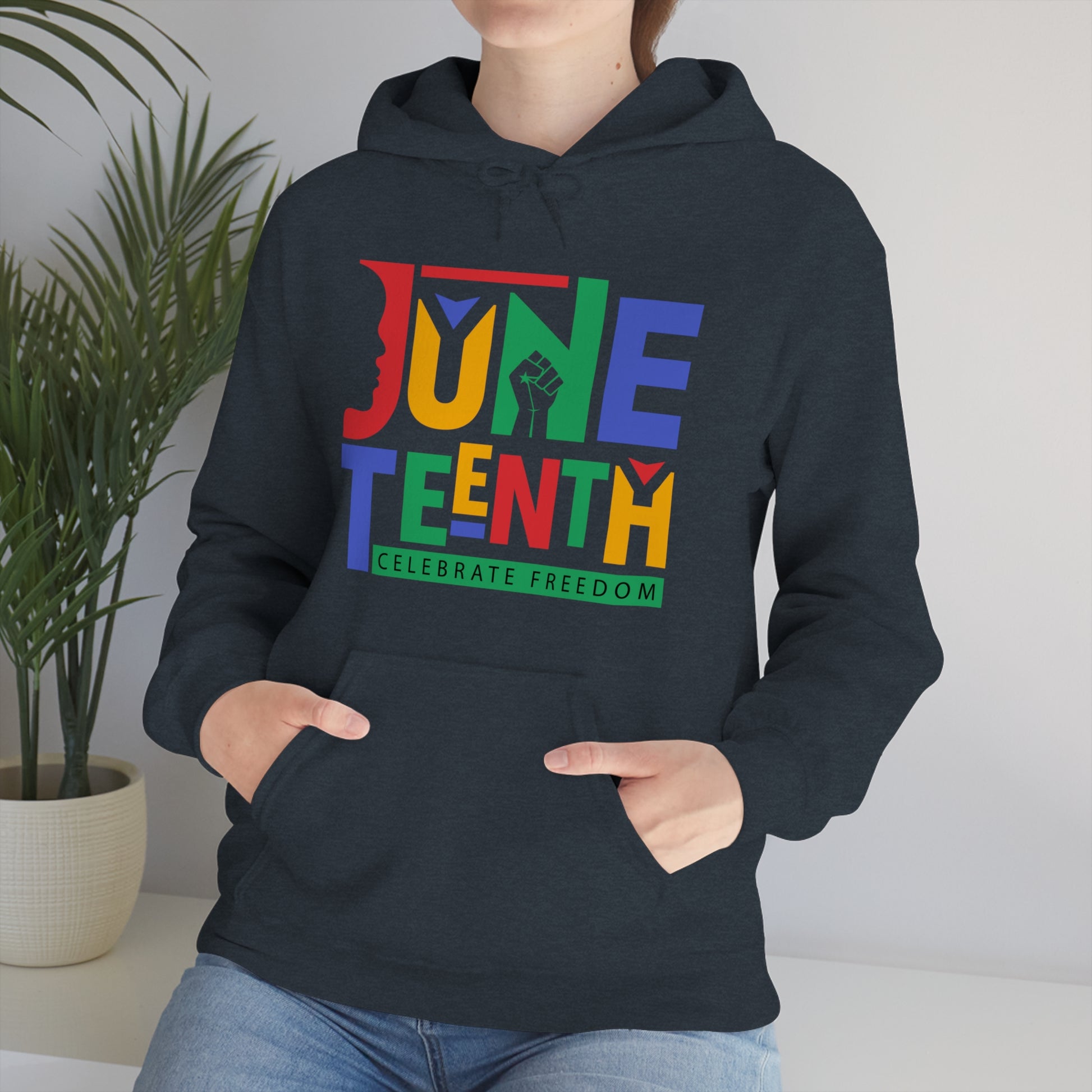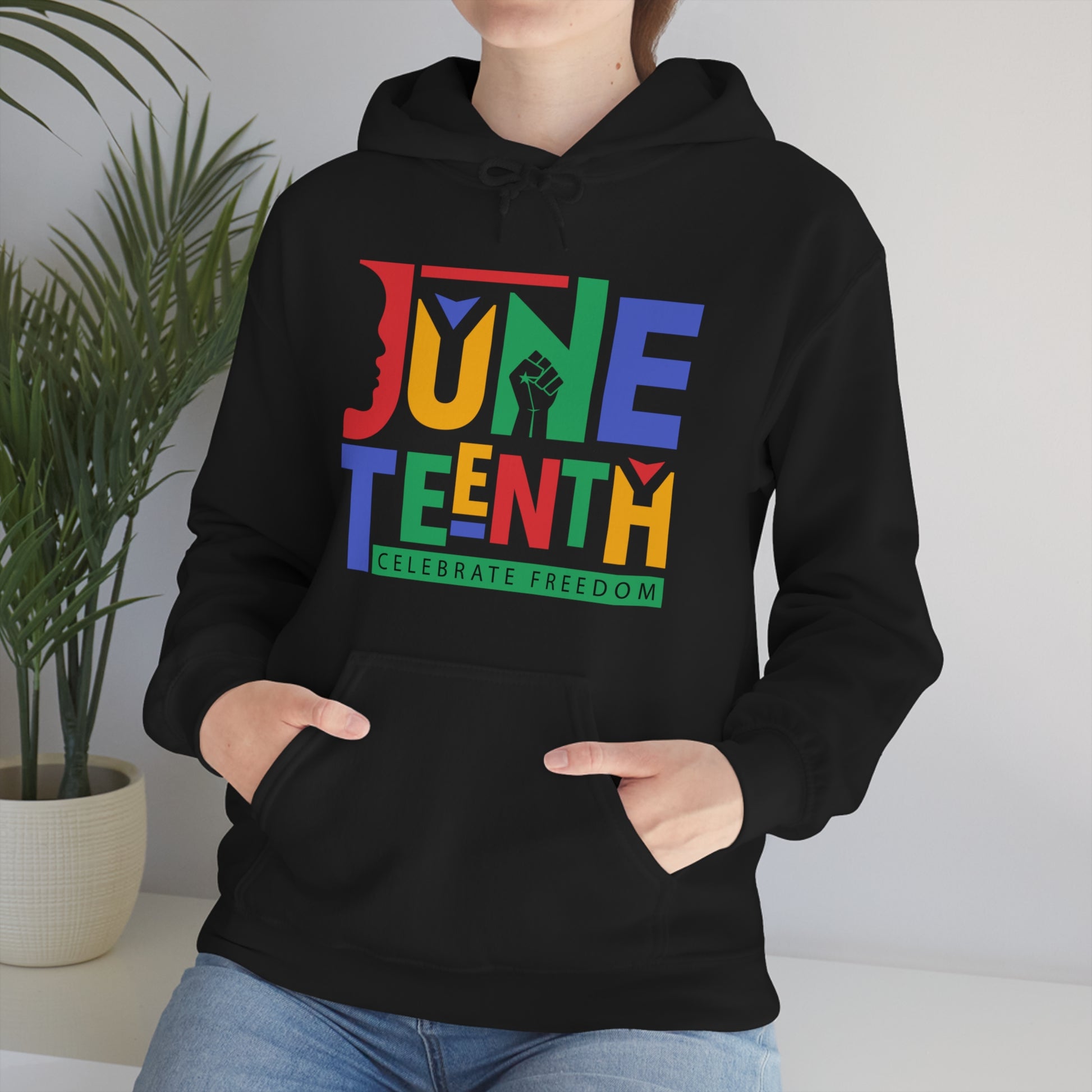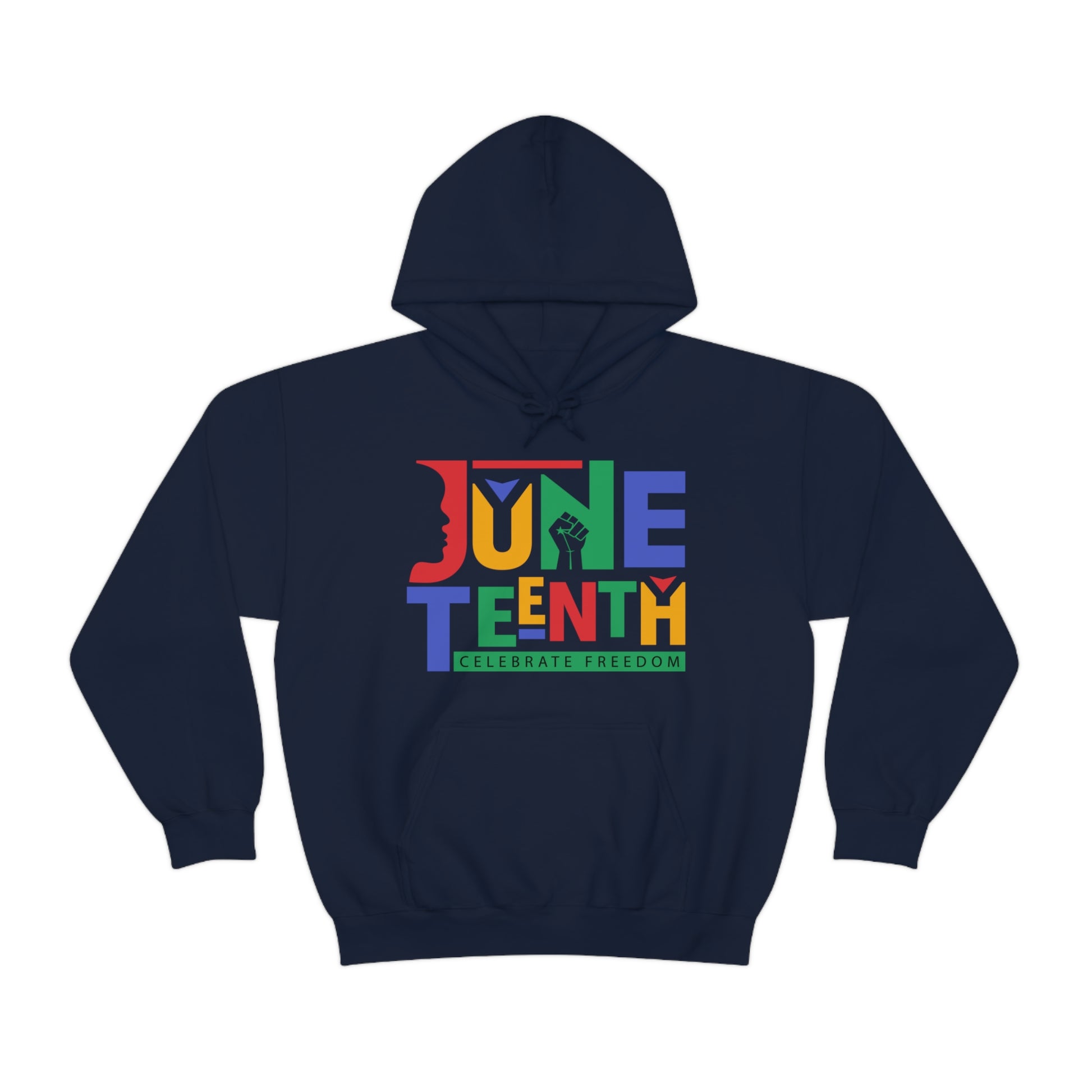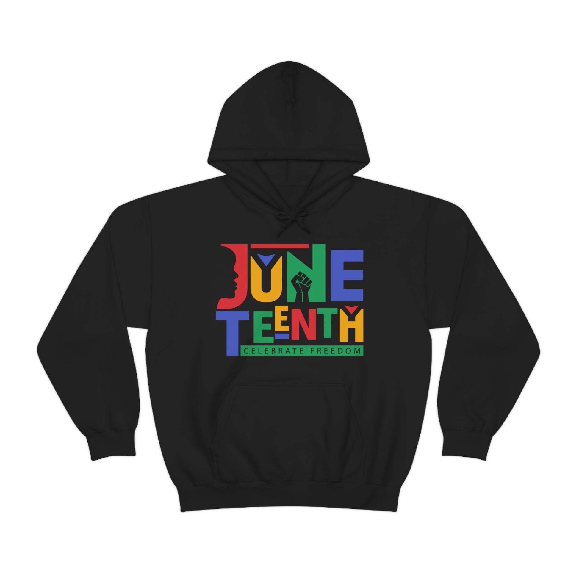 Exuding radiant vivacity, this Juneteenth hoodie is a joyous celebration of freedom. Splashed with vibrant colors, the design symbolizes the jubilant spirit of emancipation. The shirt's compelling visual appeal underscores its deep historic significance, making it not only a fashion statement but a testament to enduring resilience and liberty.