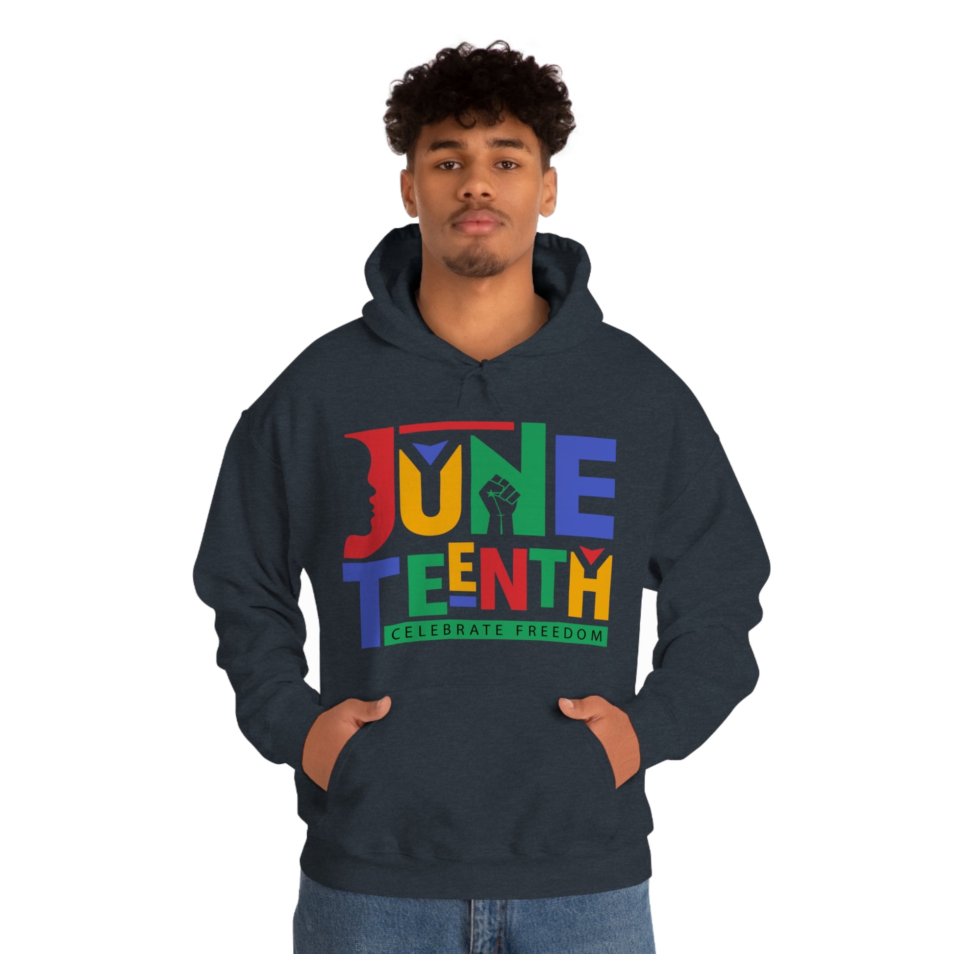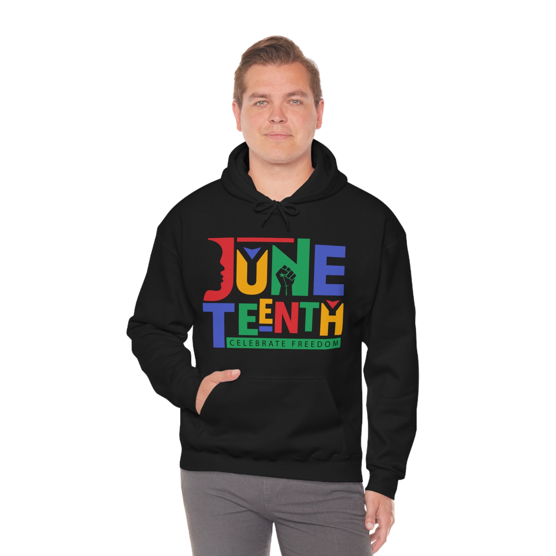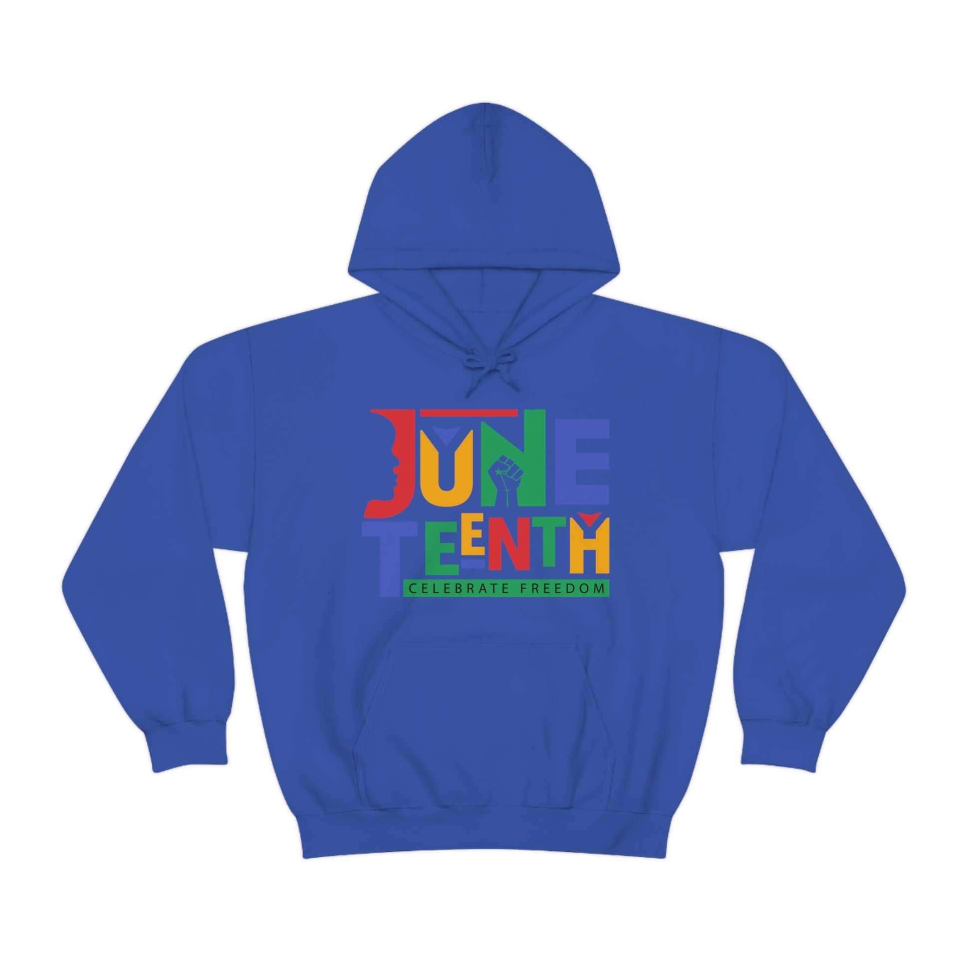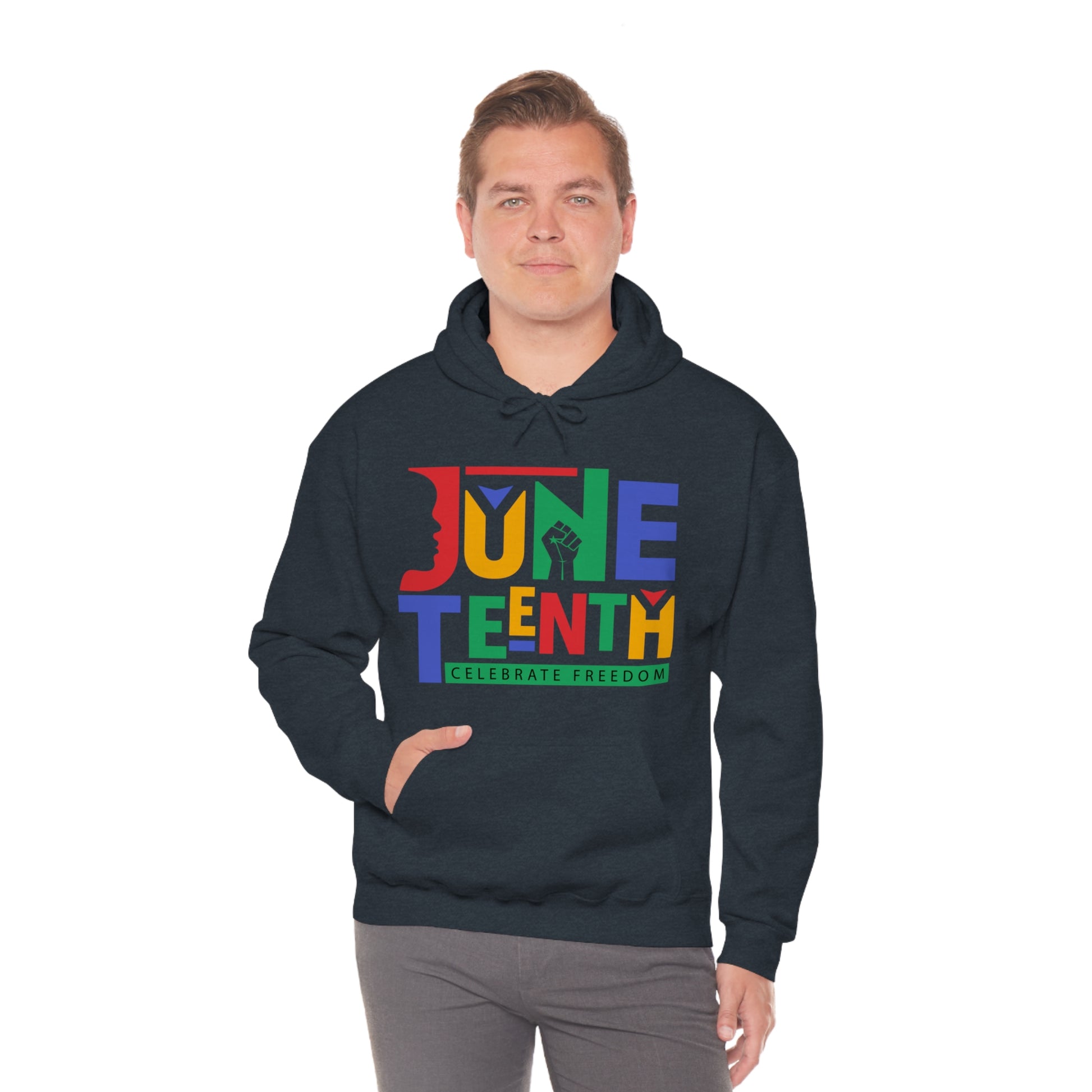 Exuding radiant vivacity, this Juneteenth hoodie is a joyous celebration of freedom. Splashed with vibrant colors, the design symbolizes the jubilant spirit of emancipation. The shirt's compelling visual appeal underscores its deep historic significance, making it not only a fashion statement but a testament to enduring resilience and liberty.