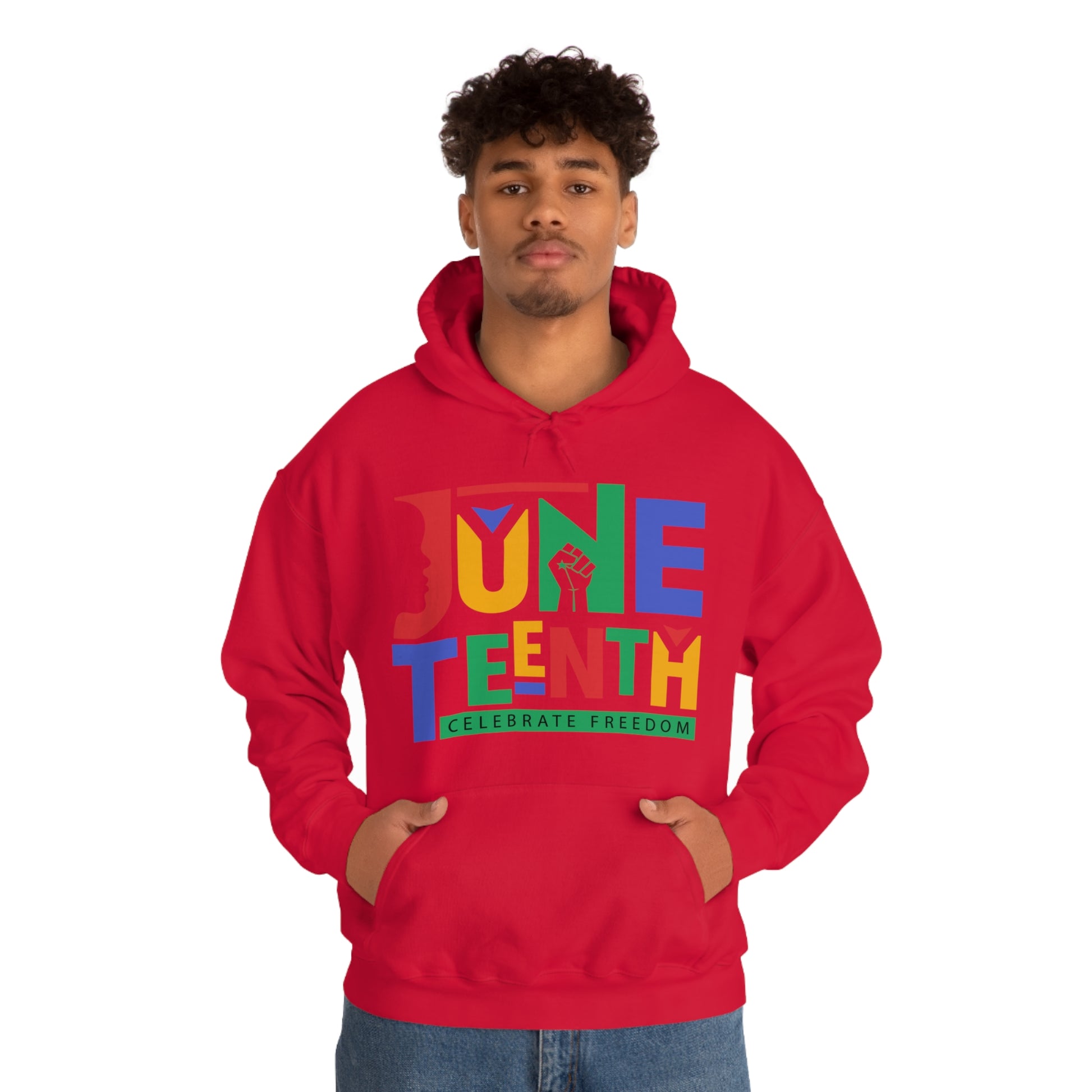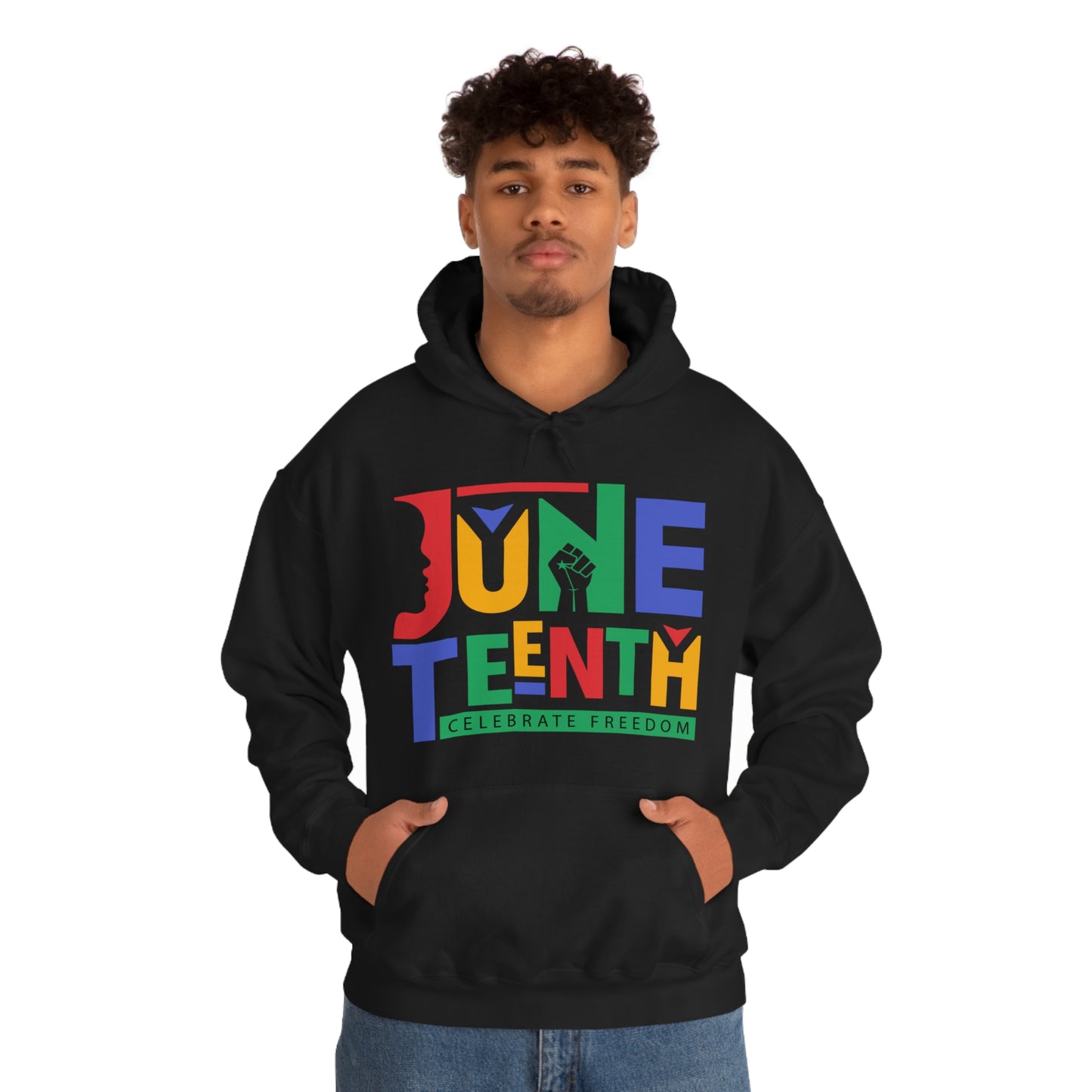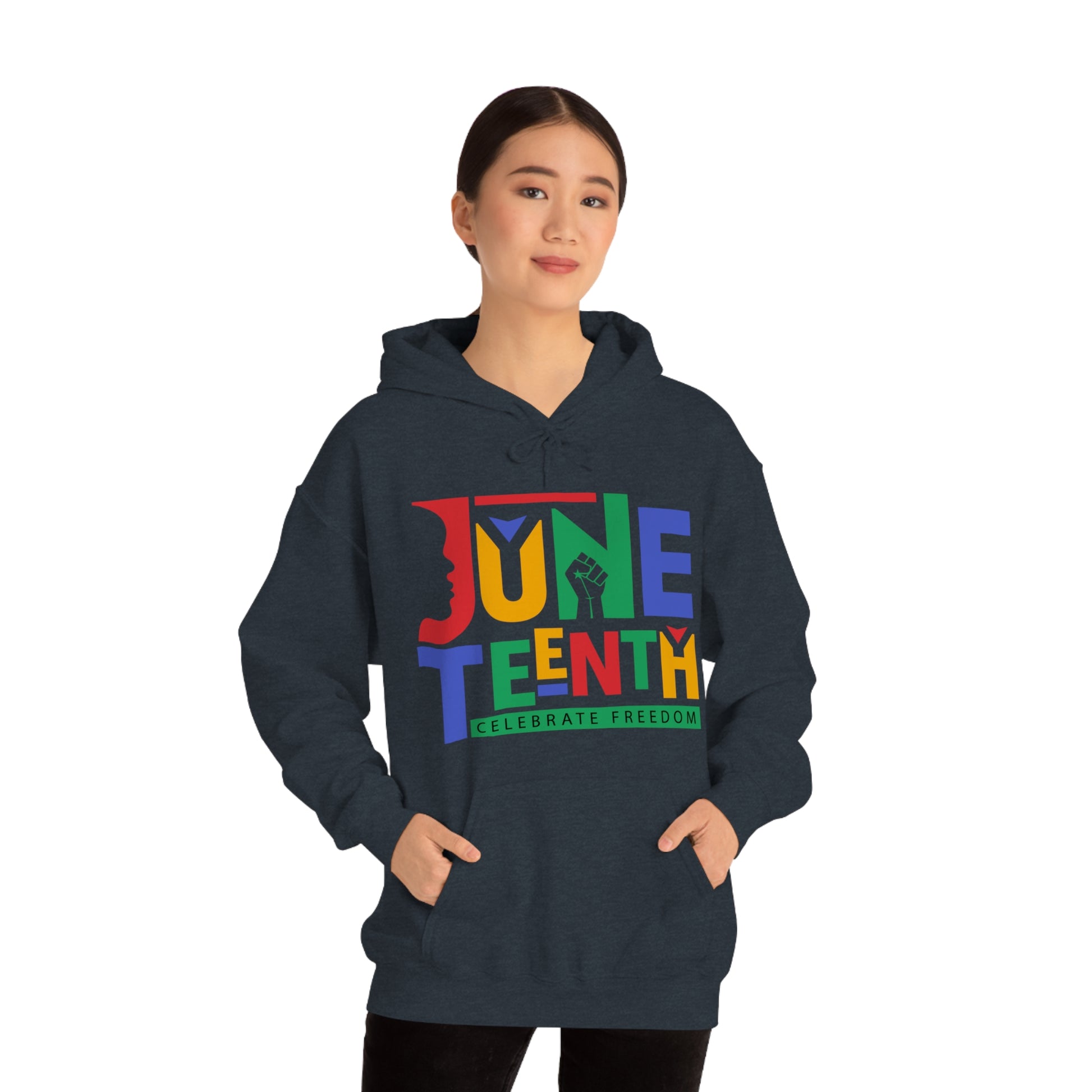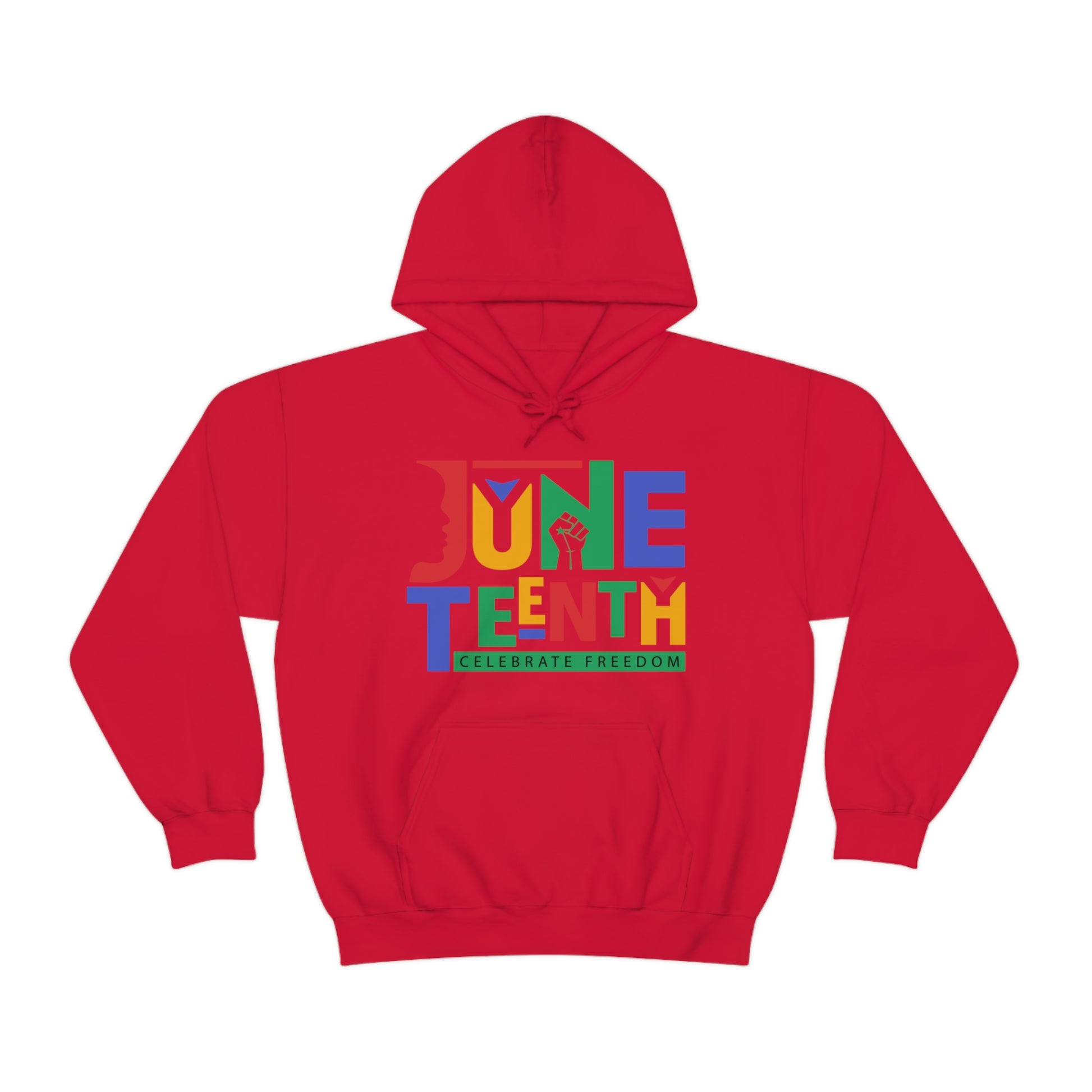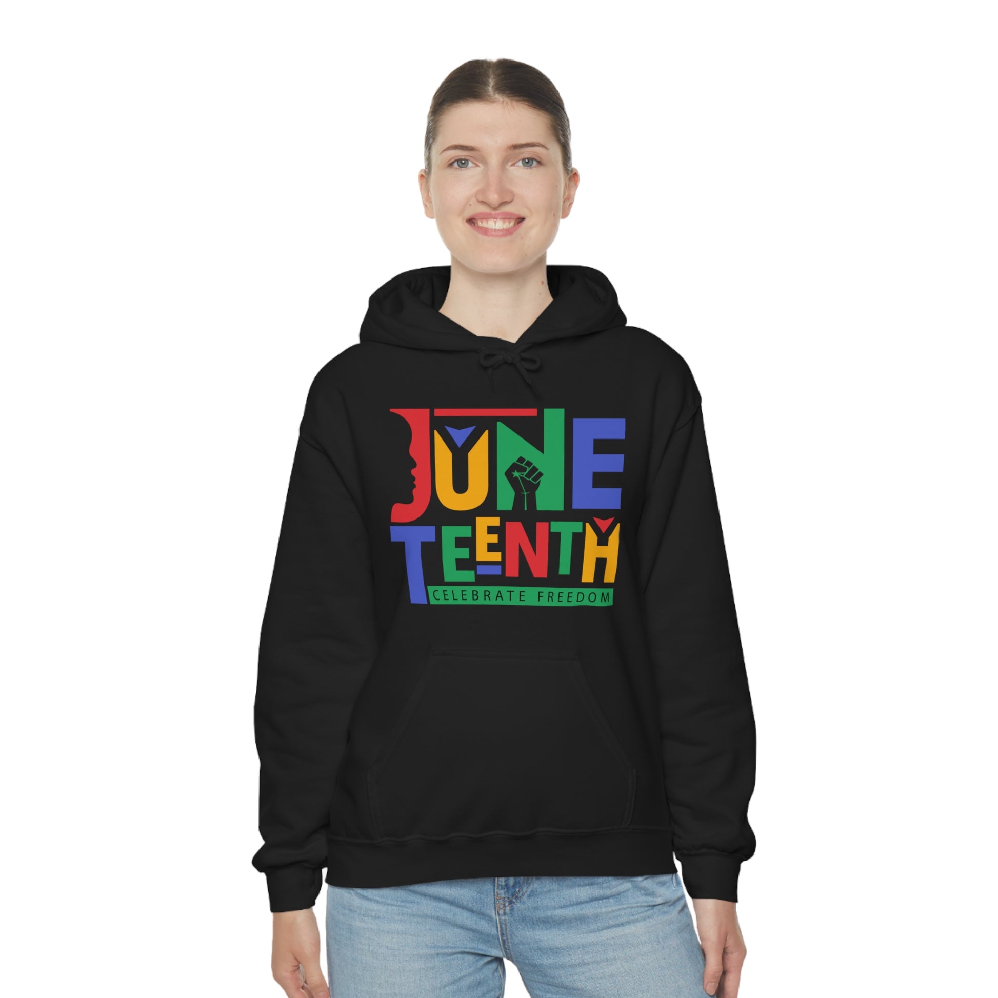 Exuding radiant vivacity, this Juneteenth hoodie is a joyous celebration of freedom. Splashed with vibrant colors, the design symbolizes the jubilant spirit of emancipation. The shirt's compelling visual appeal underscores its deep historic significance, making it not only a fashion statement but a testament to enduring resilience and liberty.