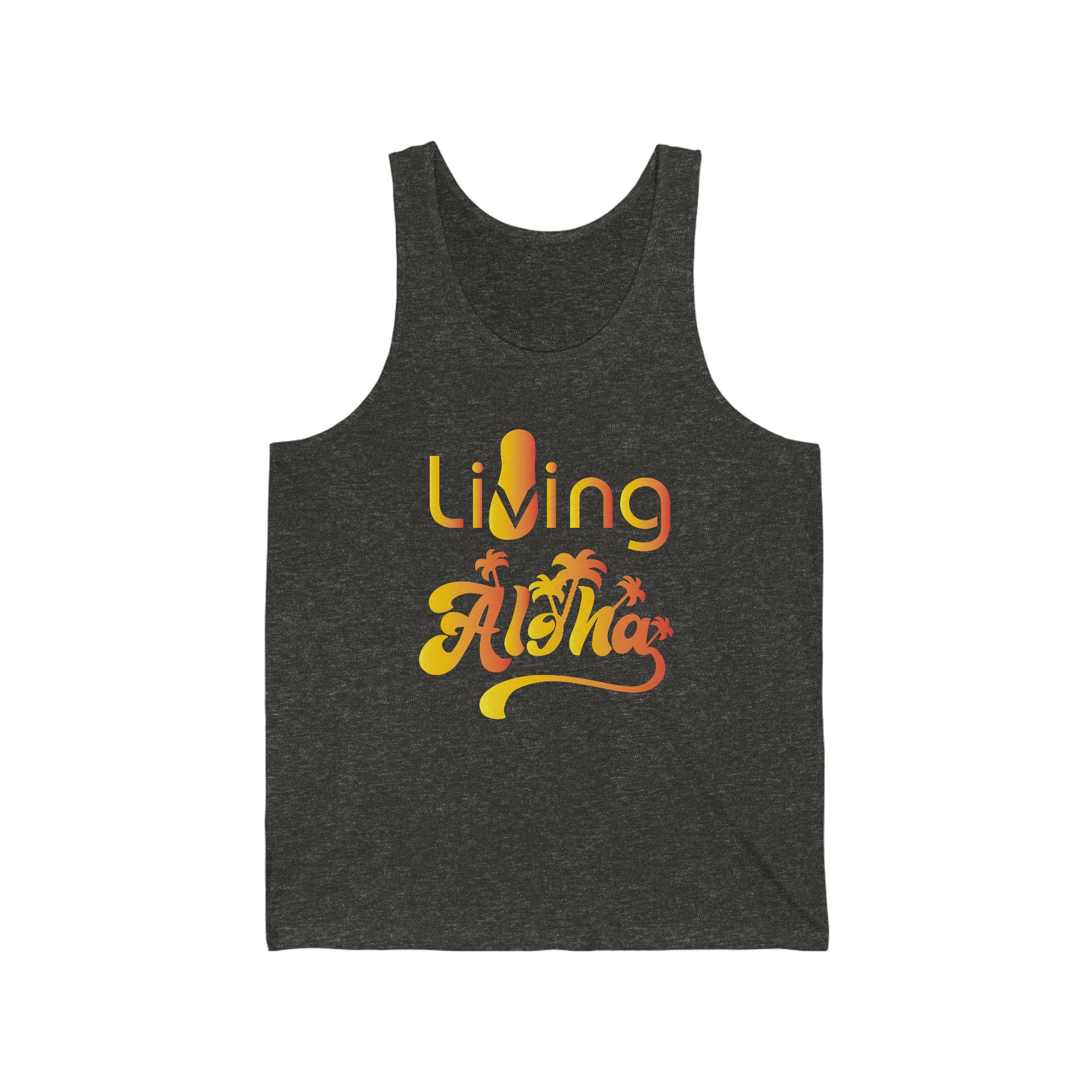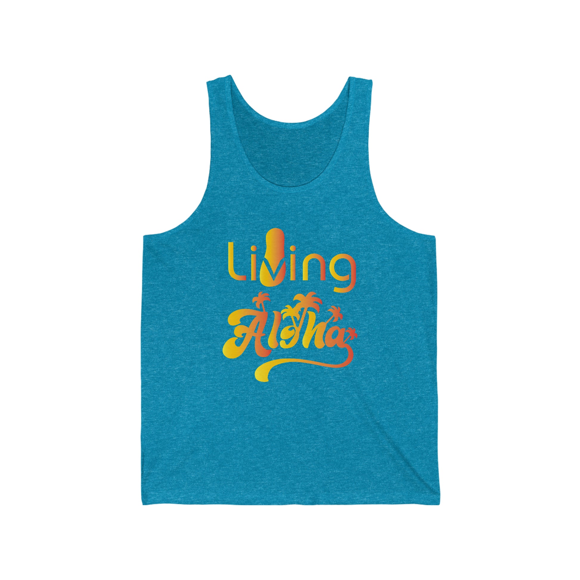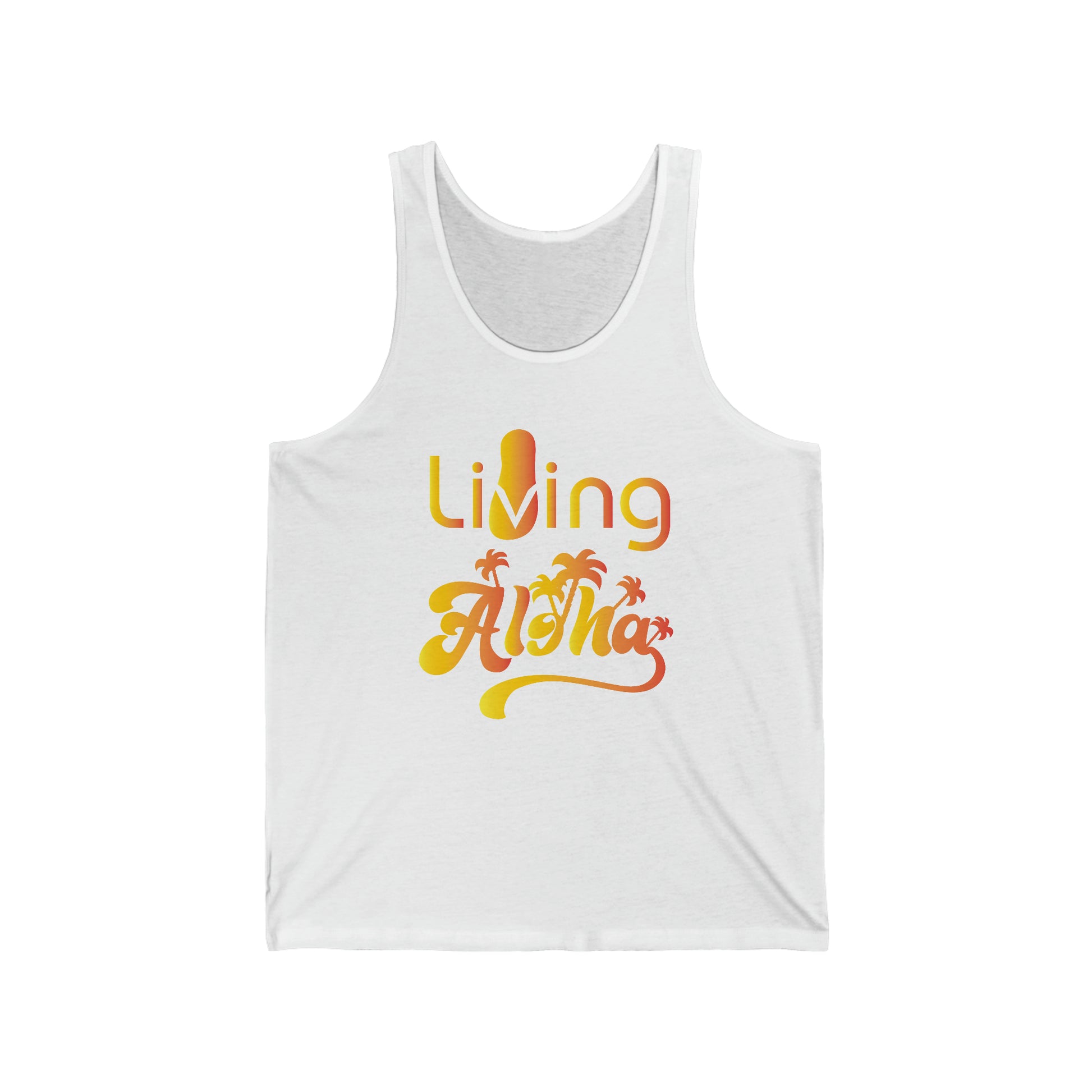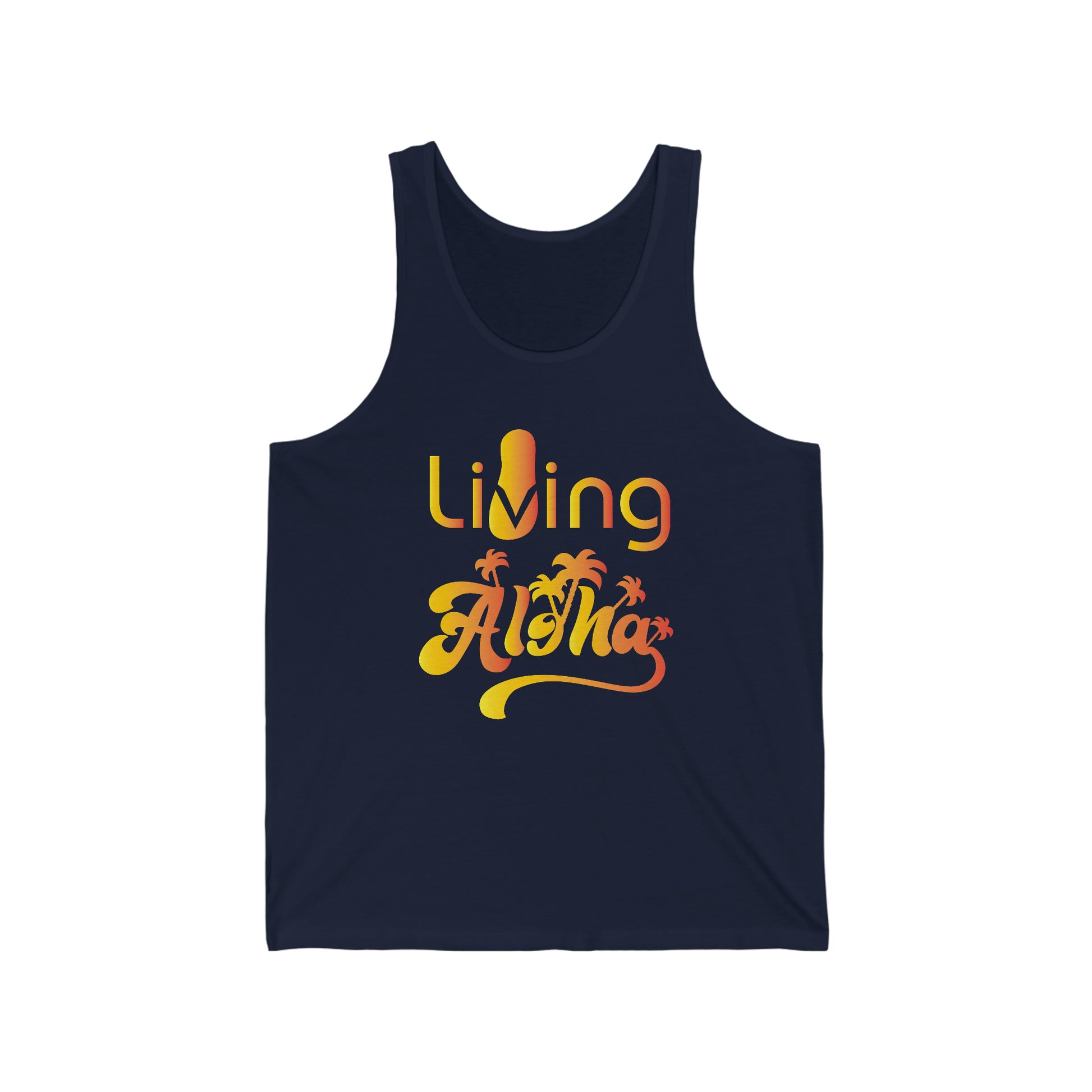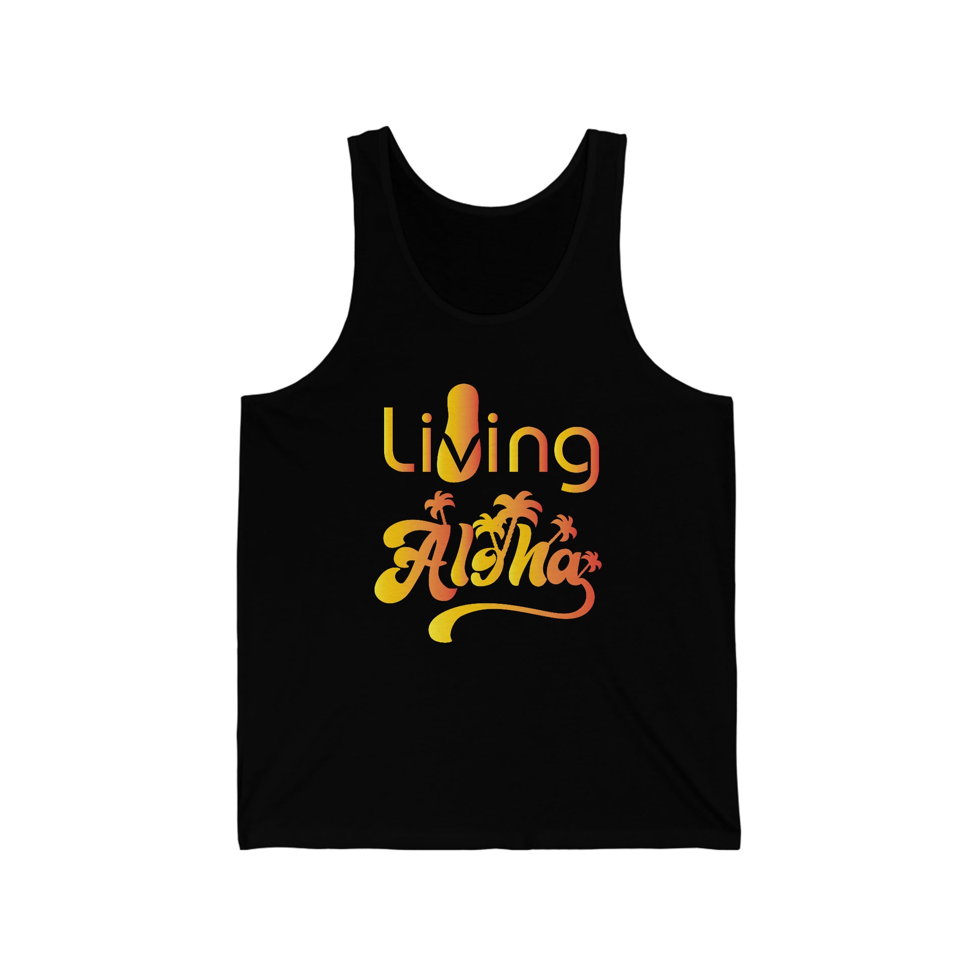 Brimming with island charm, this "Living Aloha" tank top evokes a laid-back Hawaiian vibe. A playful flip flop and radiant hibiscus flower design echo the casual beach lifestyle. Effortlessly cool and comfortable, it's the perfect tee for those who embrace the serene, harmonious spirit of 'Aloha' in their everyday lives.