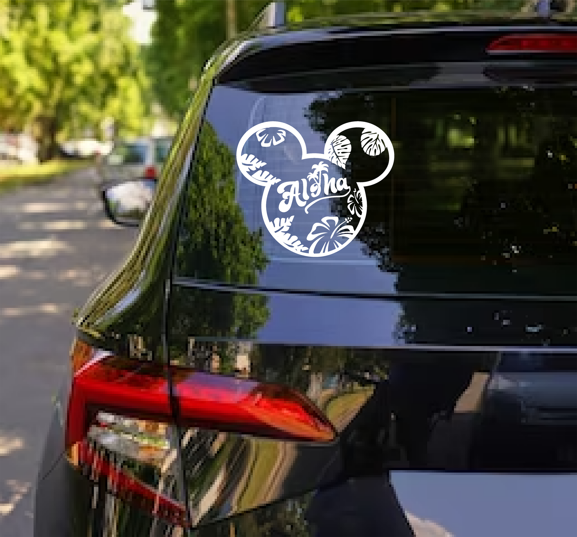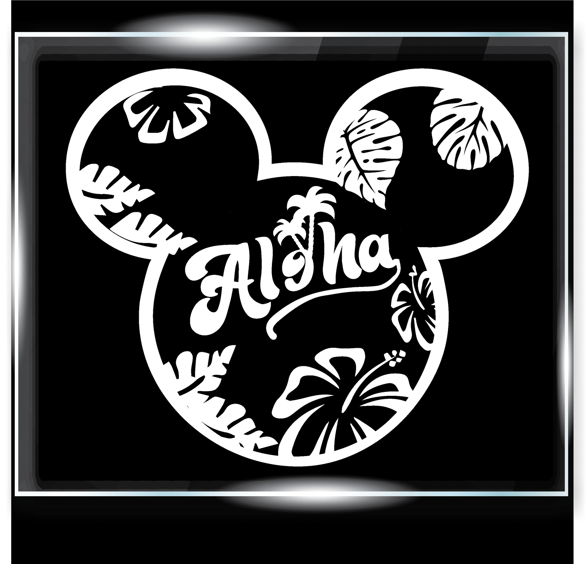 The decal features a silhouette of a mouse's head, filled with vibrant Hawaiian flowers, creating a tropical and playful theme. Within this floral pattern, the word "Aloha" is elegantly integrated, with each letter incorporating palm tree designs. This unique blend of iconic imagery and Hawaiian elements makes for a delightful and eye-catching decal.