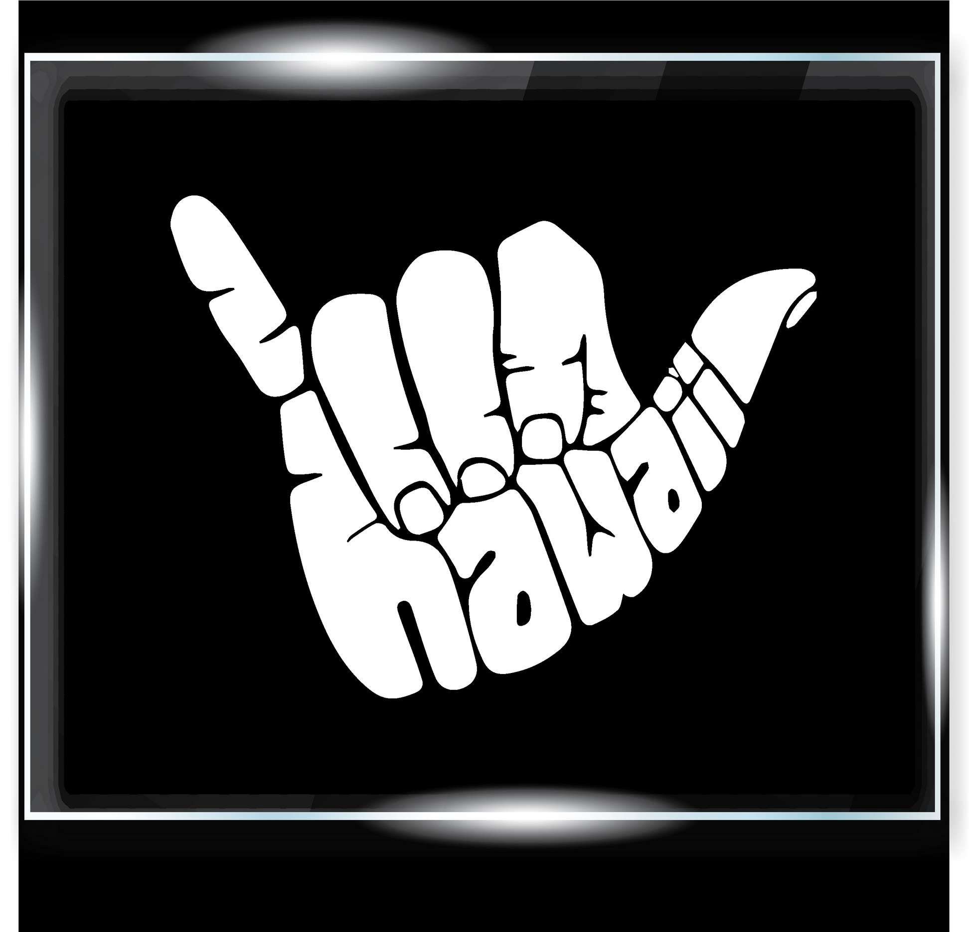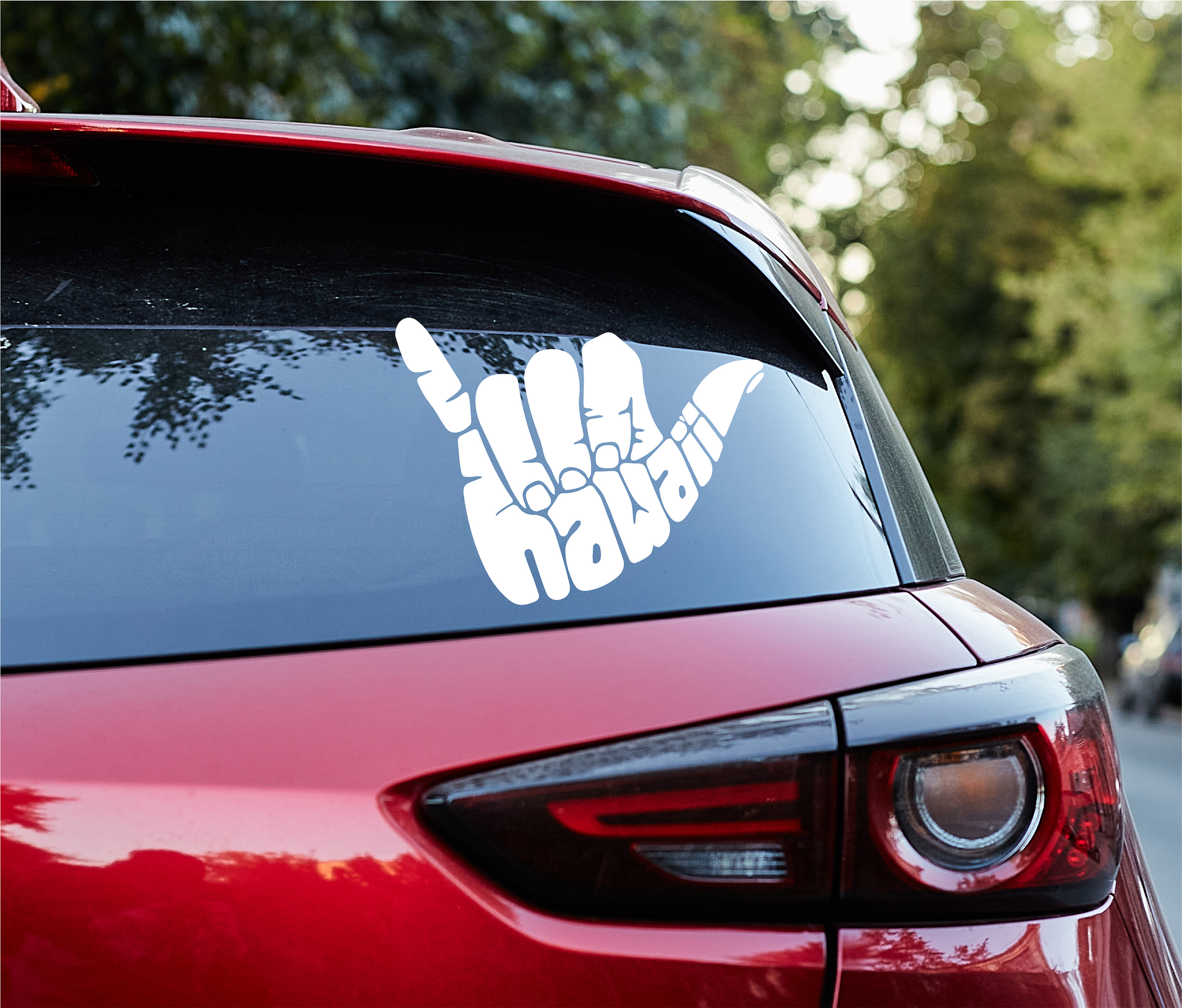 The decal showcases a Hawaiian shaka hand gesture, a symbol of friendly intent and island spirit. In the center of the palm, the word "Hawaii" is elegantly inscribed, blending seamlessly with the lines of the hand. The overall design captures the essence of Hawaiian culture and hospitality, making it a perfect emblem for lovers of the Aloha State.