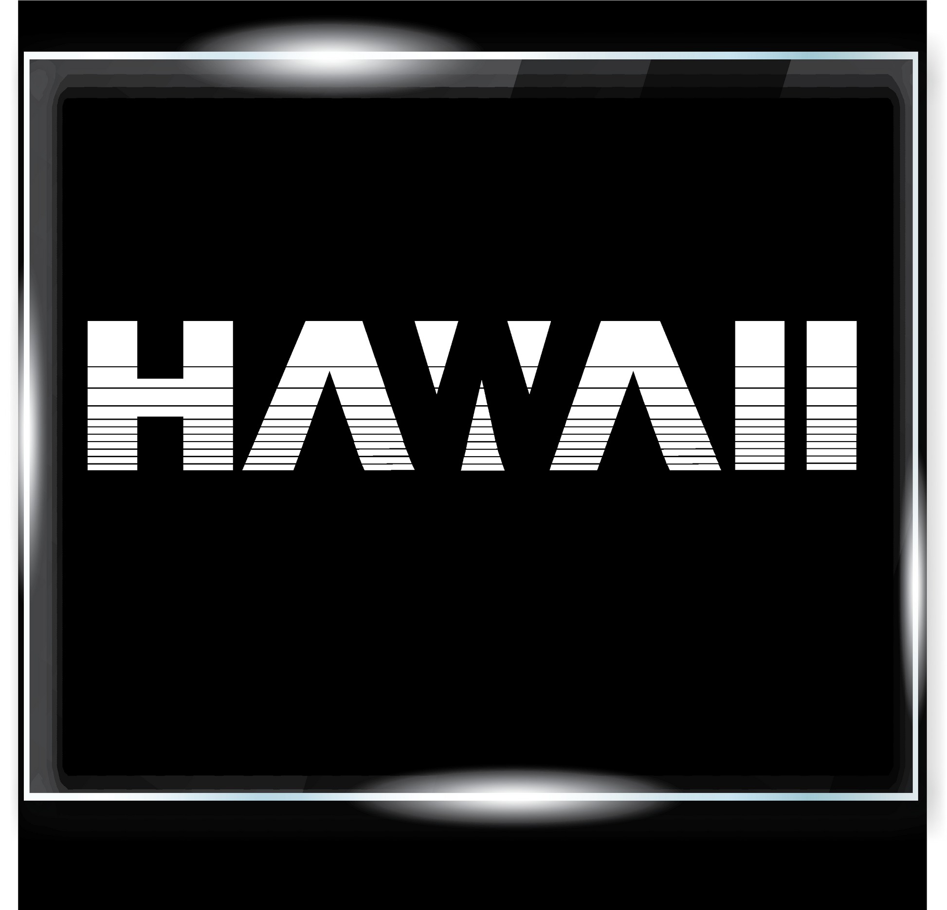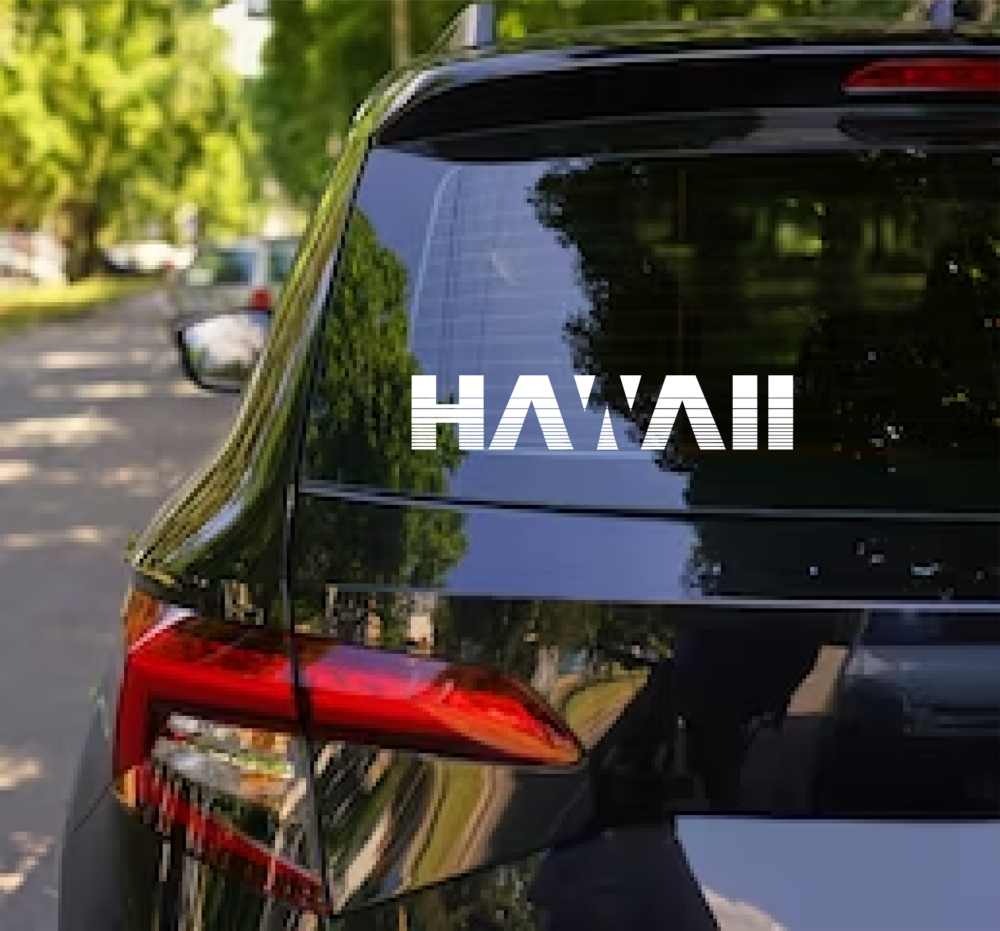 The decal displays the word "Hawaii" in a modern, stylish way, with each letter featuring bold, horizontal stripes. The stripes add a contemporary and dynamic feel to the design, enhancing the visual appeal. The overall look is chic and fresh, making it a perfect emblem for the vibrant and modern spirit of Hawaii.