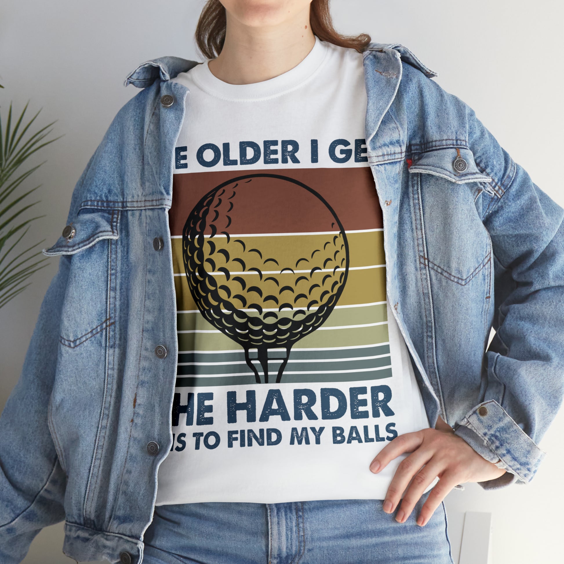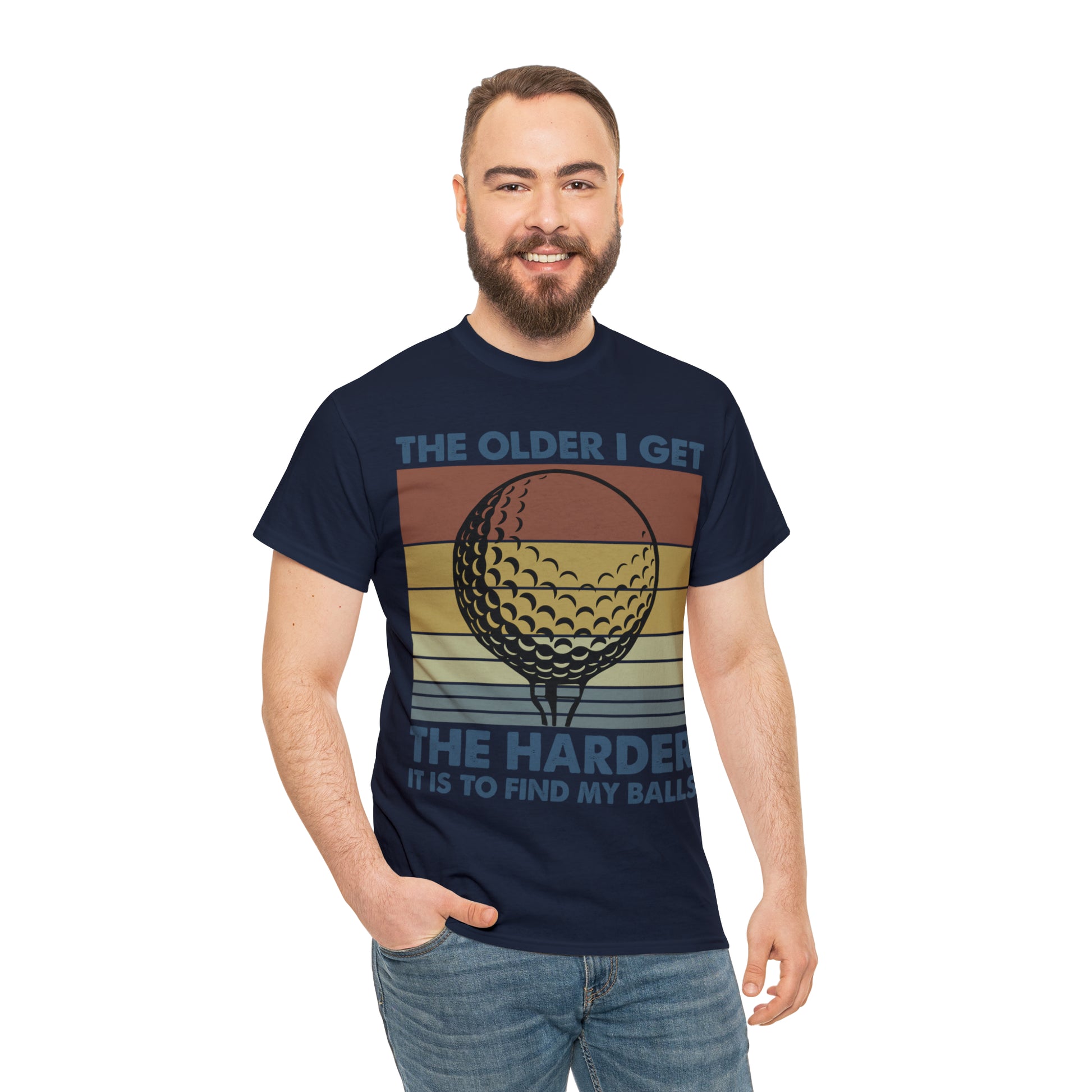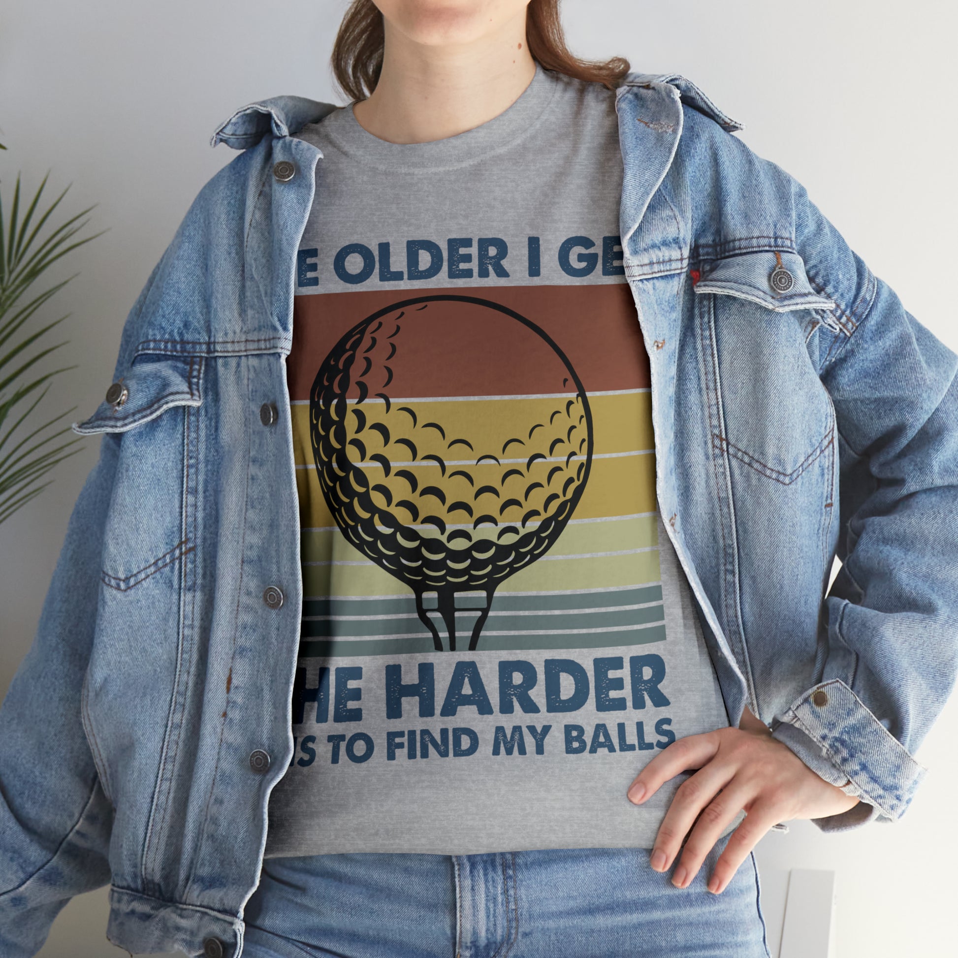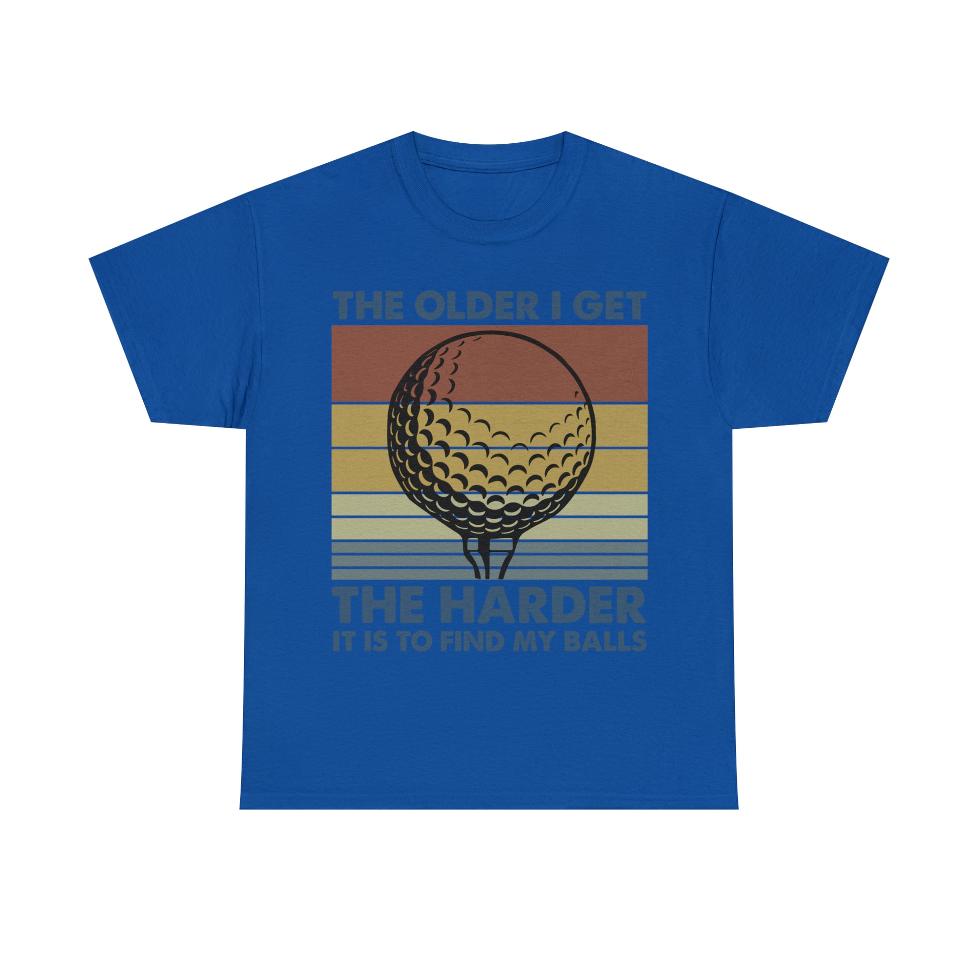 Adding a humorous twist to the trials of aging and golfing, this vintage-style "The Older I Get the Harder it Gets to Find My Balls" t-shirt is a light-hearted gem. With a prominent golf ball design, it playfully captures the often-relatable challenges of spotting golf balls in play. Comfortable and attention-grabbing, this tee is perfect for the seasoned golfer who embraces both the joys and jests of the game, celebrating the amusing side of maturity.