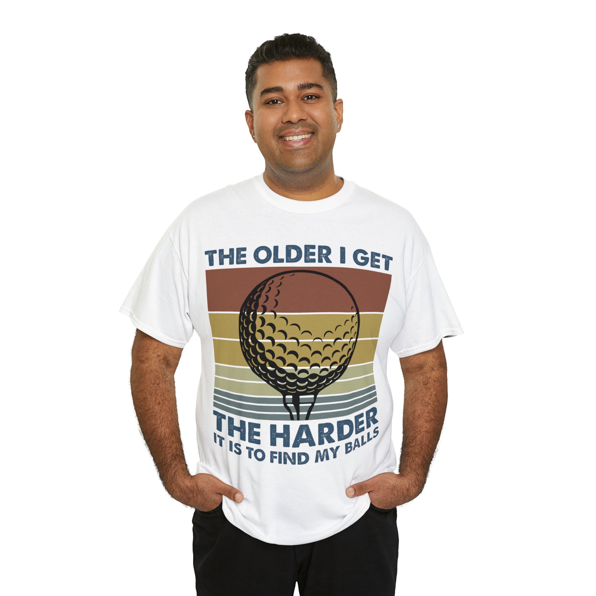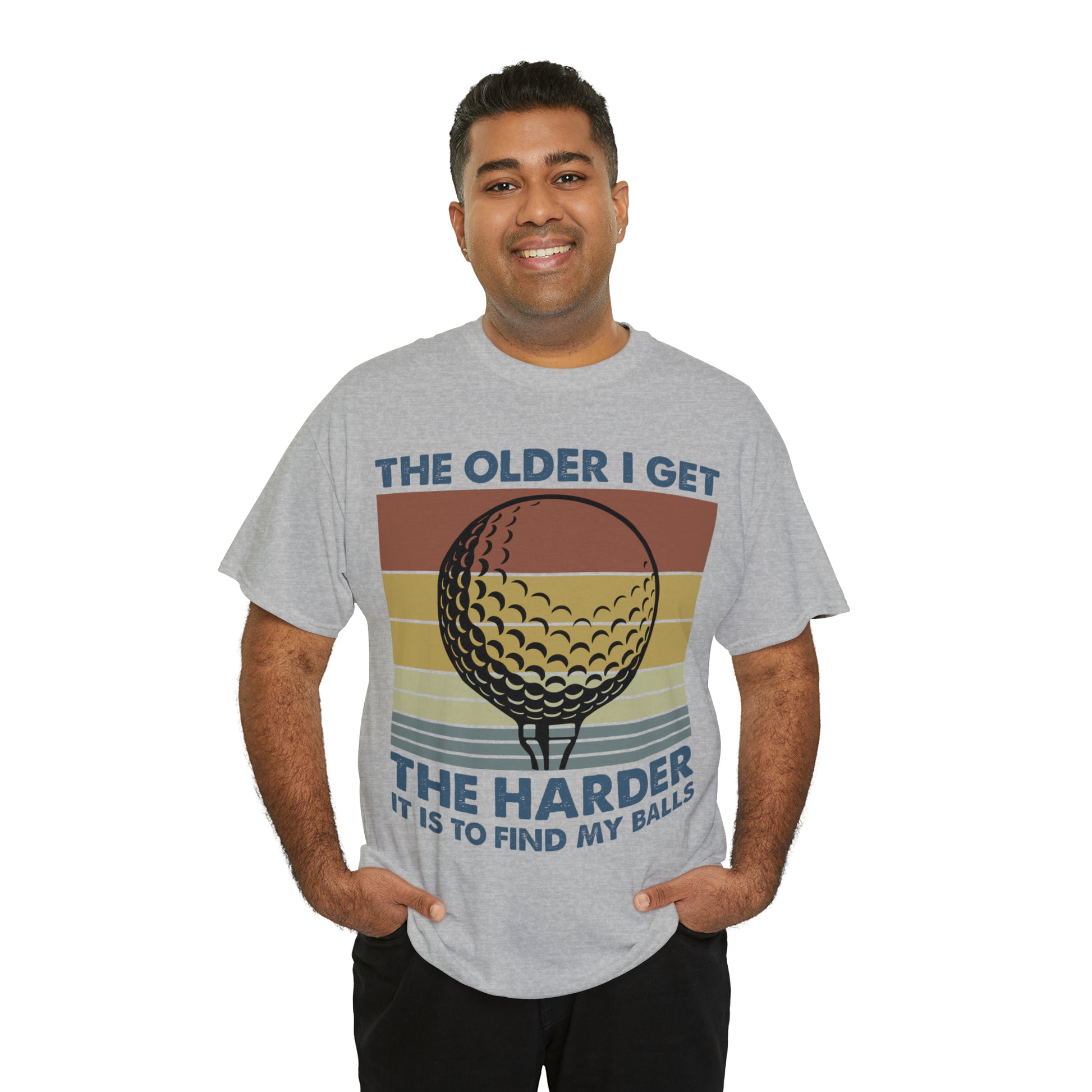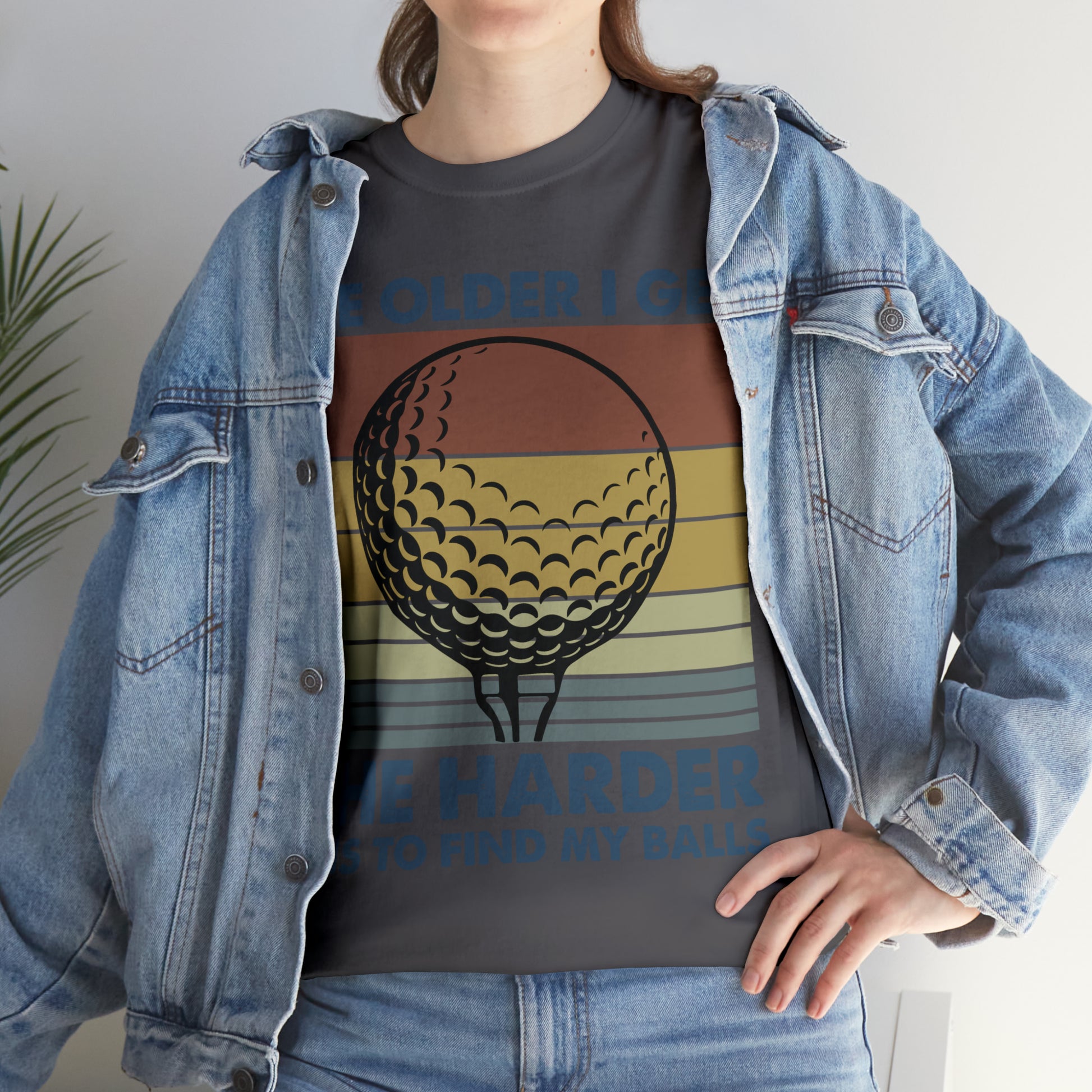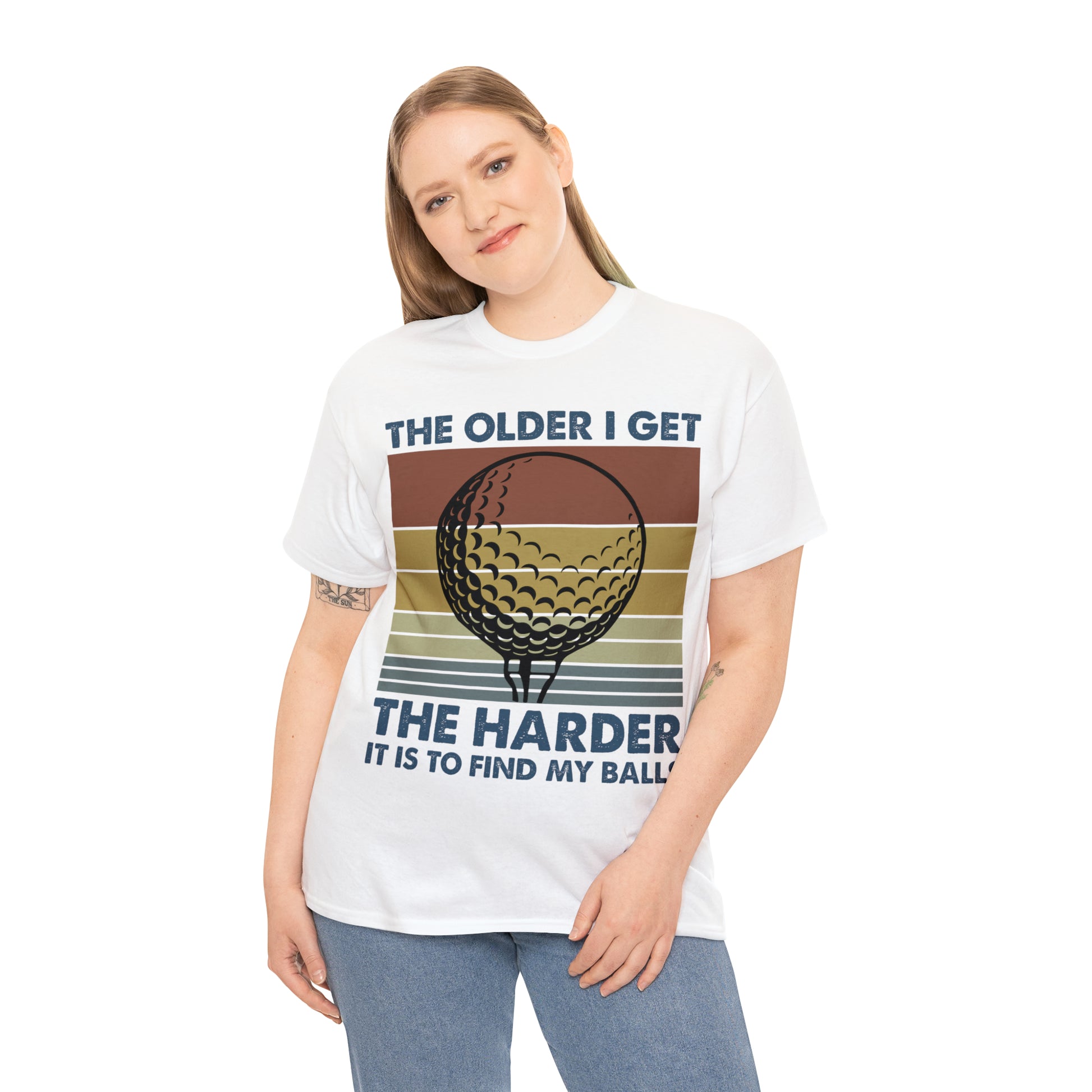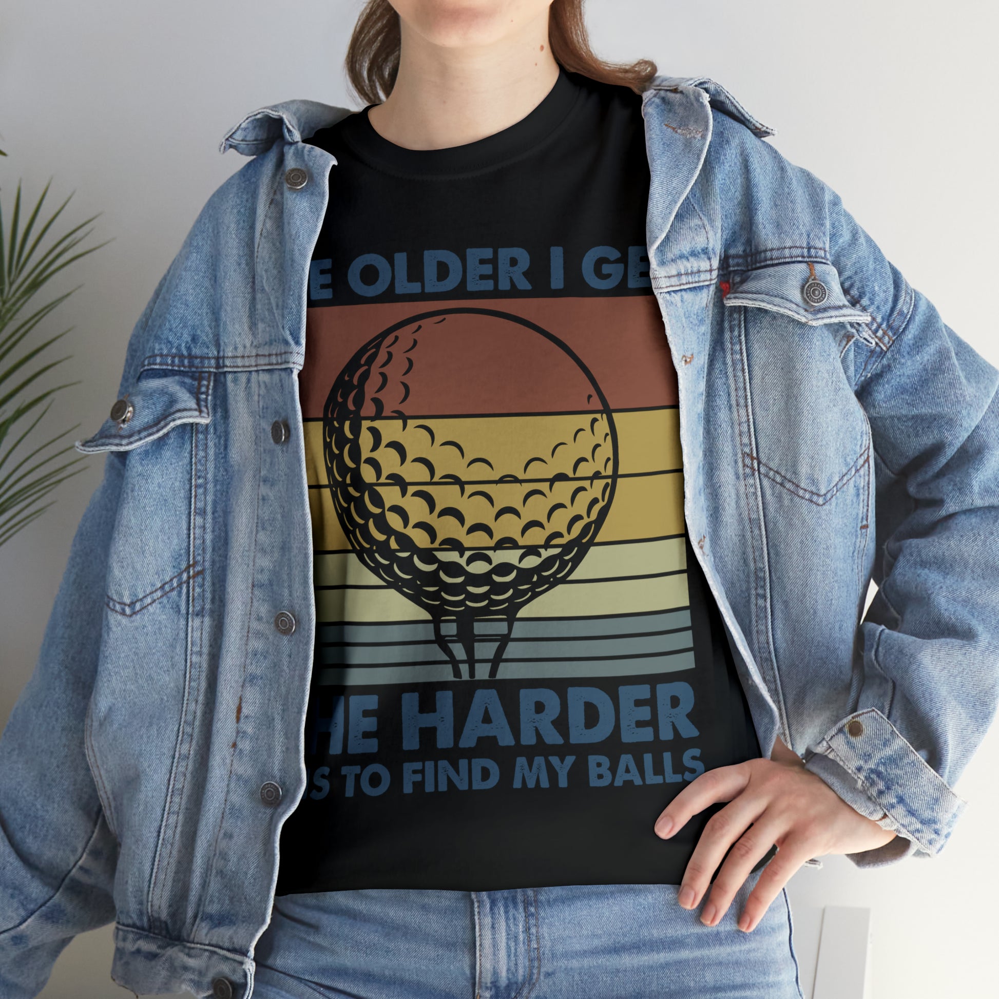 Adding a humorous twist to the trials of aging and golfing, this vintage-style "The Older I Get the Harder it Gets to Find My Balls" t-shirt is a light-hearted gem. With a prominent golf ball design, it playfully captures the often-relatable challenges of spotting golf balls in play. Comfortable and attention-grabbing, this tee is perfect for the seasoned golfer who embraces both the joys and jests of the game, celebrating the amusing side of maturity.