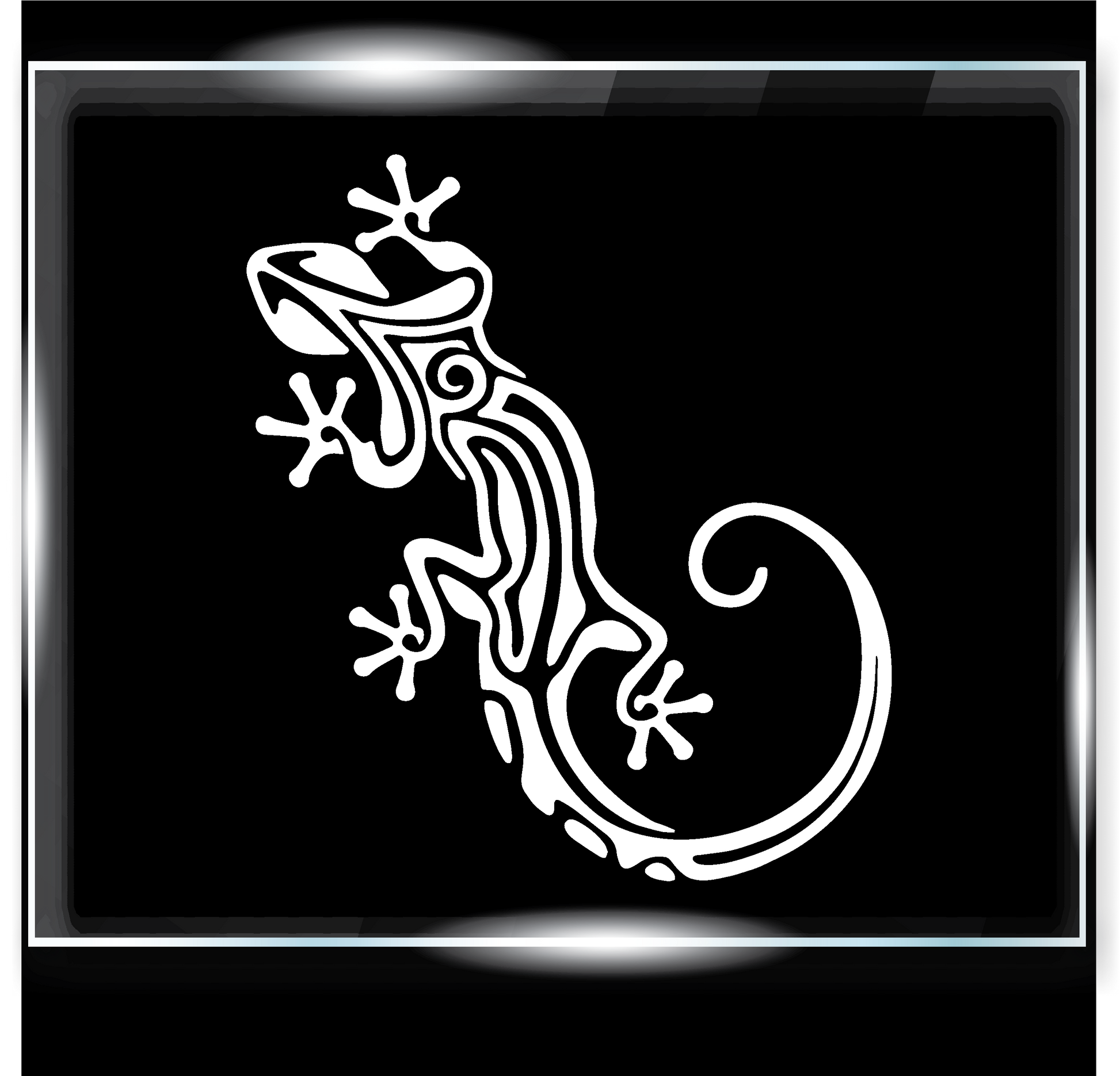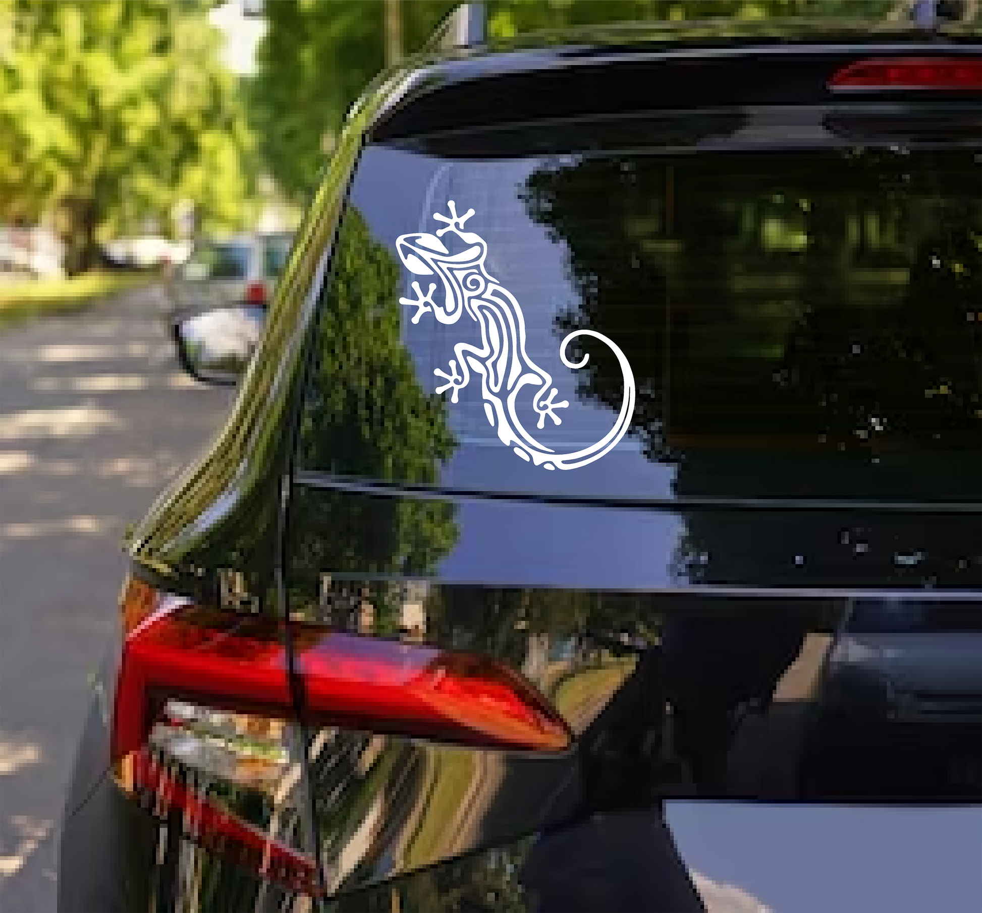 The decal features a tribal-style gecko, artistically rendered with intricate patterns and bold lines typical of tribal art. The gecko is depicted in a dynamic pose, symbolizing agility and adaptability. The design allows it to stand out strikingly against any car color, making it a unique and eye-catching addition.