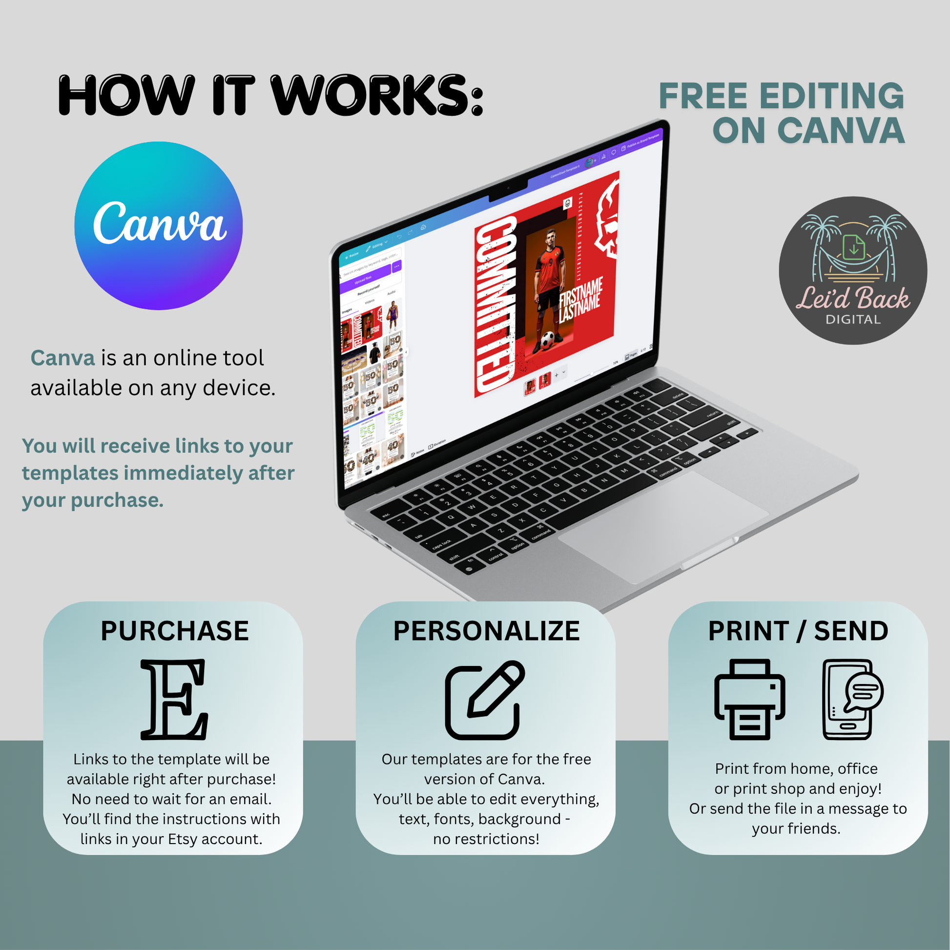 Celebrate your athlete's big moment with these College Commitment Announcement Templates for Athletes, they are all fully editable Canva digital download designed for their sports signing day celebration. These modern and bold designs are perfect for showcasing your athlete’s name, university, and team colors, making it ideal for Instagram, Facebook, and print. Whether it’s for soccer, football, basketball, or volleyball, this template offers a professional and polished way to announce a college commitment. Simply upload your photo, edit the text, and you're ready to share. No design experience needed—just a free Canva account!