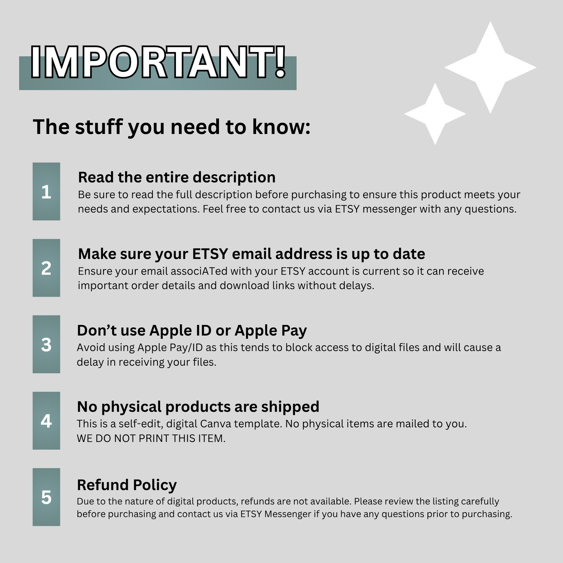 Edit your template in Canva within minutes of purchase — no subscription needed! All wording, fonts, colors, and backgrounds are fully editable. You can also upload your own photos to personalize your design.